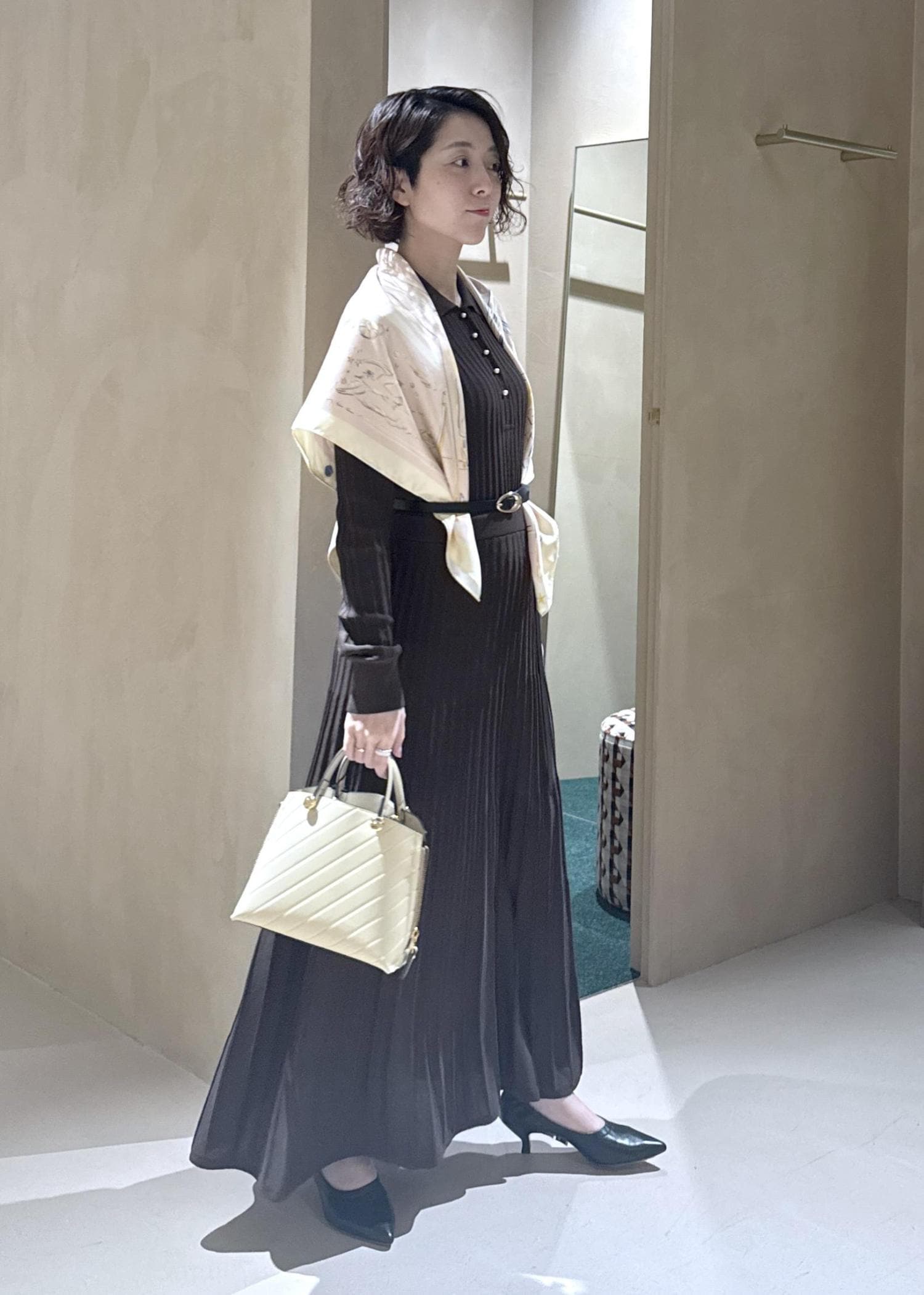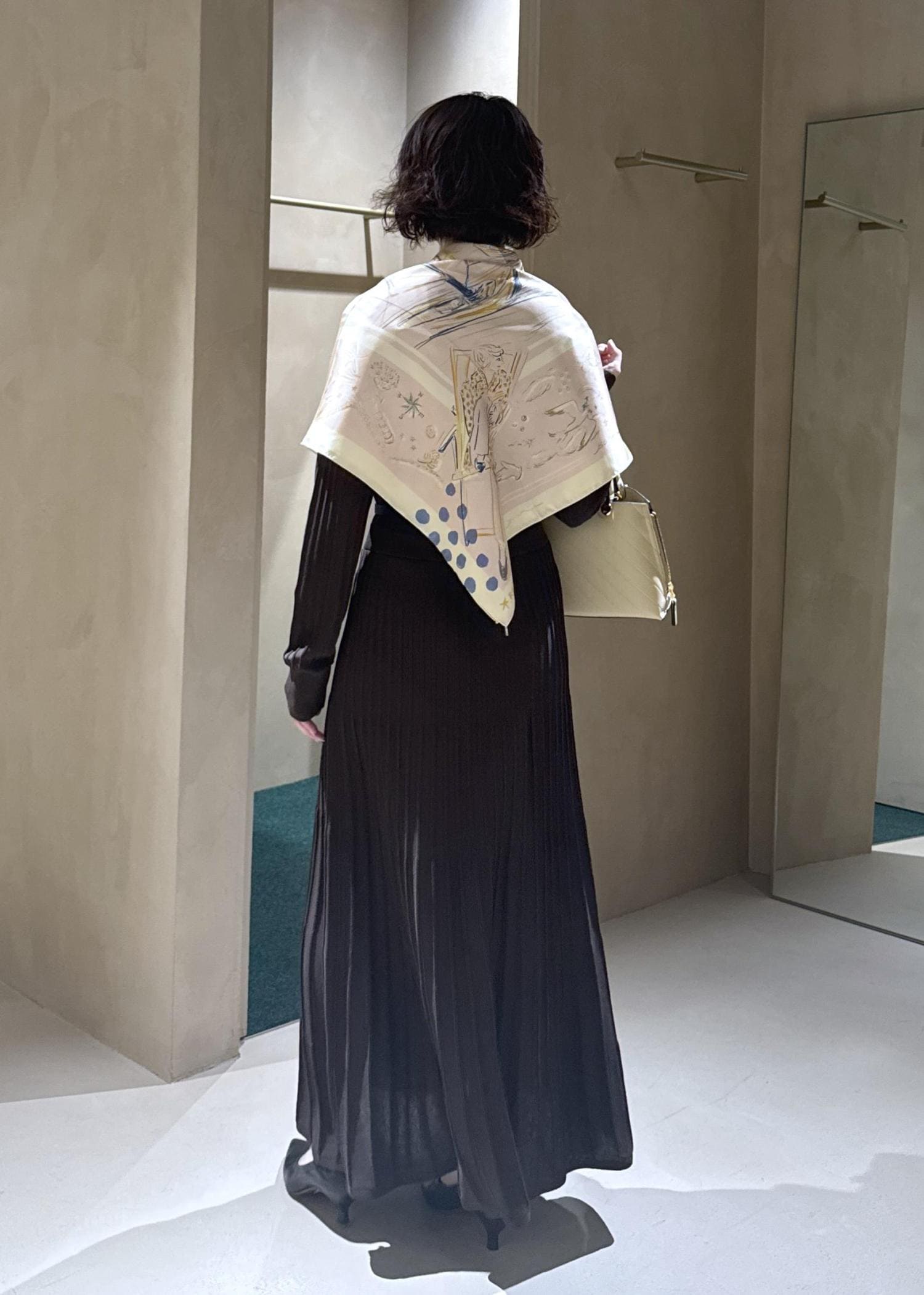 スカーフで上半身に少しボリュームを足してスタイルアップと華やかさアップしました。