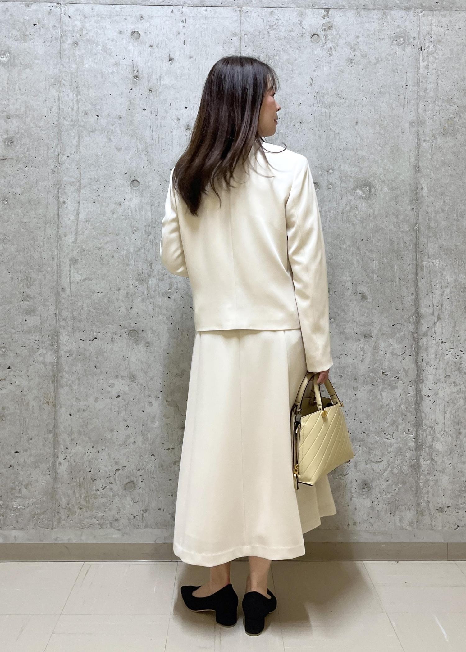 同素材のワンピースとジャケットを合わせたキッチリ感のあるスタイルです。