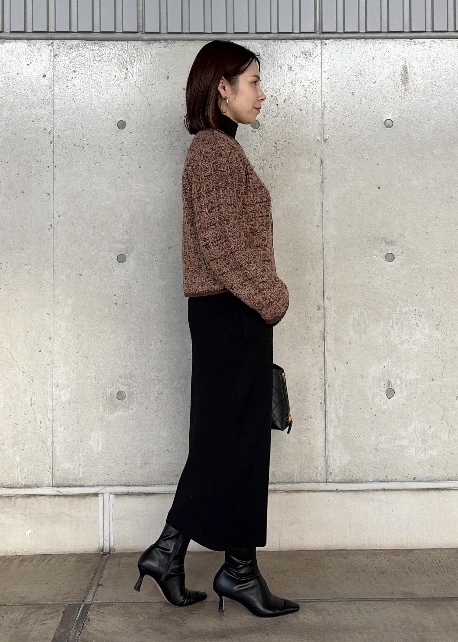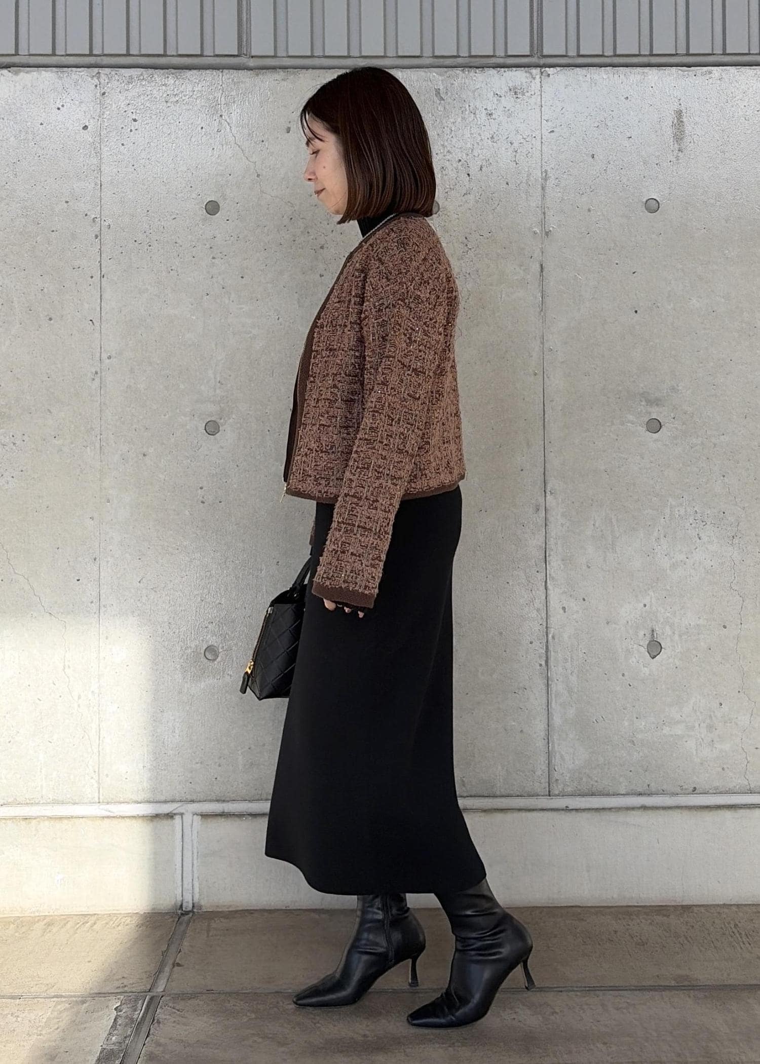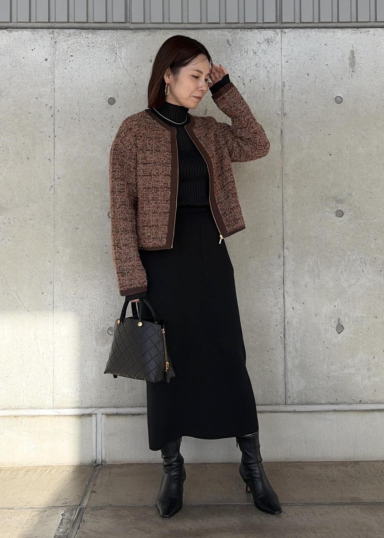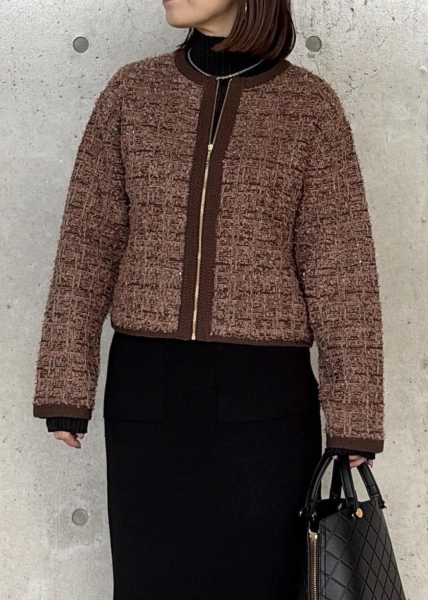 ROPÉツイードZIPノーカラーカーディガン/イージーケアブラウン系 / F¥25,300レビュー身長156cm、Fサイズ着用。