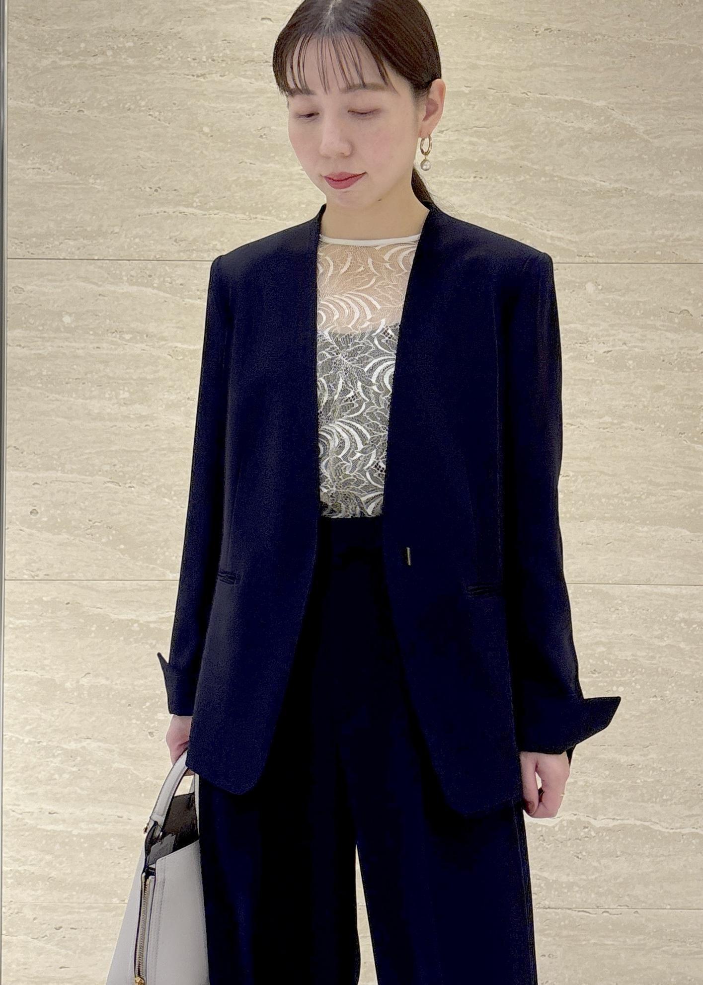 シンプルなジャケットとパンツの組み合わせにさりげなくレースのインナーで華やかさをプラスしました。