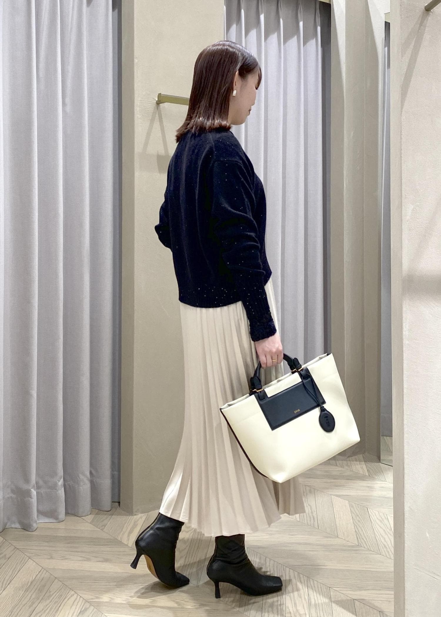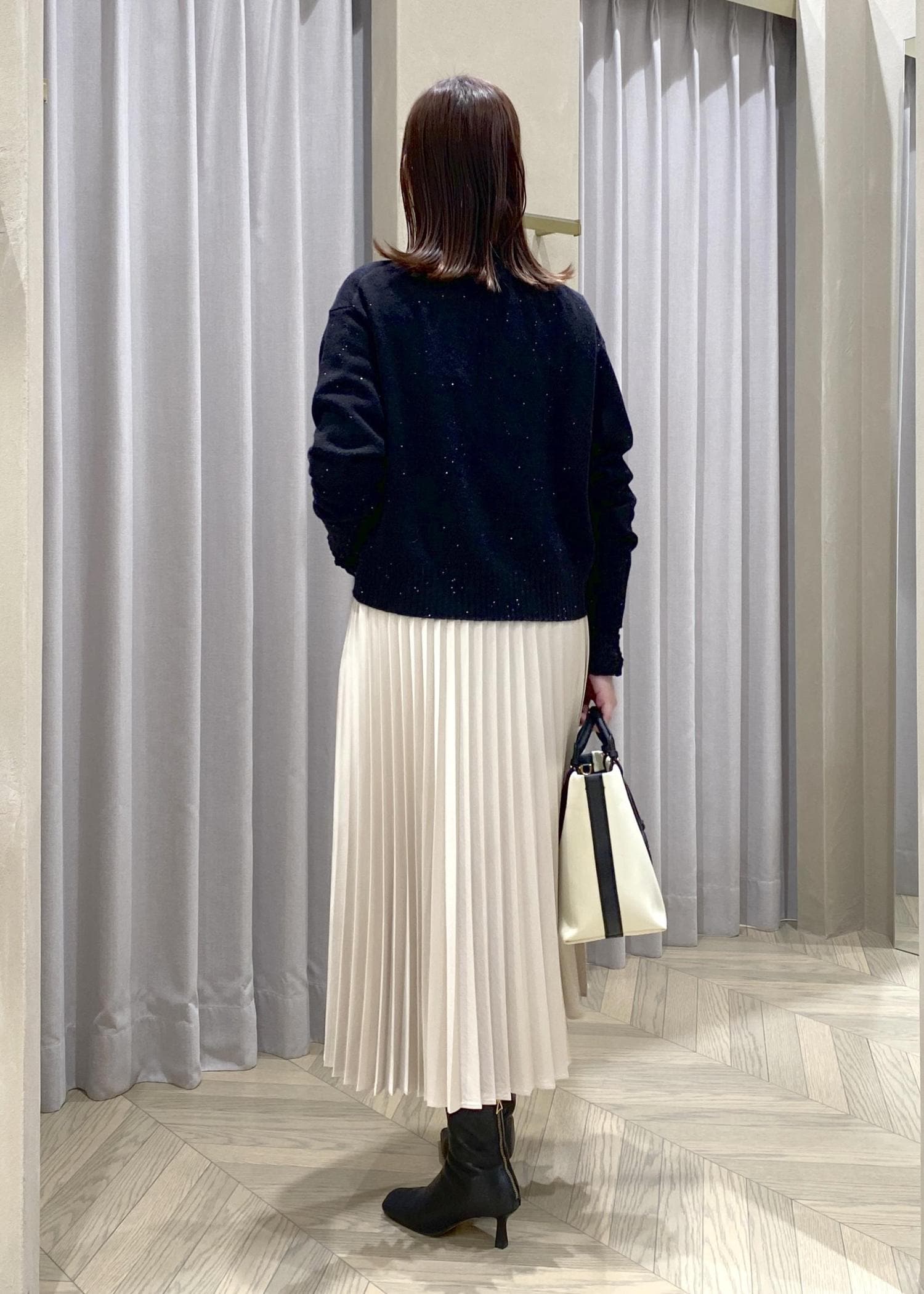 光沢感のあるプリーツスカートで、柔らかみのあるブラックスタイルにしました。