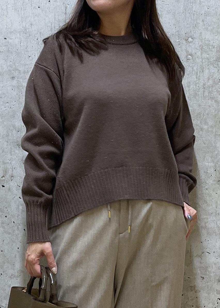 ROPÉスーパーファインメリノウールスパンコールニットブラウン / F¥25,300レビュー前は短めで、後ろはヒップが半分まで隠れる程の丈でした。