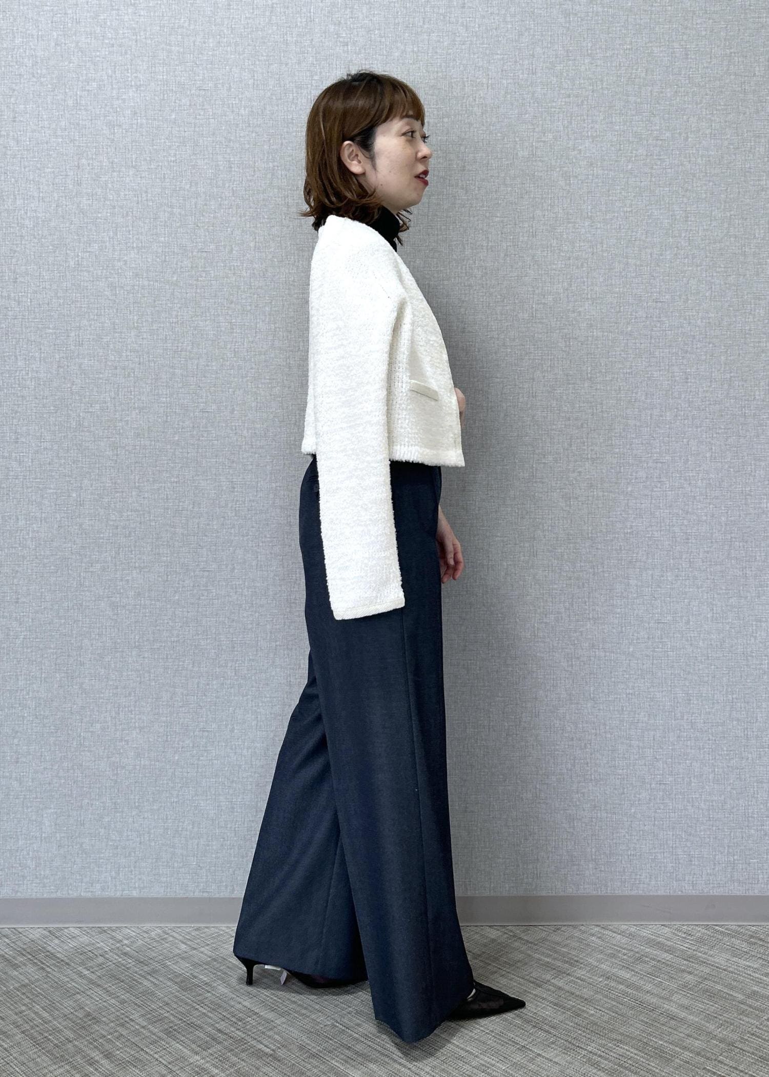 ROPÉツイードニットショート丈カーディガン/イージーケアキナリ / F¥37,400レビュー着丈は腰〜ヒップの上辺り迄の長さです。