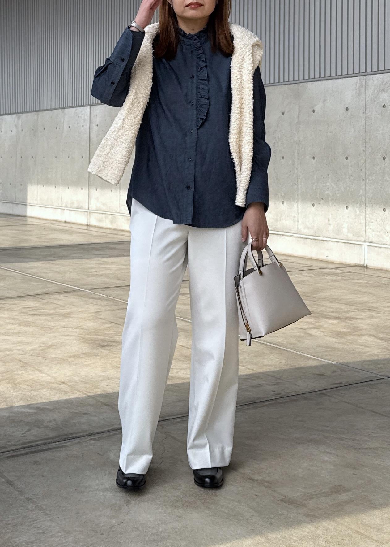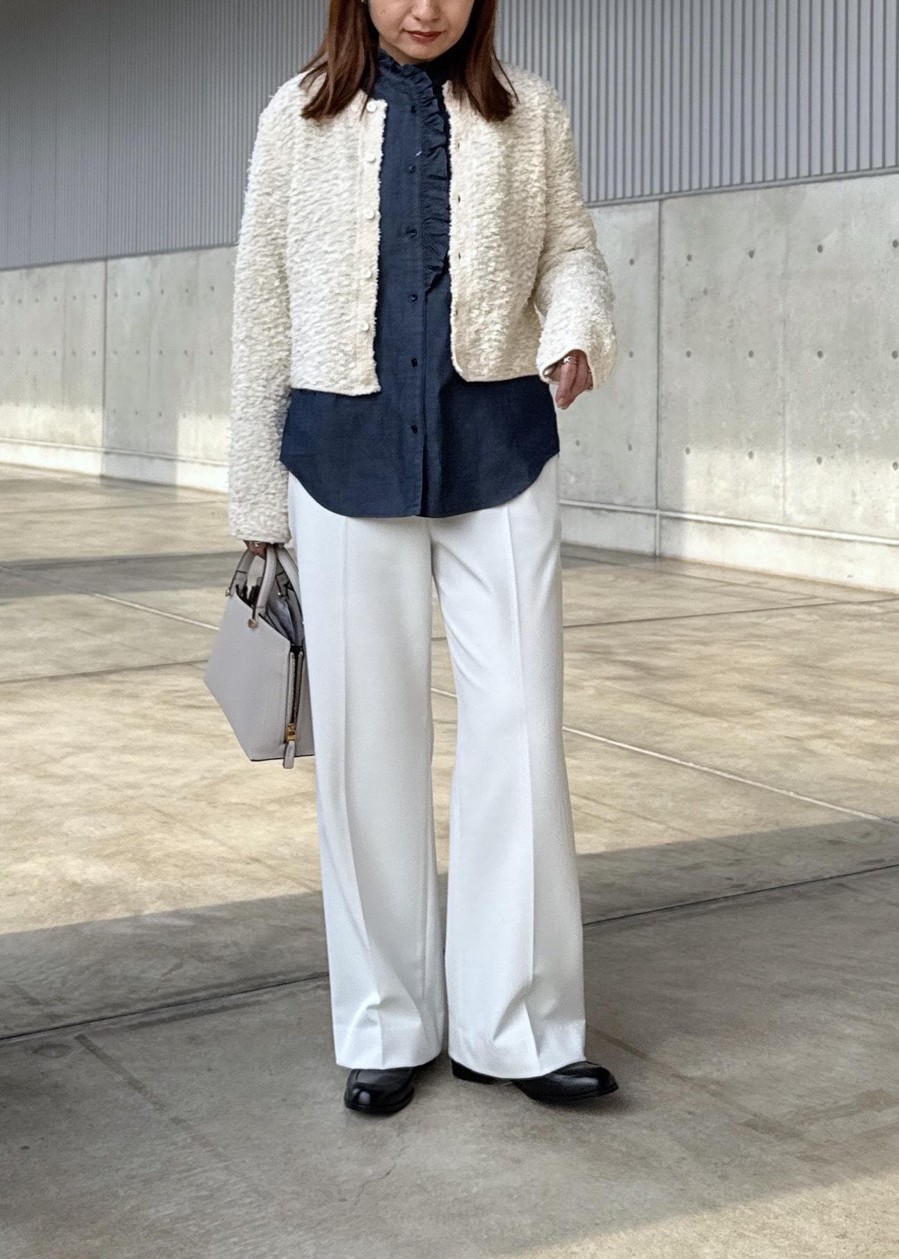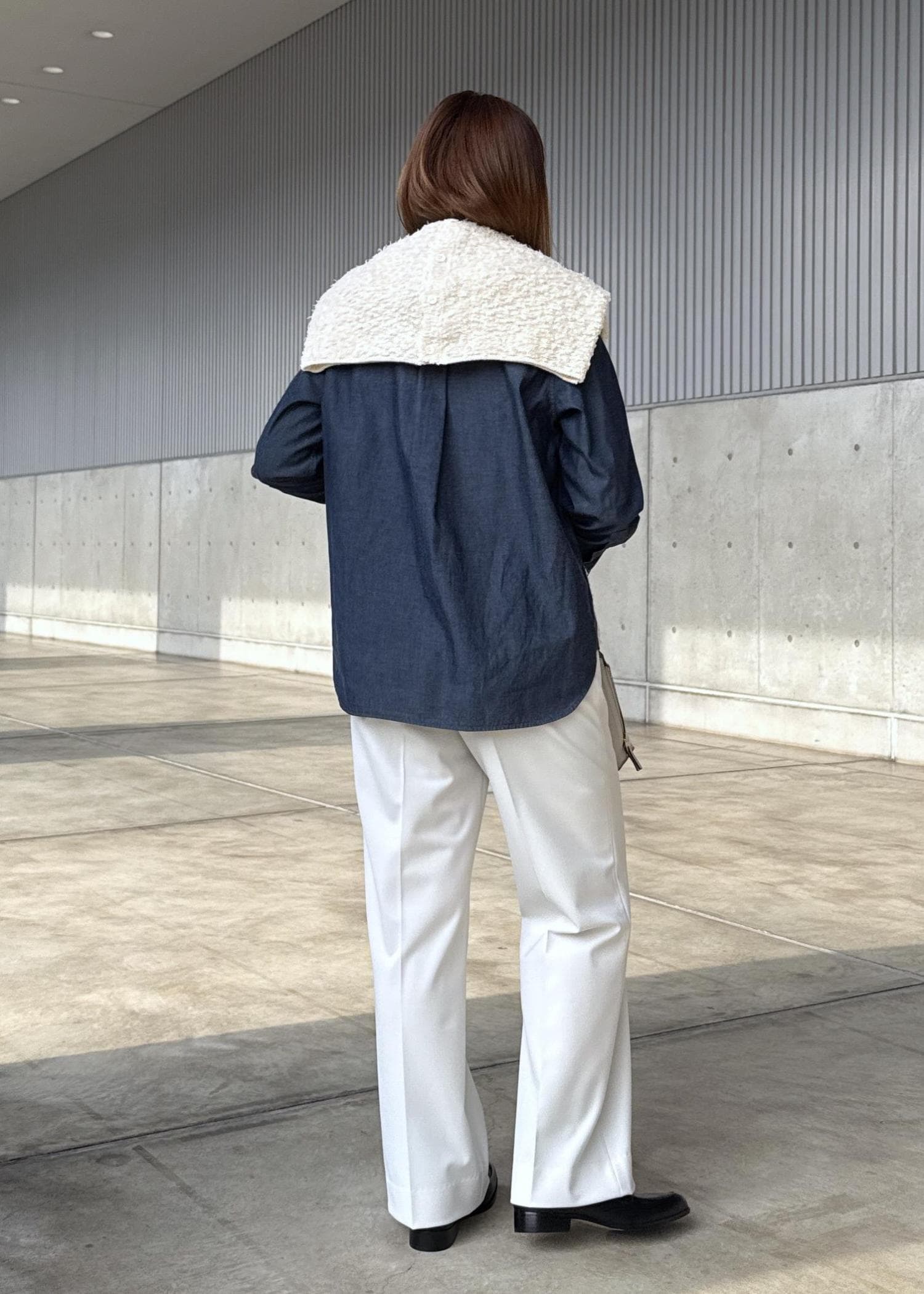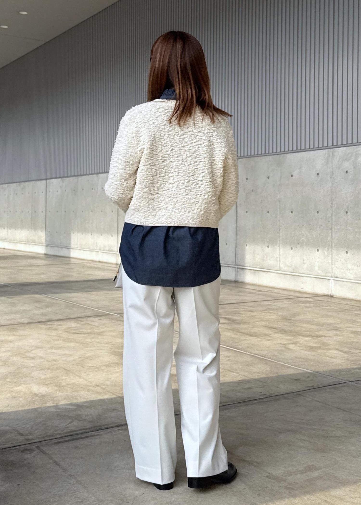 柔らかなデニム地なので、ニットやジャケットのインナー合わせで着ていただきやすいです。