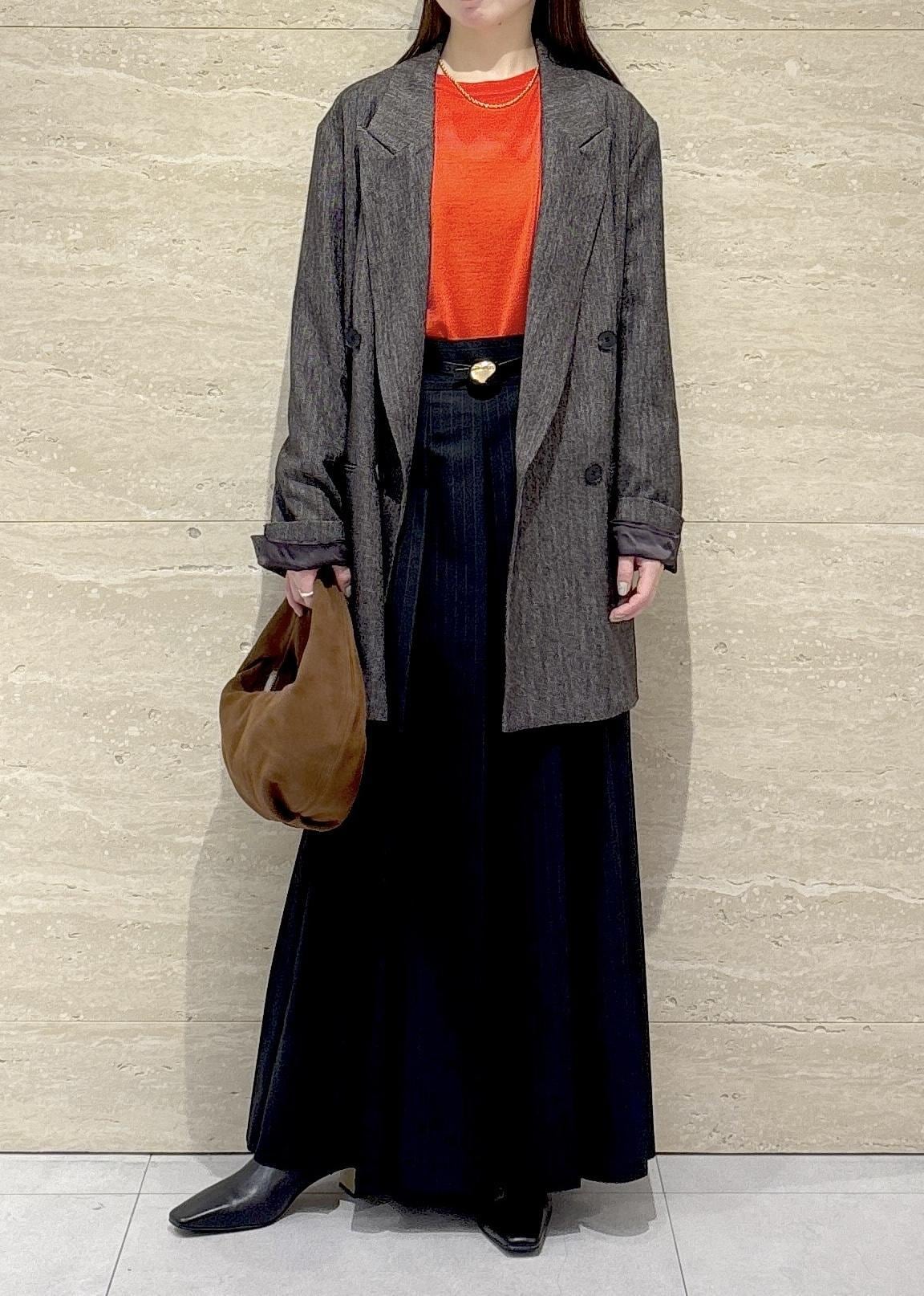 ロングスカートで縦ラインを強調し、程よく抜け感のあるコーデを意識しました。