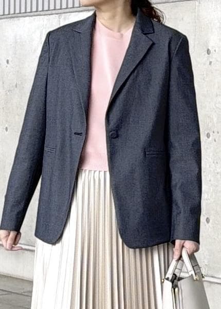 総裏仕立てテーラードジャケットで程よくゆったりとしたシルエットなので少し厚手のインナーも着用しやすいです。同素材のパンツやスカートとのセットアップでも合わせられますが、単品使いもしやすいアイテムです。 -