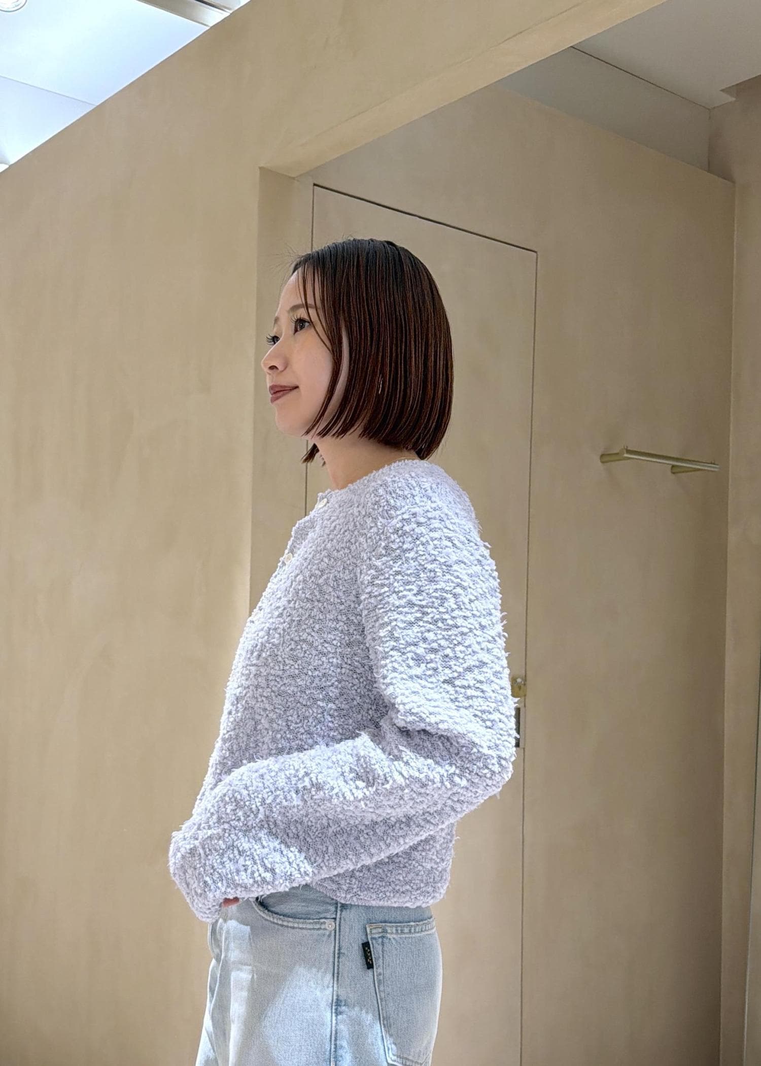ROPÉ SELECT【COOHEM(コーヘン)】 COTTON FANCY YARN KNIT CARDIGANラベンダー系 / F¥36,300レビュー着丈はコンパクトで腰骨にかかるほどです。ハイウエストのボトムとの相性抜群です!とても軽い着心地でボタンをとめてプルオーバーとして着るのもおすすめです◎