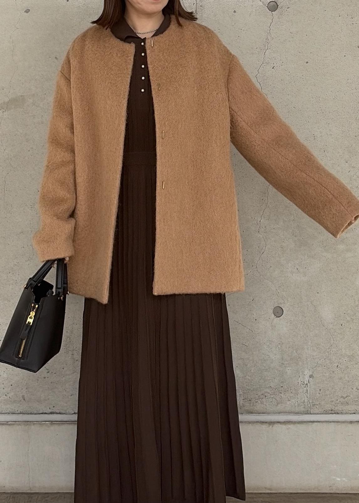 程よいボリューム感が魅力なモヘアは、ノーカラーで顔まわりすっきり。 -