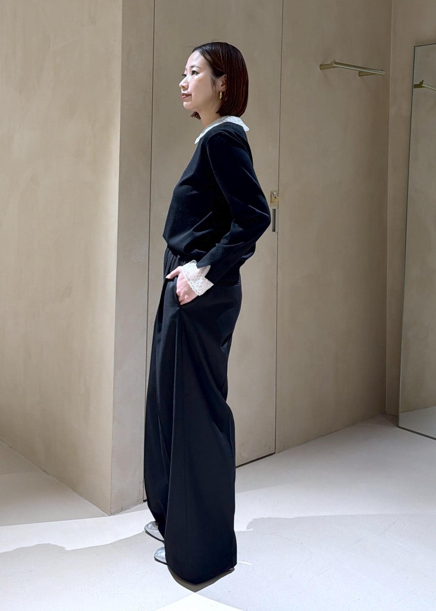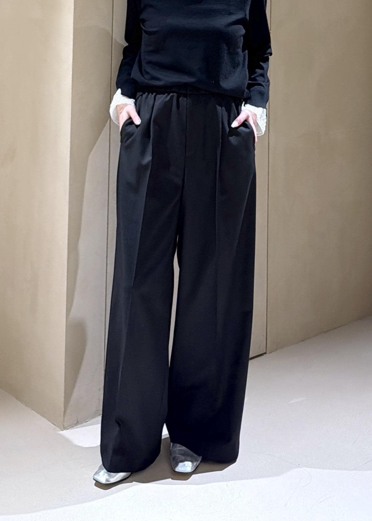 ROPÉトリアセツイル ワンタックイージーワイドパンツ(デニムライク)/イージーケア・セットアップ対応ブラック / 38¥27,500レビュー161cmで38サイズ着用。