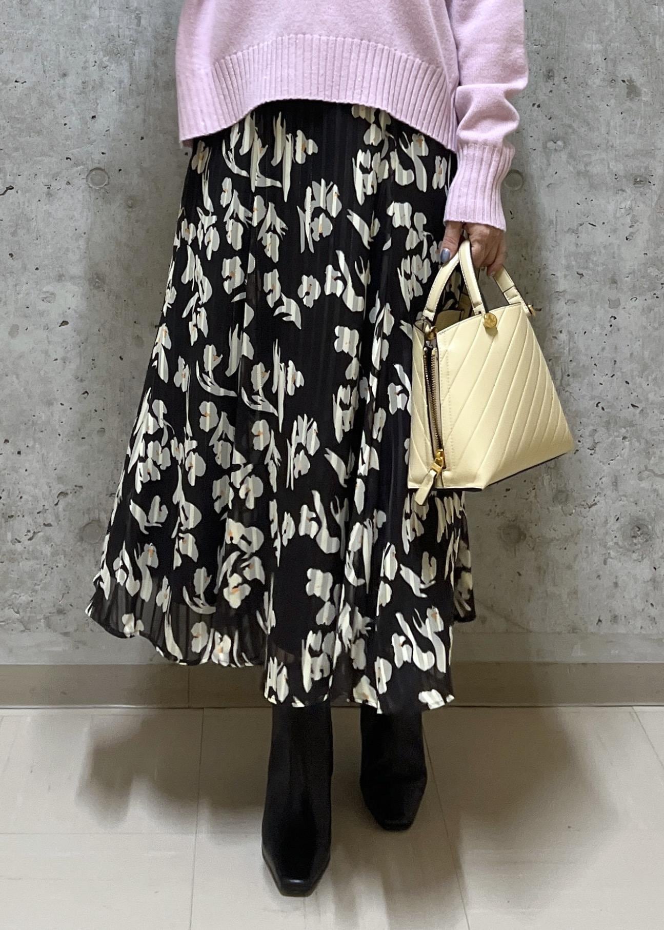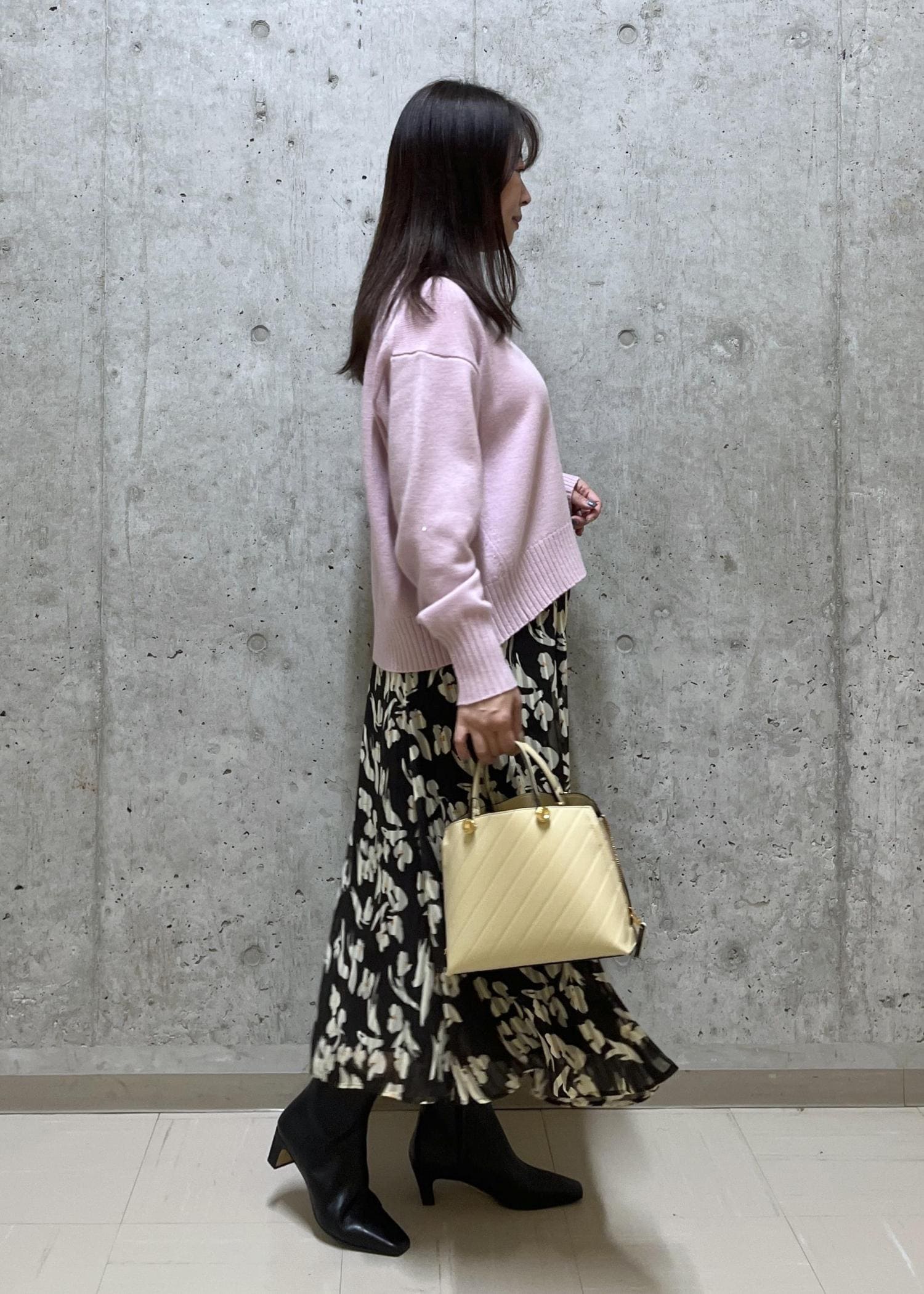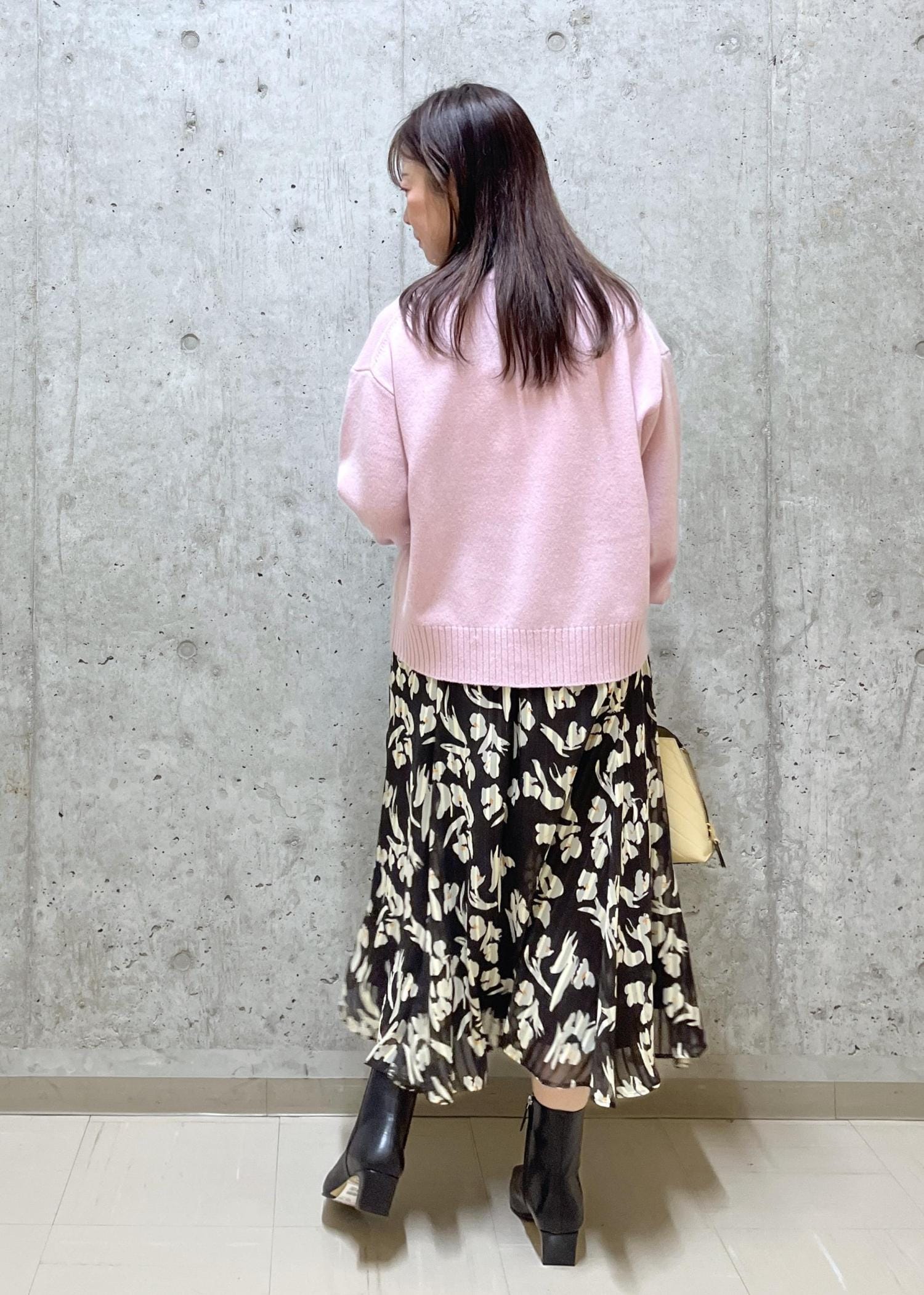 ピンクと花柄のスカートで今から春まで着用できるスタイルです。