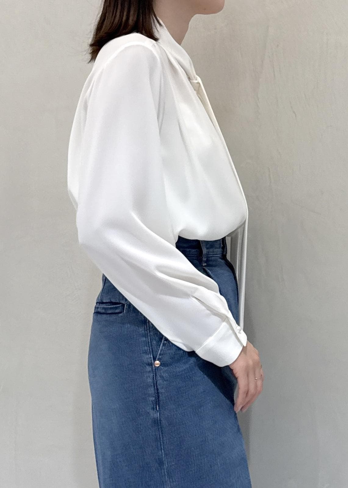 ROPÉボウタイブラウス/イージーケア・26SSホワイト / F¥22,000レビューややゆとりがあるサイズ感で、ヒップにかかる長さです。シワになりにくく、ご自宅でのお洗濯可能。