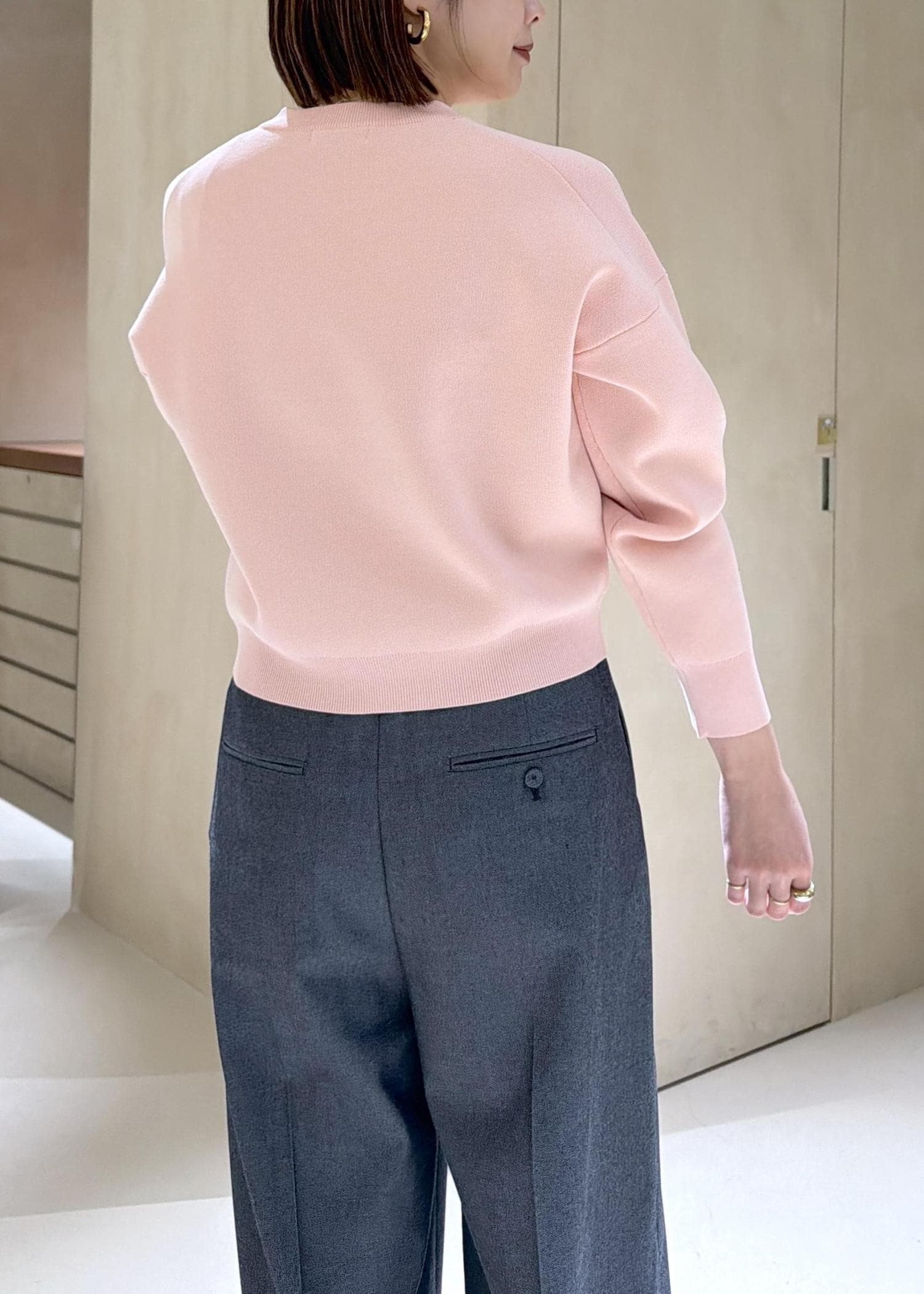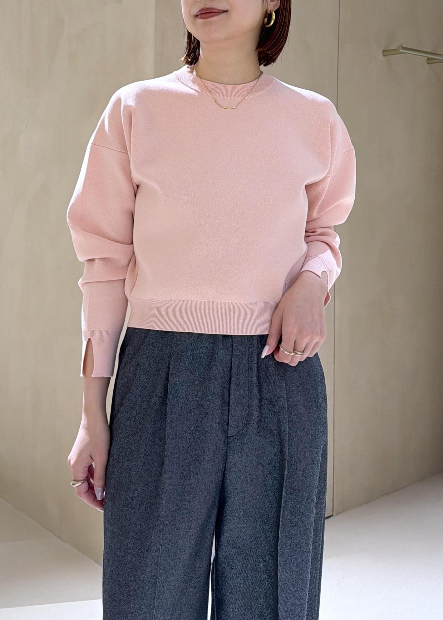 着丈はコンパクトで腰骨かかるほどです。着丈がコンパクトなのでボトムを選ばず合わすことができスウェット風なのでカジュアルすぎずに着ることができます◎袖にスリットが入っているので抜け感もでます! -