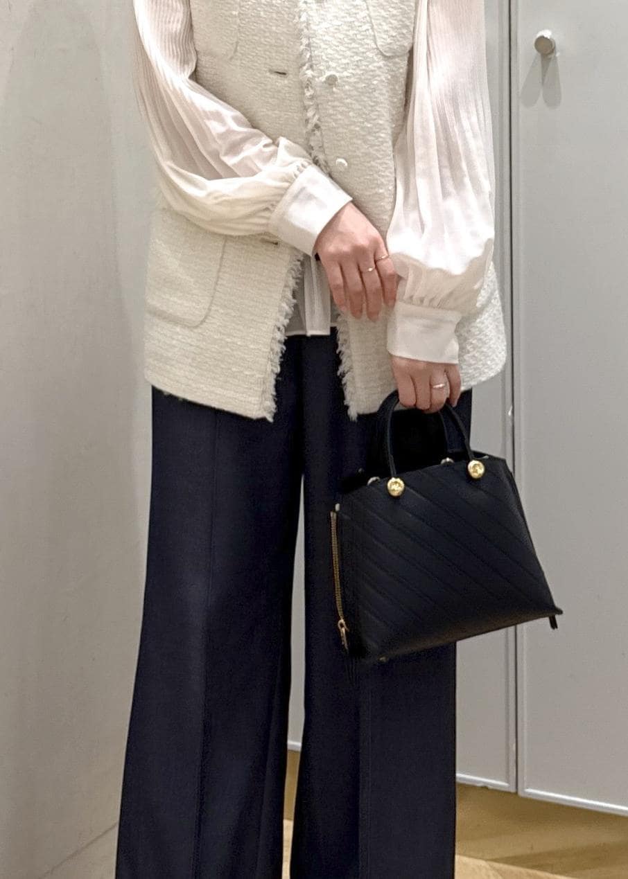 綺麗目なプリーツブラウスにワイドパンツを合わせて