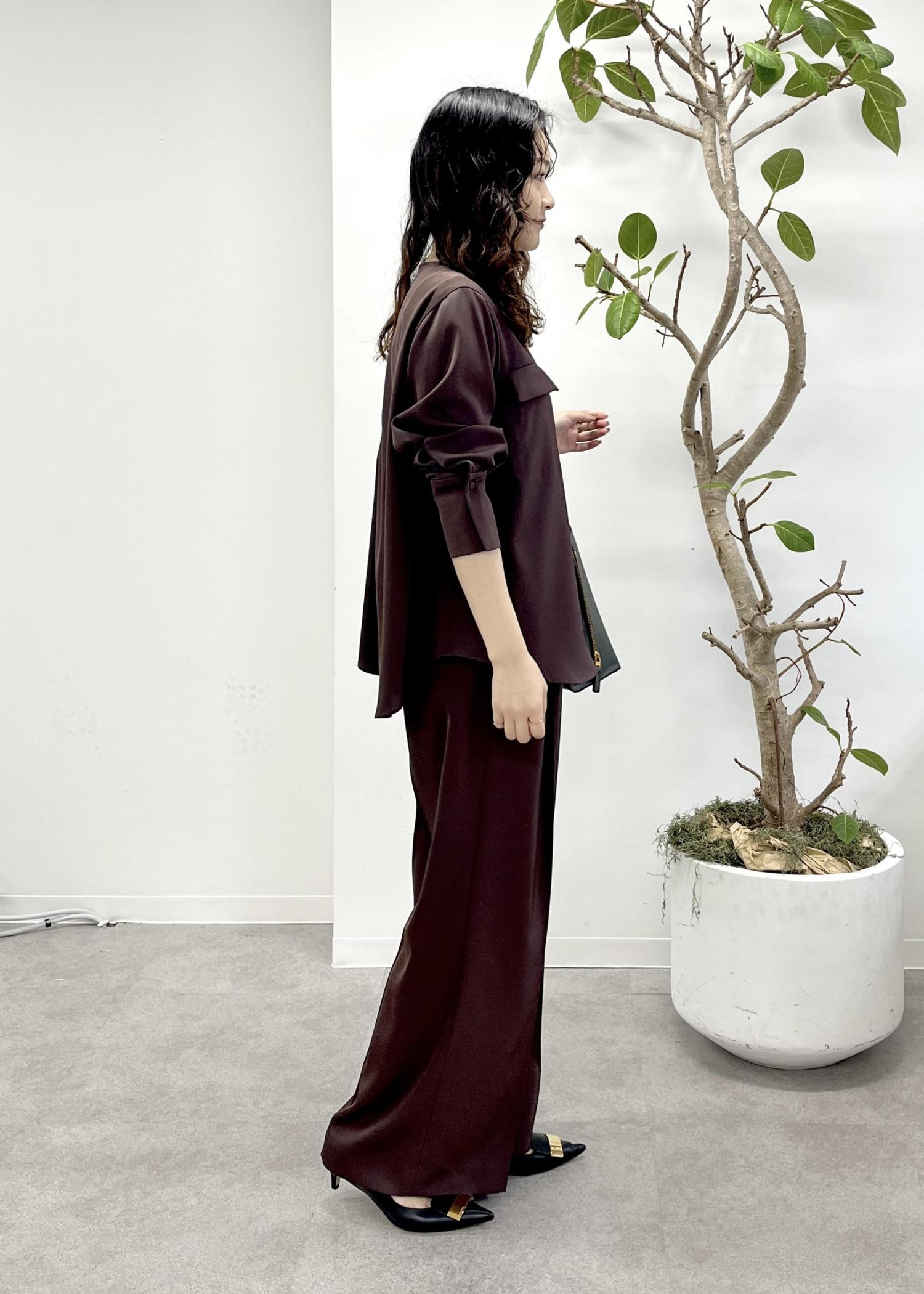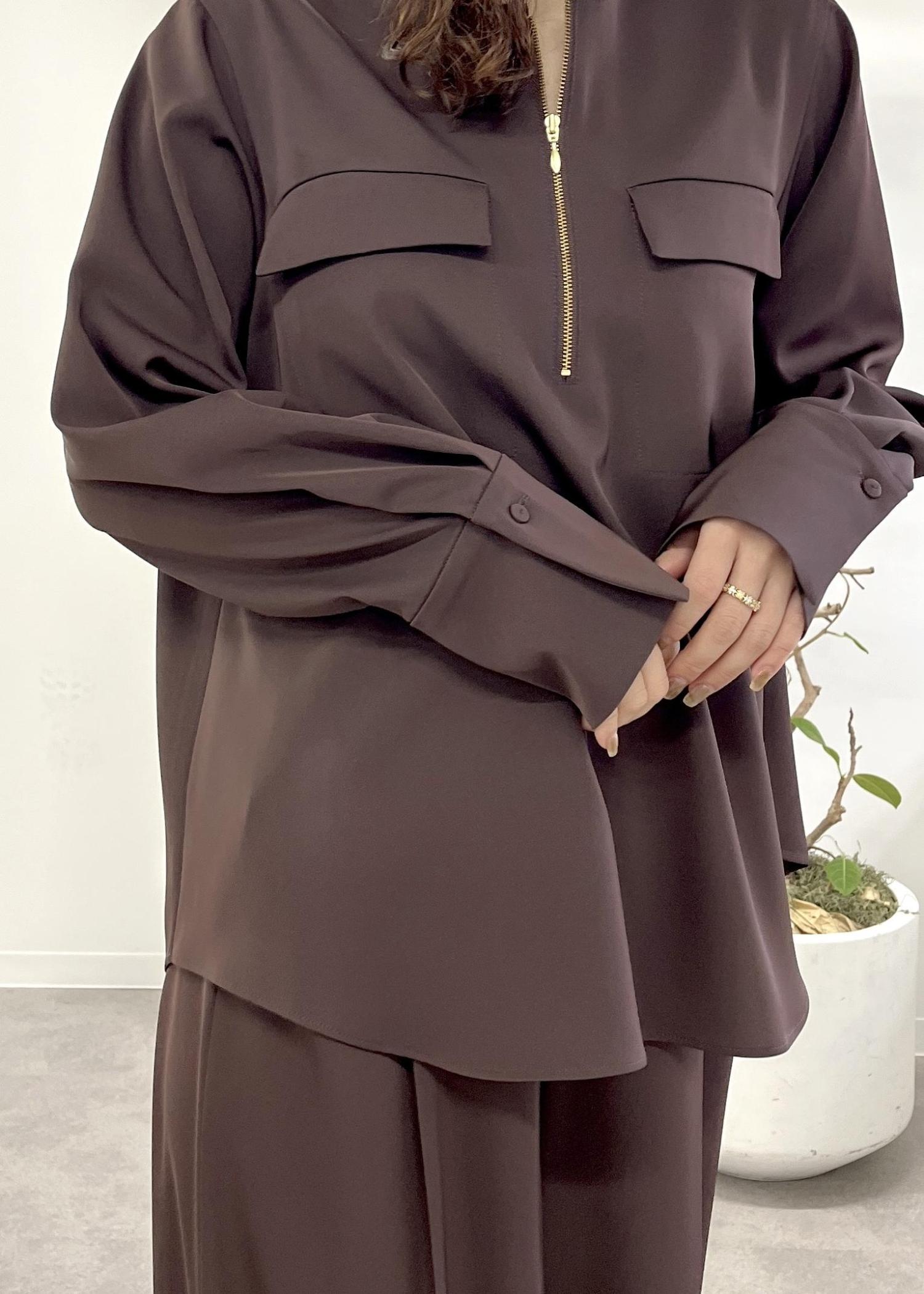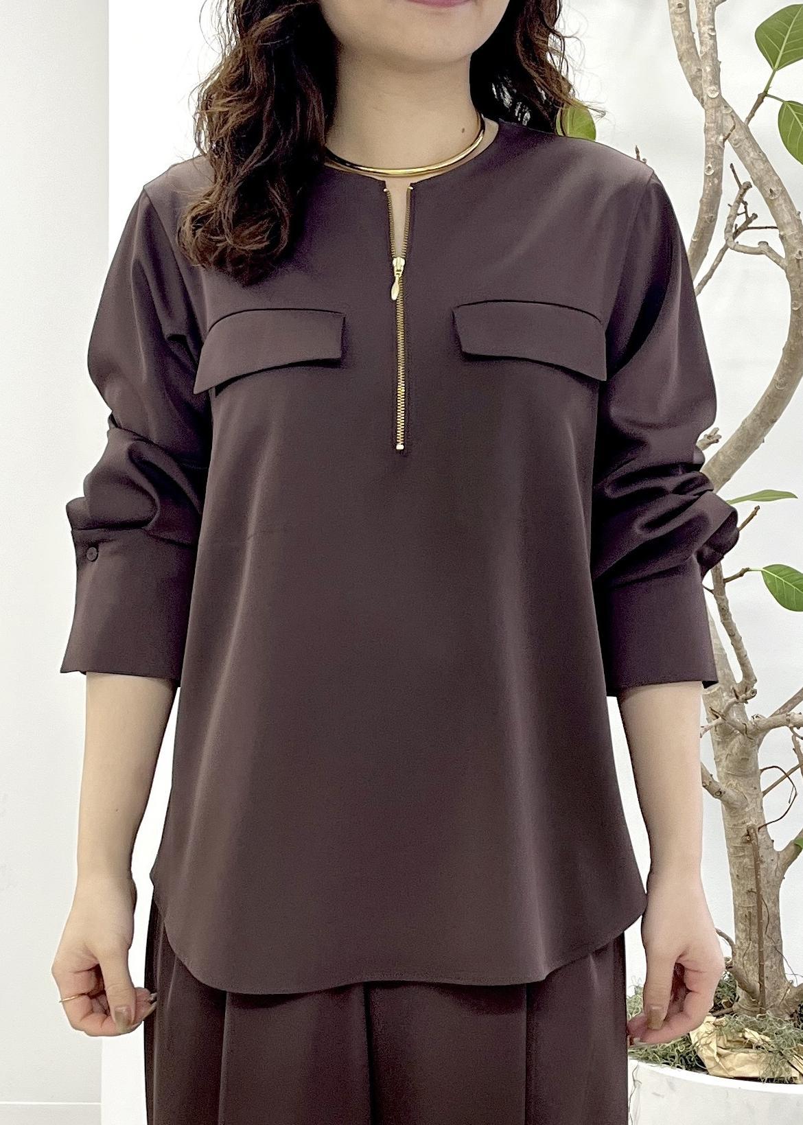 予約ROPÉフロントジップブラウス/セットアップ対応/イージーケアダークブラウン / 38¥24,200レビューサンプルの38サイズを着用しています。