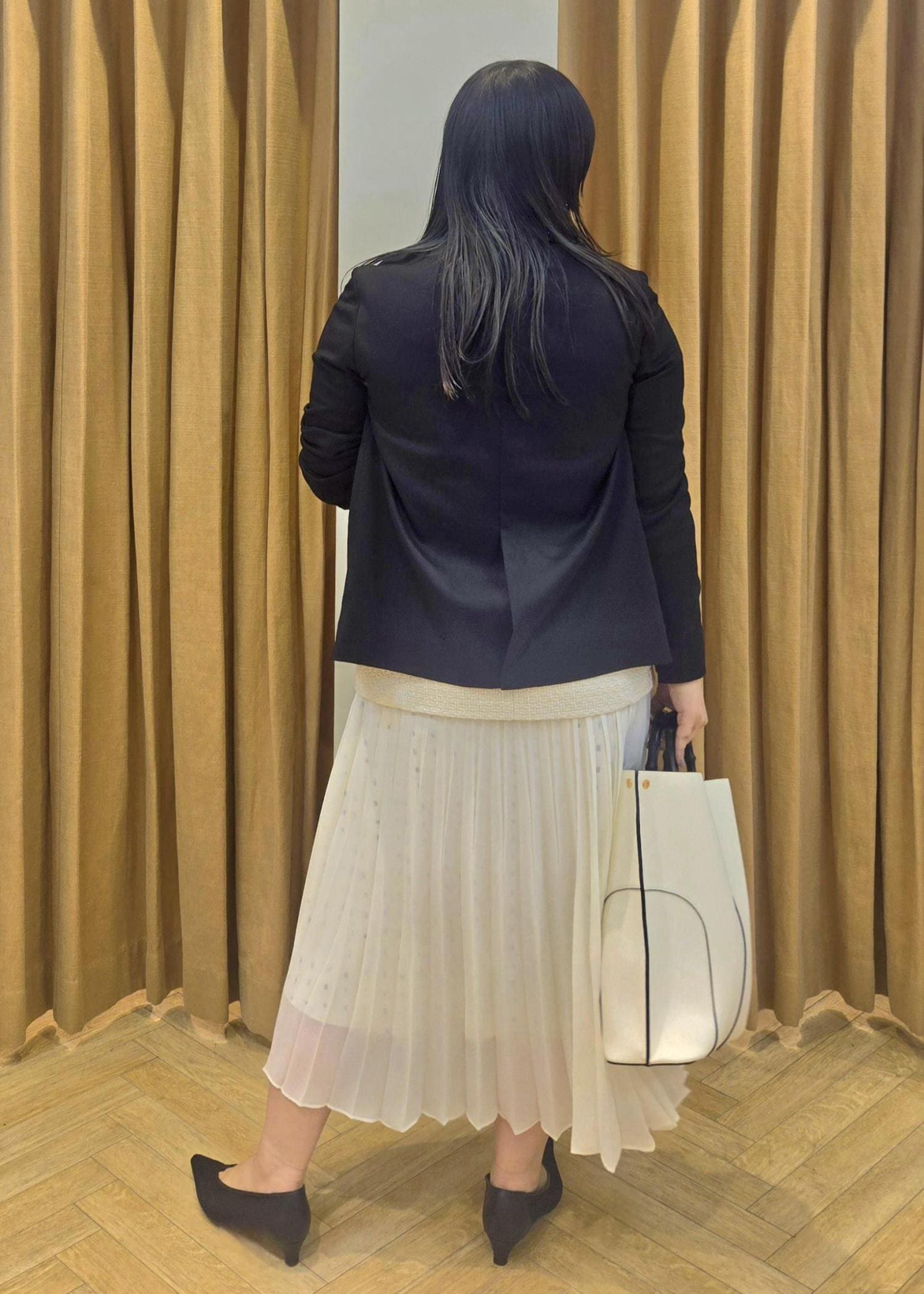 腰回りはより細かくプリーツが入っているのでスッキリと見せてくれます。