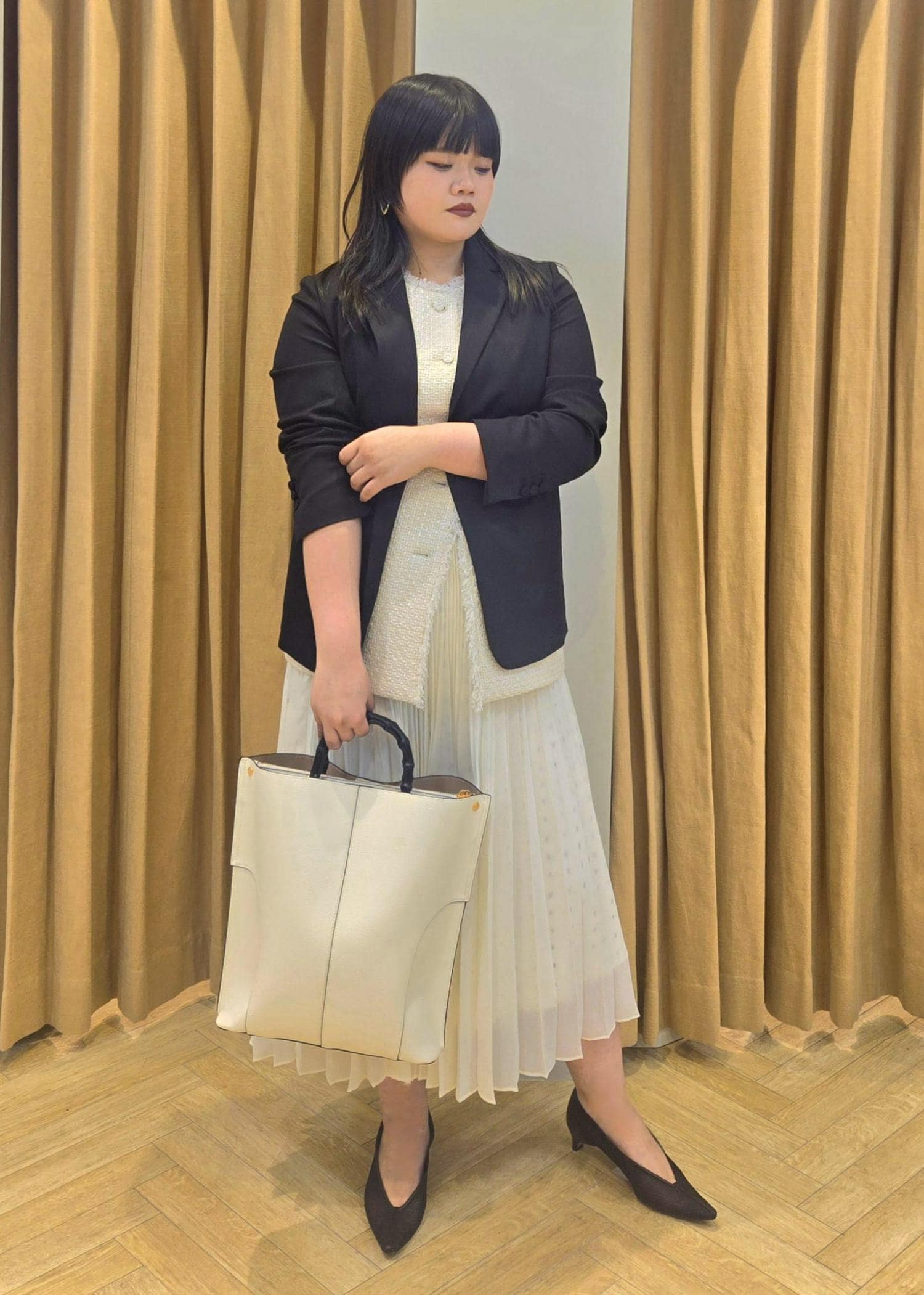 窮屈感なく着れるのでお仕事のシーンや、ワンピースの上に羽織ってお食事会のシーンでも使っていただけます。 -