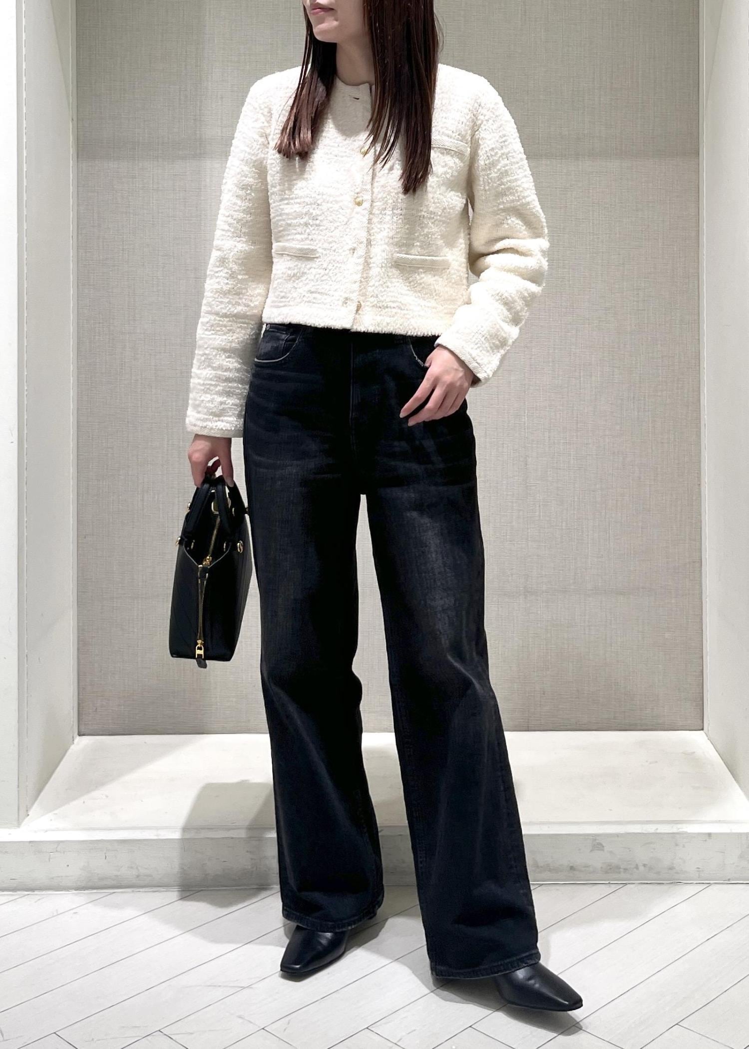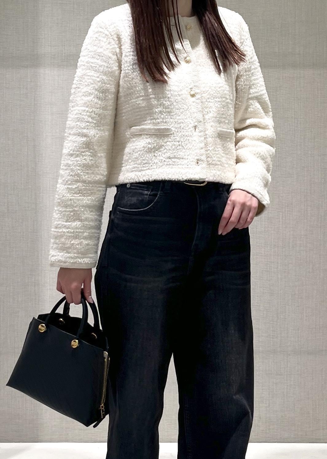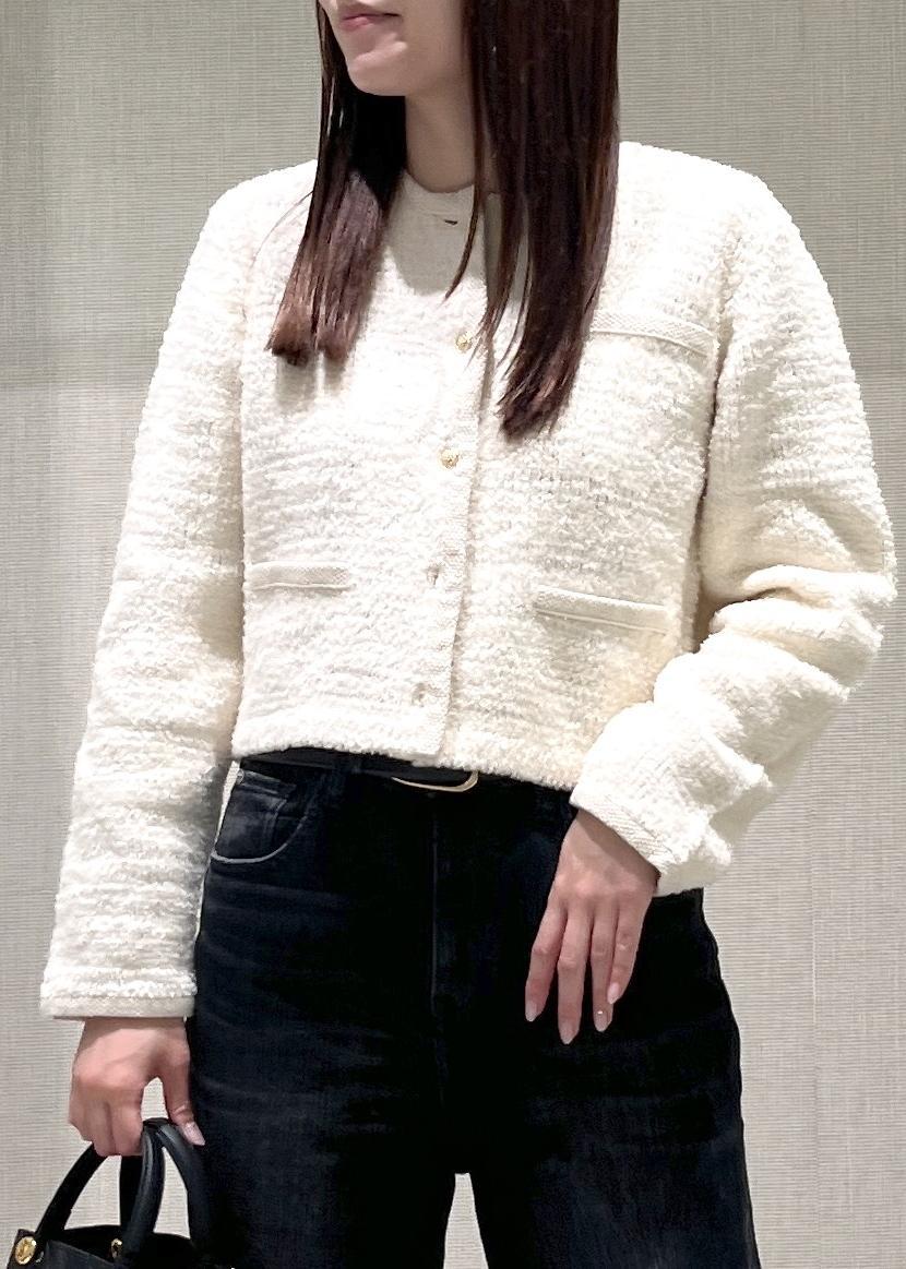 ROPÉツイードニットショート丈カーディガン/イージーケアキナリ / F¥26,180レビュー身幅の広がりが少なくコンパクトなシルエットです。普段36サイズを着用の方でもオーバー過ぎないデザインなのでおすすめです。