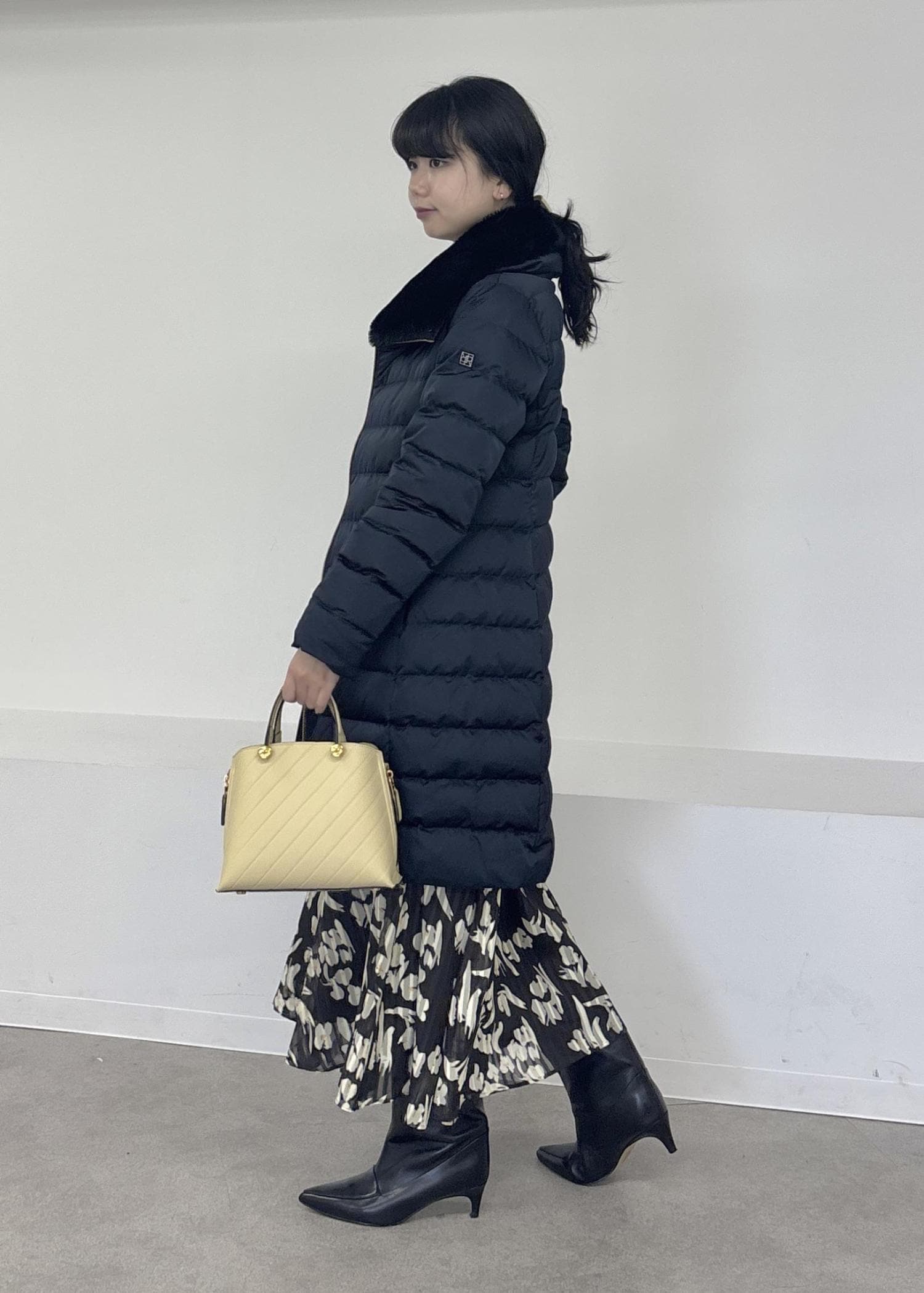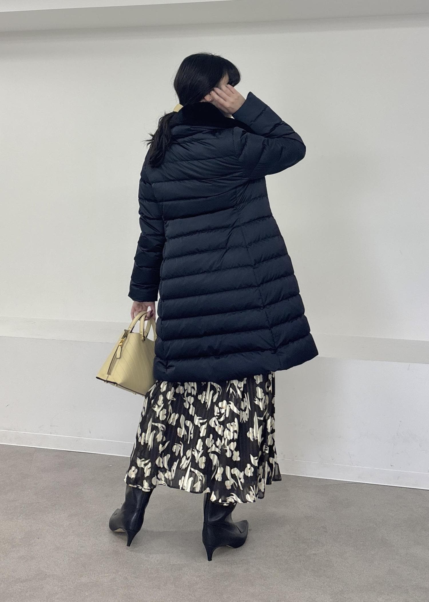 ロングダウンでフェミニンコーデ