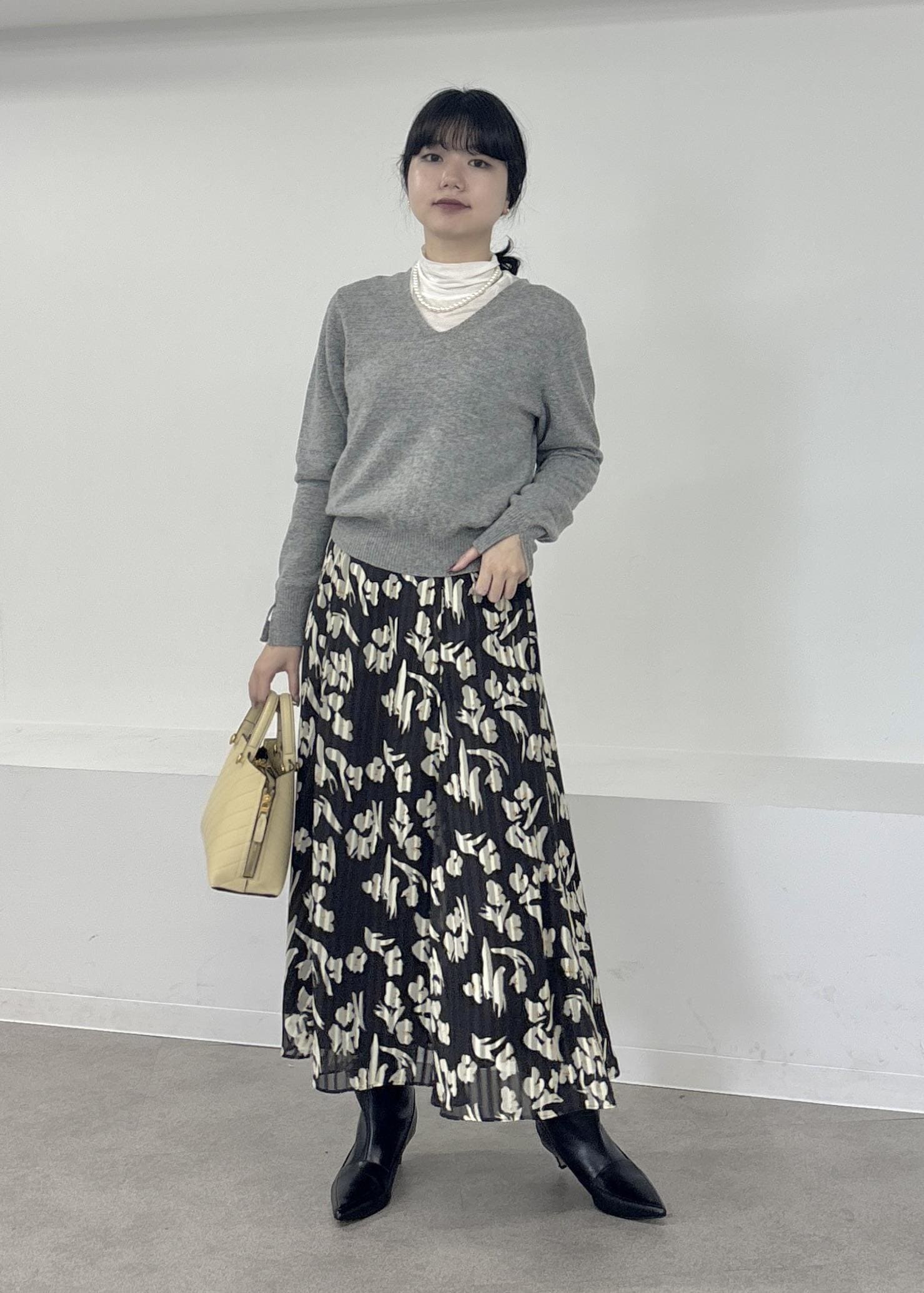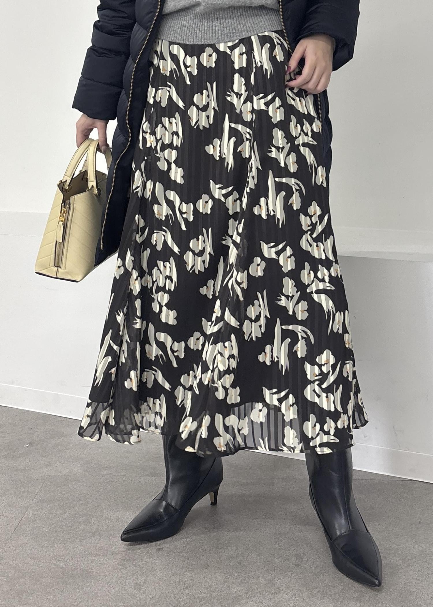 今回は花柄のフレアスカートと合わせて、より華やかでフェミニンなコーデにまとめました。