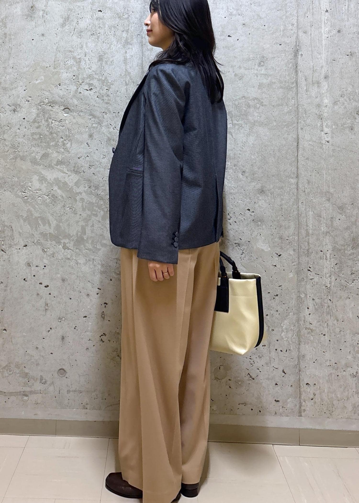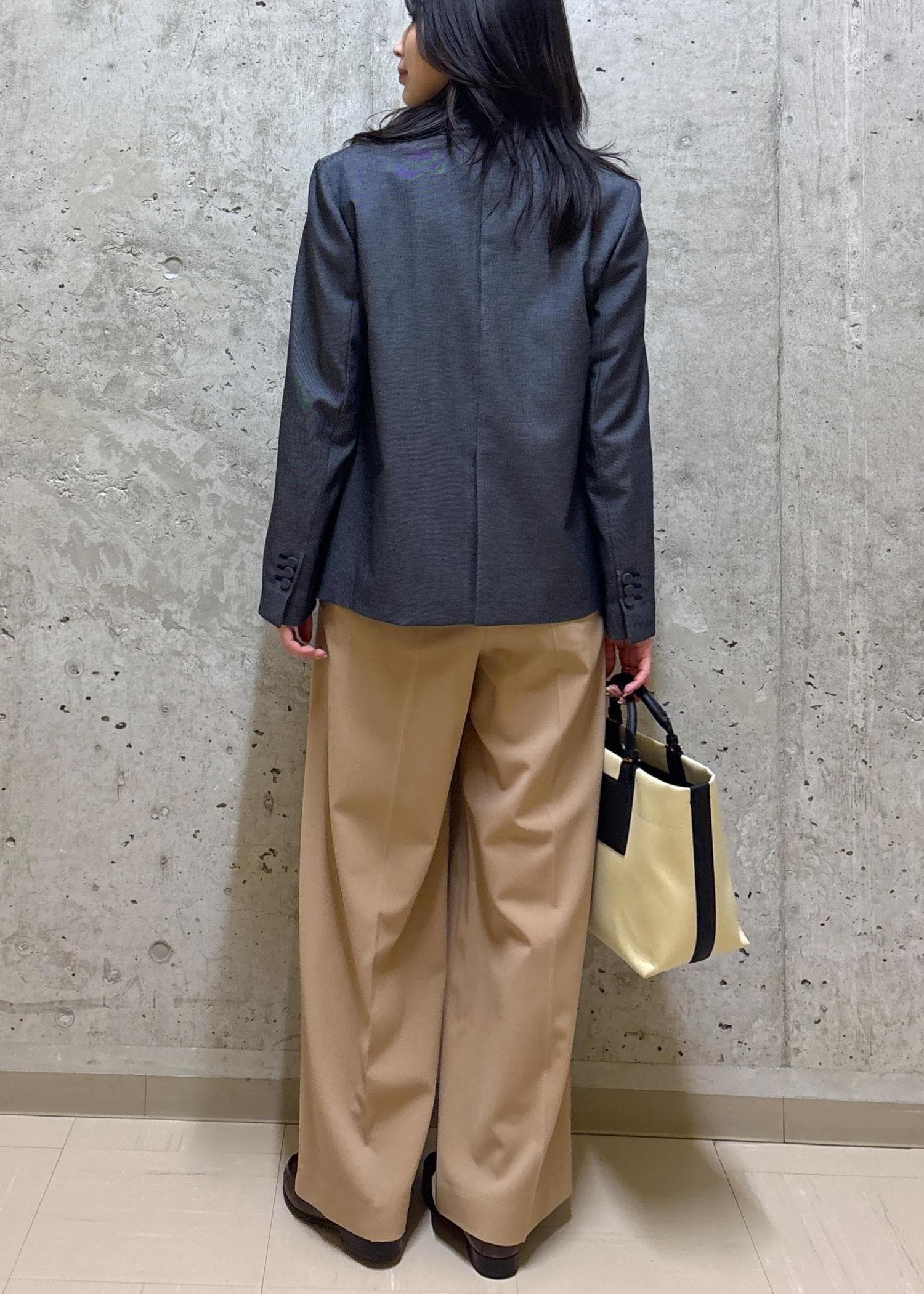 やや薄手のサラッとした手触りでシワが付きにくく、ウール混で上品な雰囲気の素材感。シーズン問わず履けます。