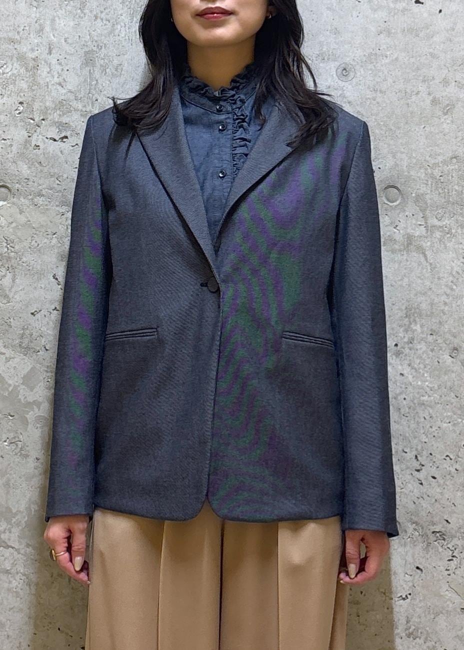 デニムライクなジャケットに、フリルブラウスを合わせて程よく女性らしく。