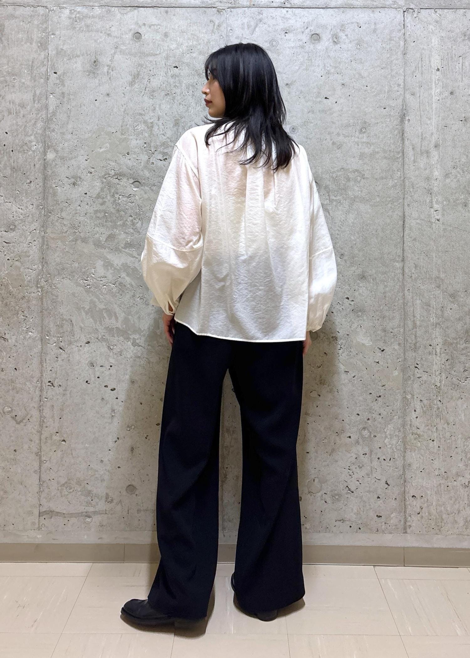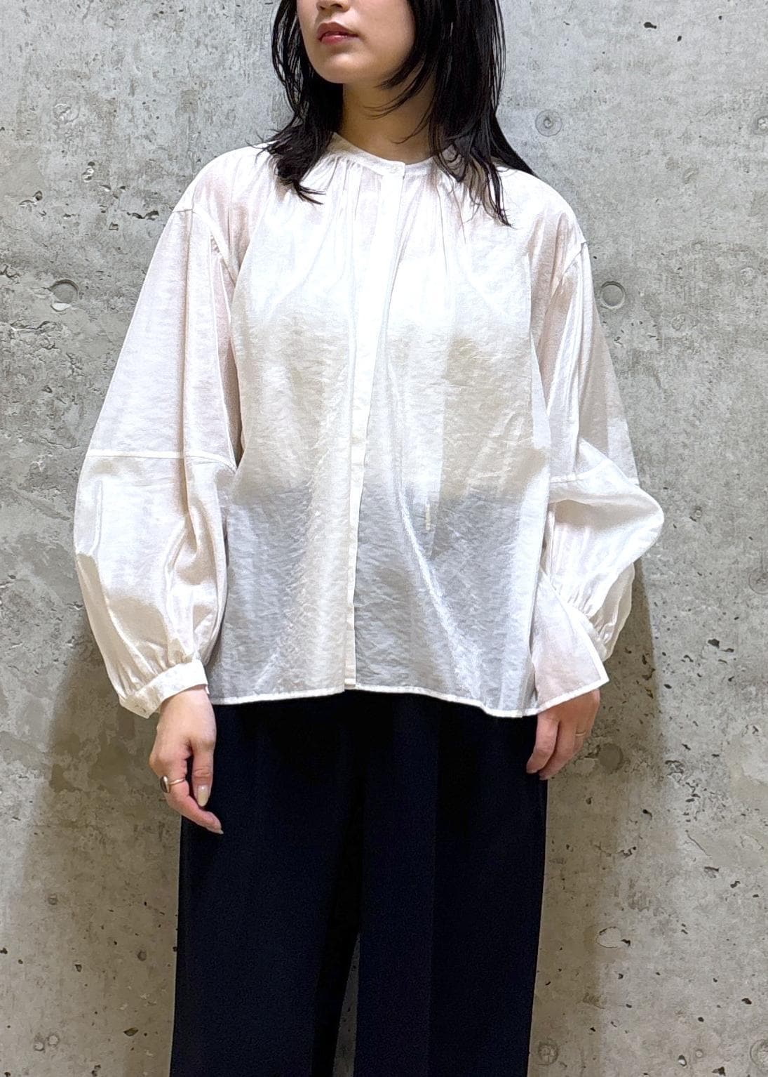 襟や袖口に細かいギャザーが入っていて、全体的にふんわりと空気をはらんだシルエットが抜け感があってお洒落です。