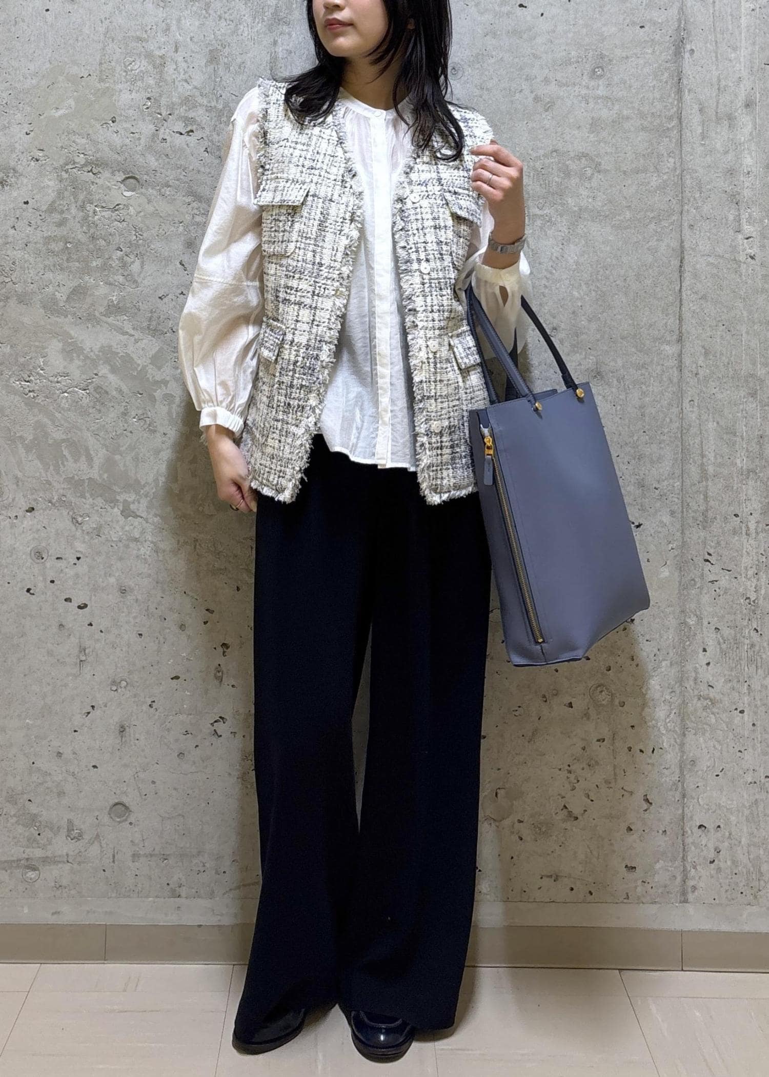 きちんと感のあるツイードジレは、