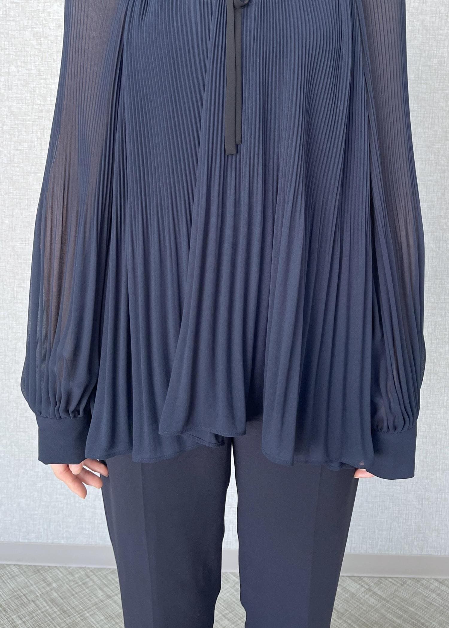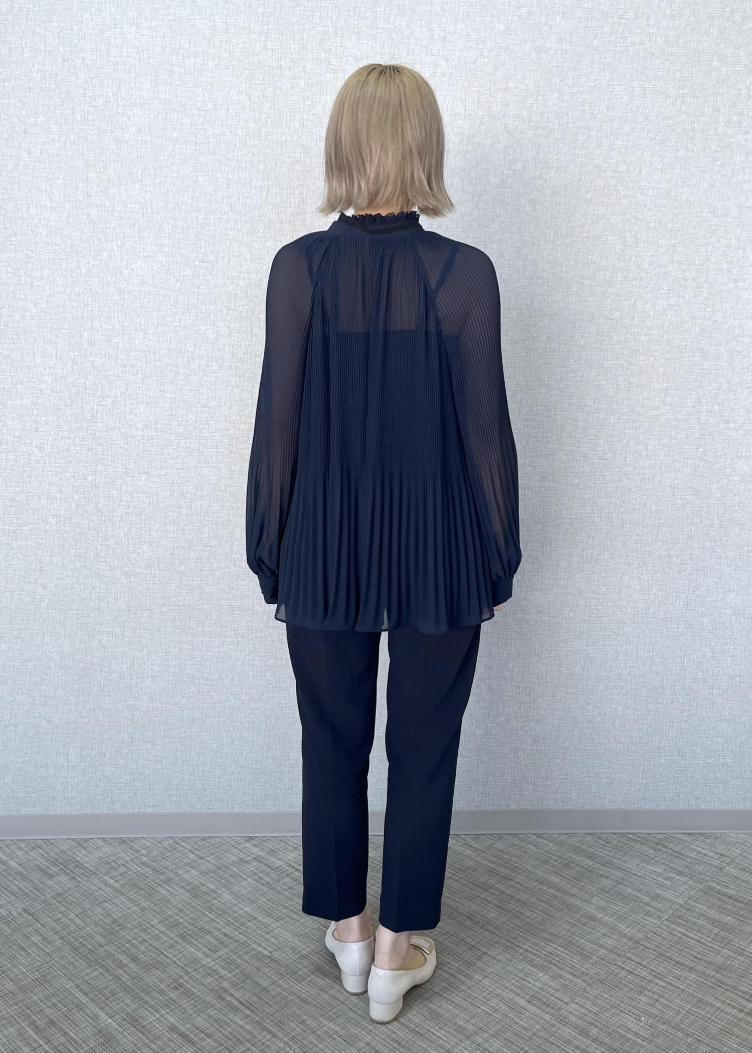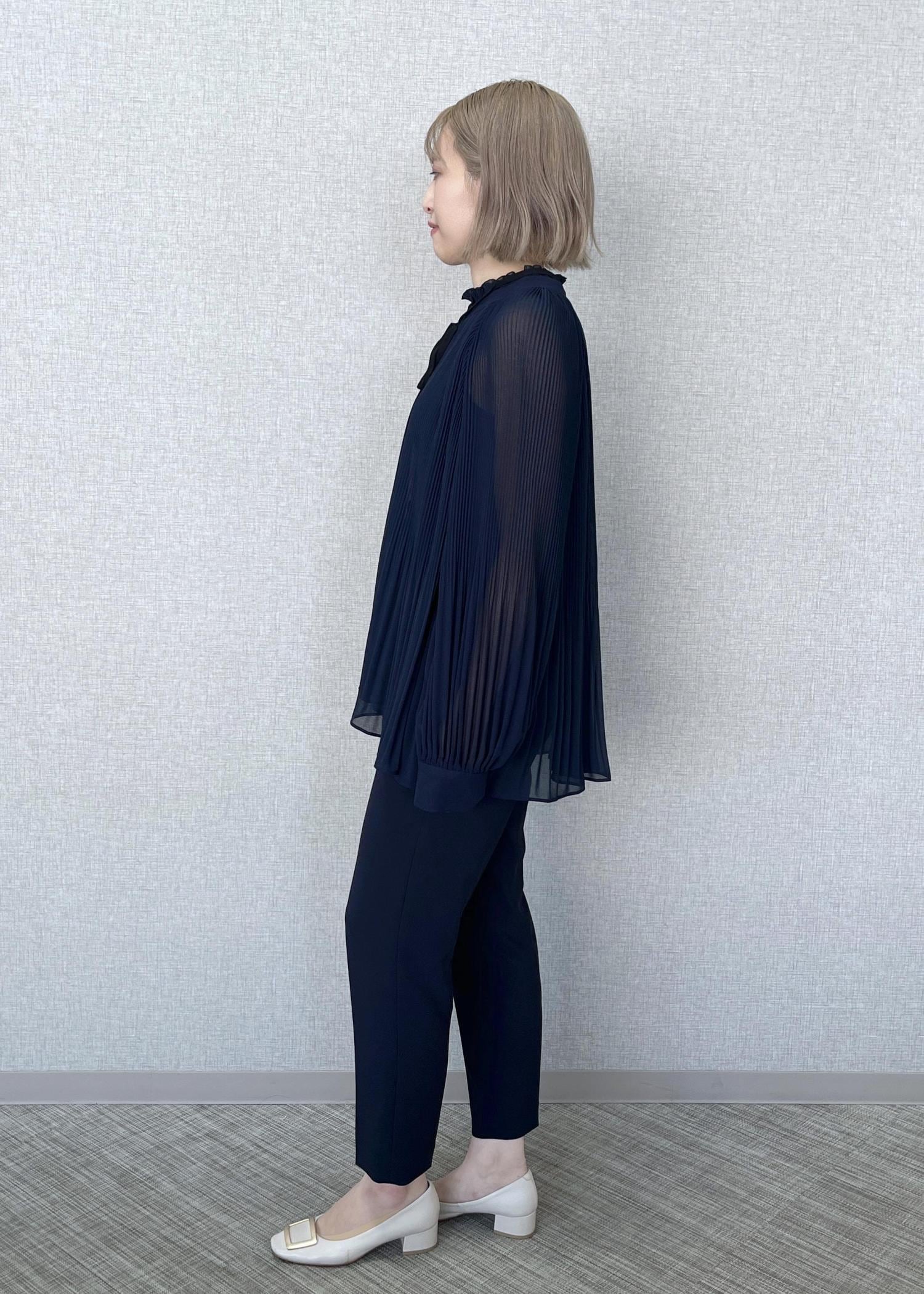セレモニーにも着用可能なプリーツブラウスをテーパードパンツと合わせました。上にジレやジャケットを羽織ればきちんと感がでて行事事にも着用できます。
