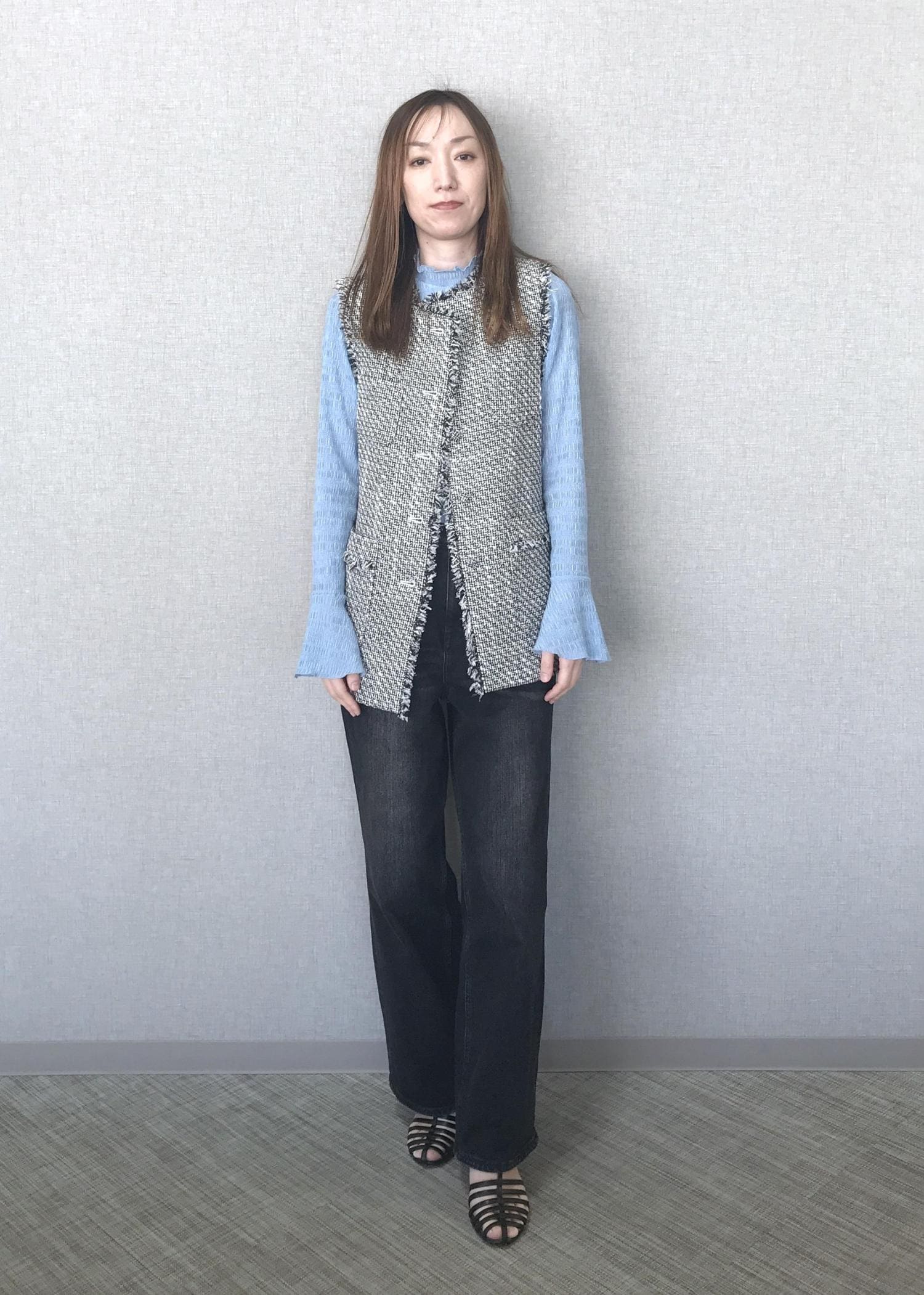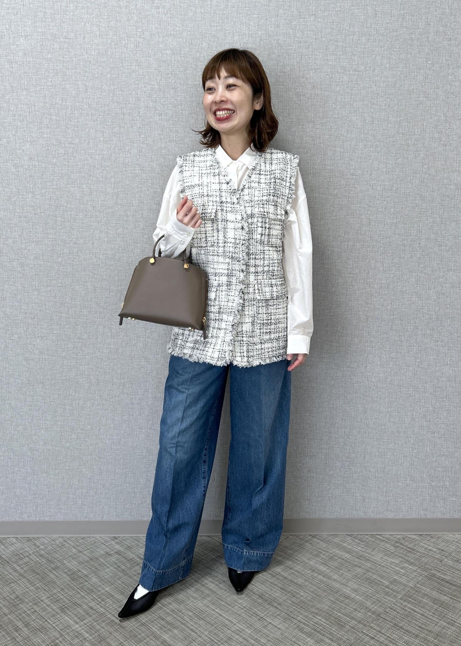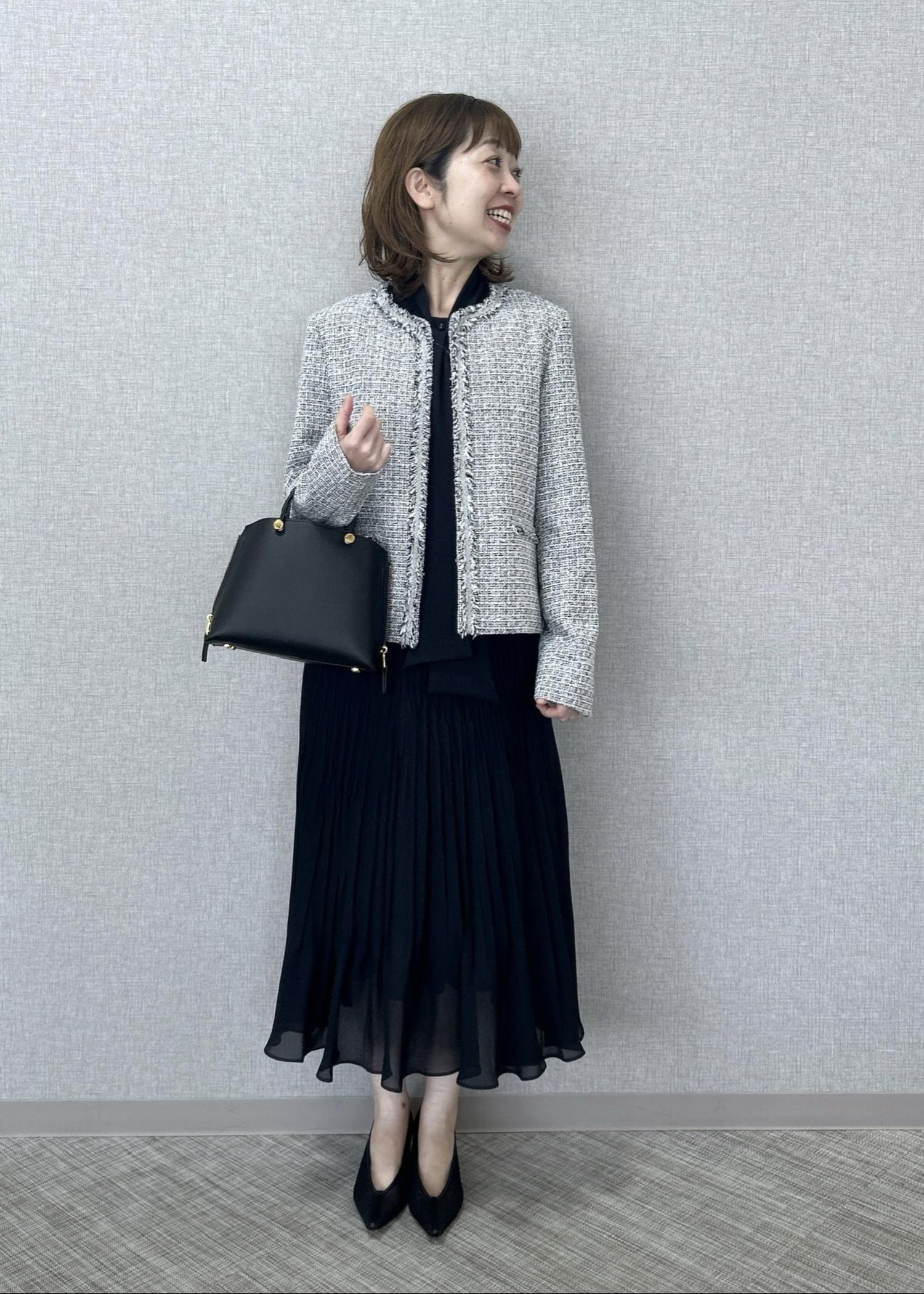 セレモニーにも着用可能なプリーツブラウスをテーパードパンツと合わせました。上にジレやジャケットを羽織ればきちんと感がでて行事事にも着用できます。