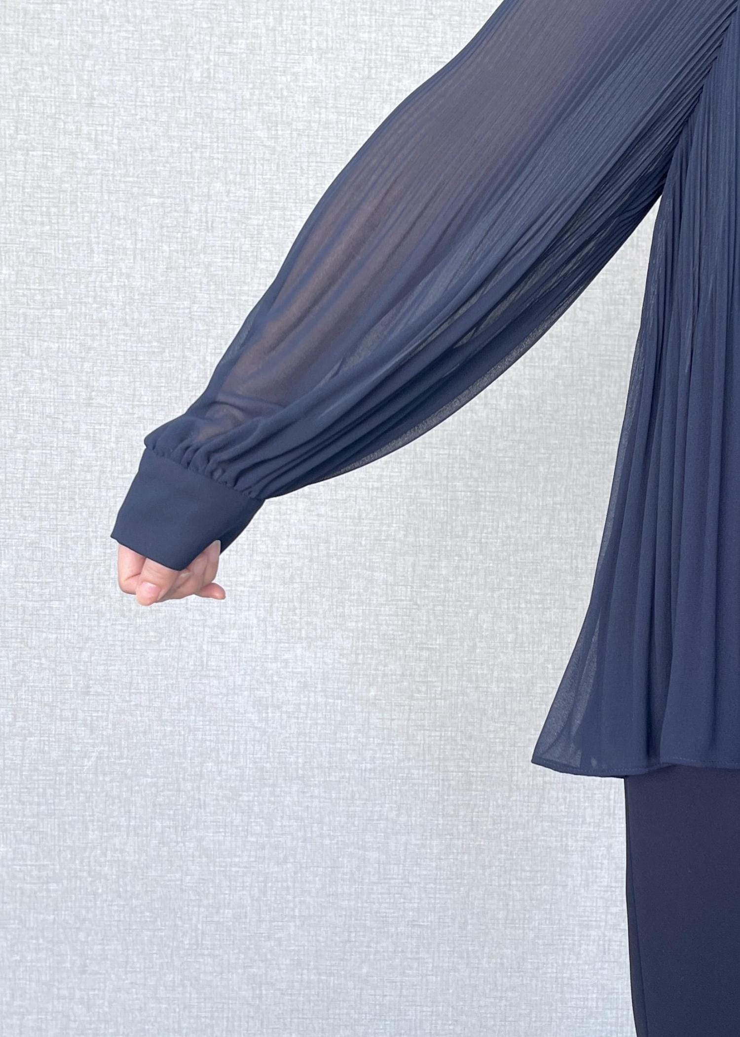 たっぷりプリーツで、体型をあまり気にせず着用できます。袖もゆとりがたっぷりあります。