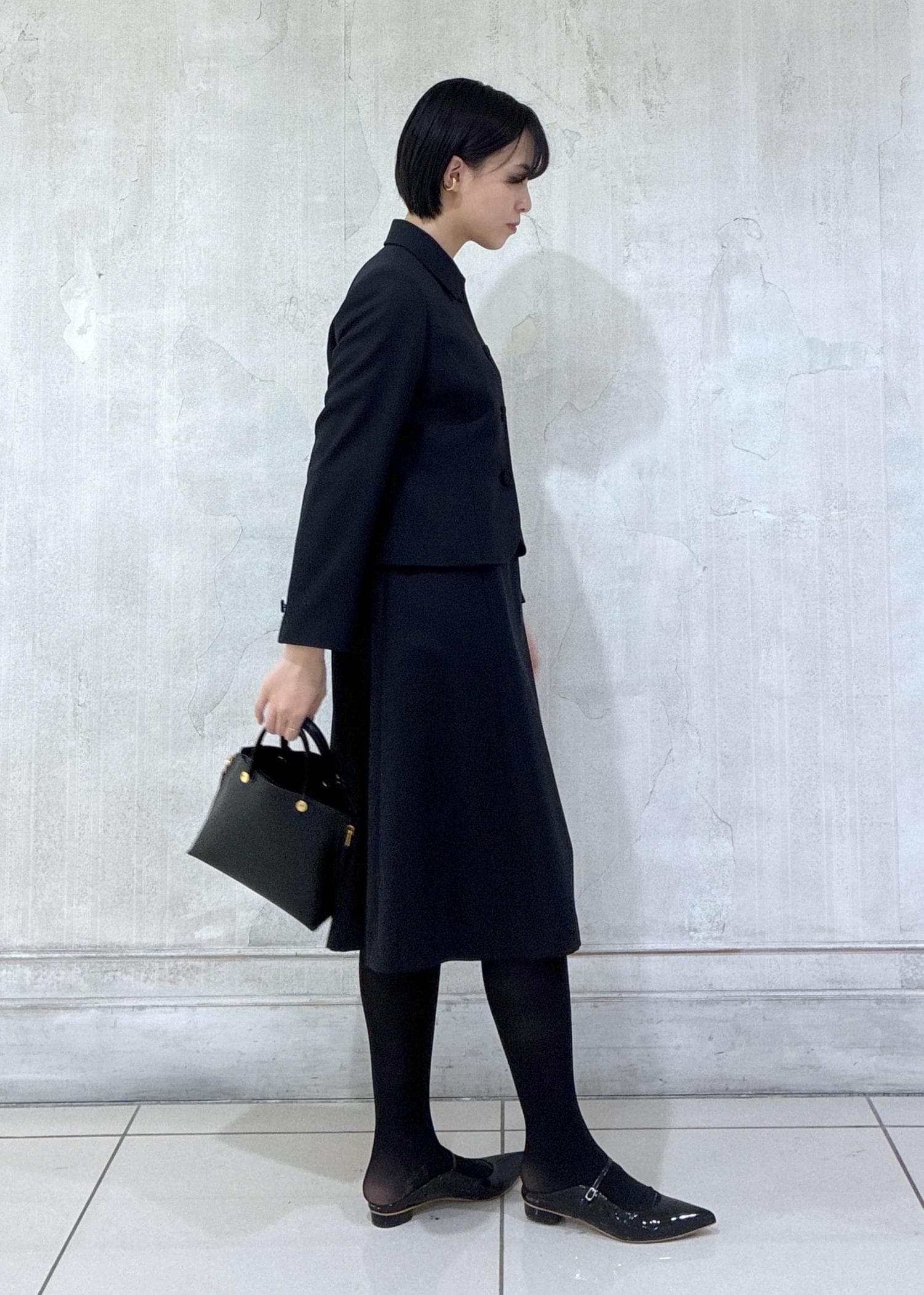 椅子に座った時に膝が見えない上品な着丈感で、ウール素材ですがザラっとした通気性の良い素材感なので真夏以外の3シーズンお召しいただけます。