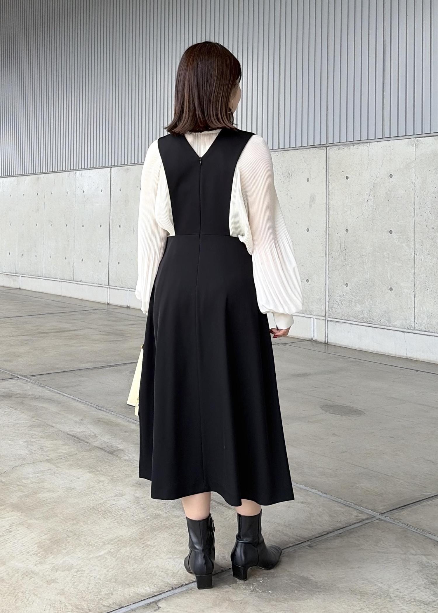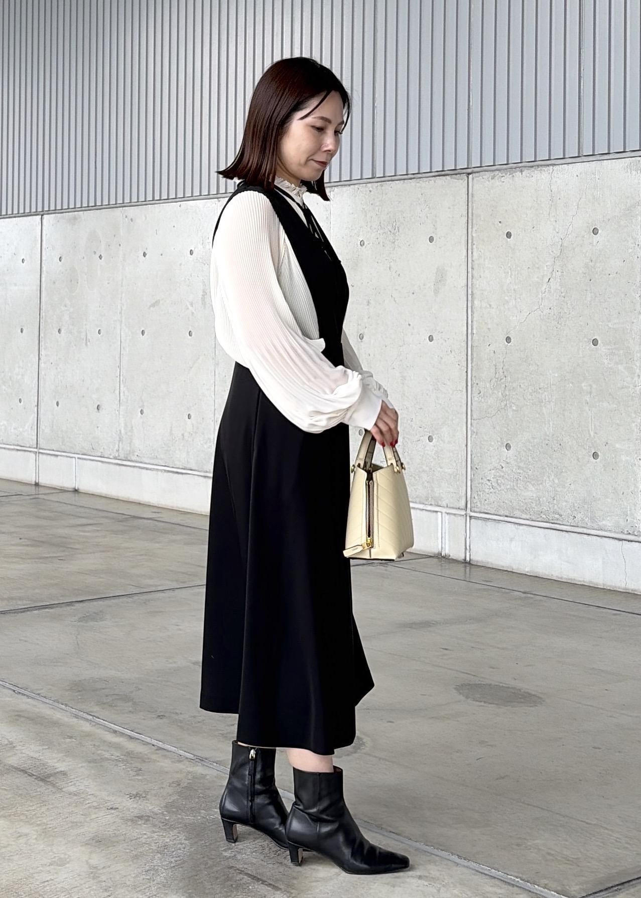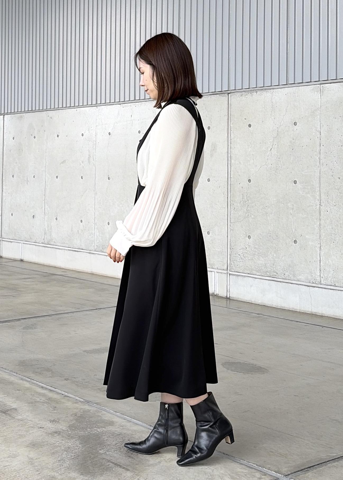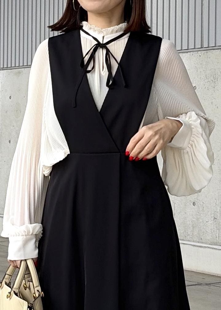 デザイン性のあるキレイめワンピースにプリーツのシフォンブラウスでフェミニンさをプラス。