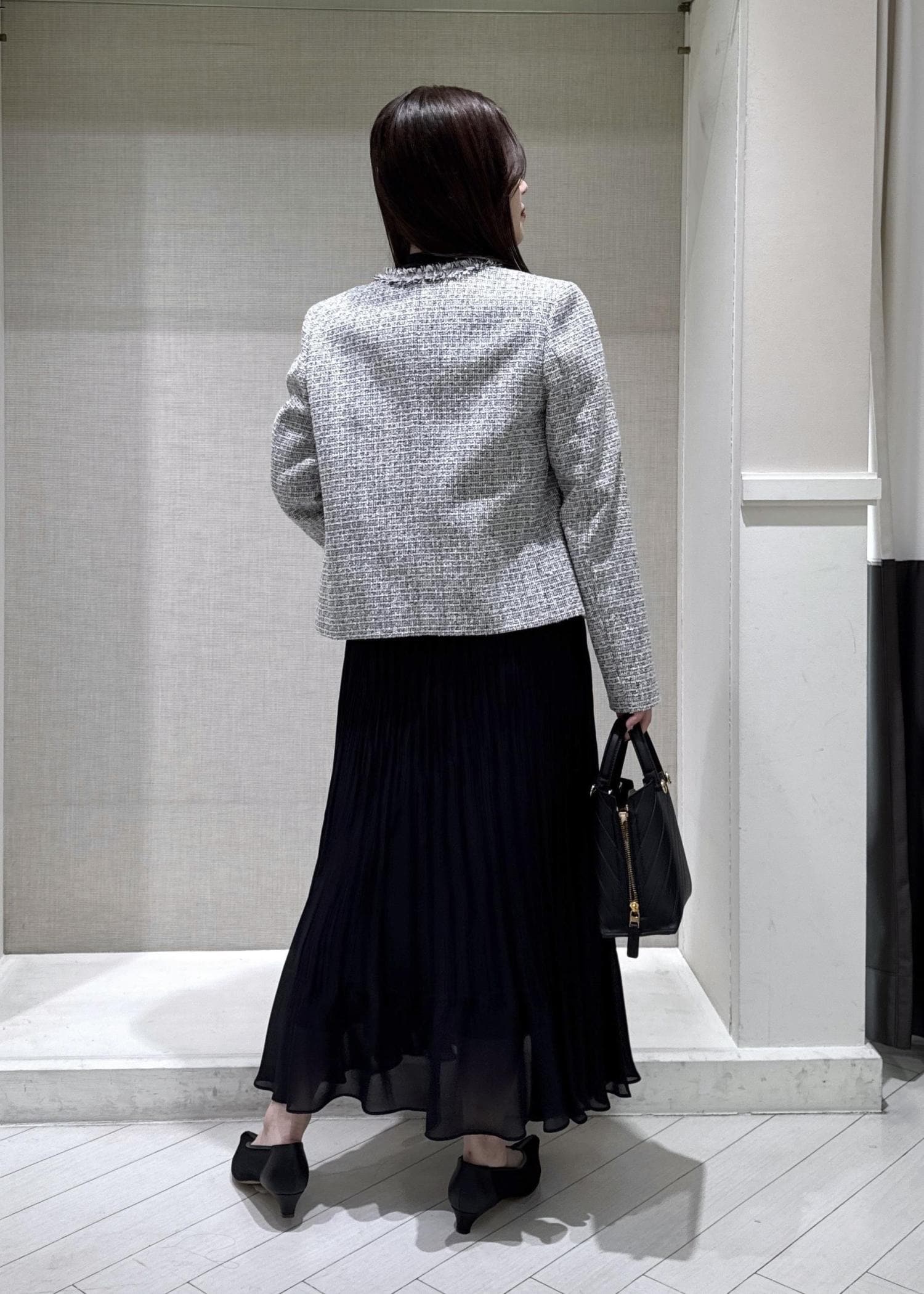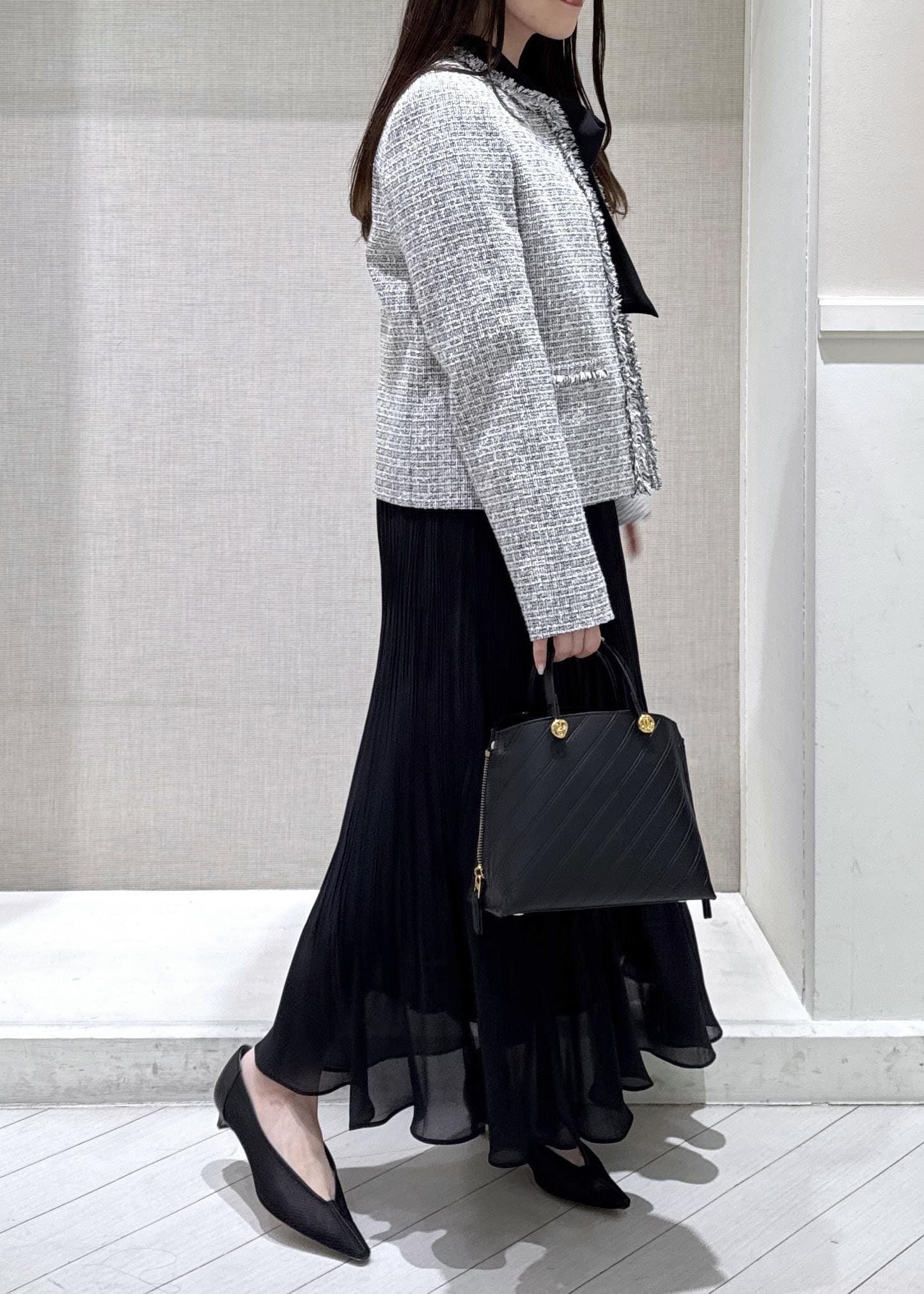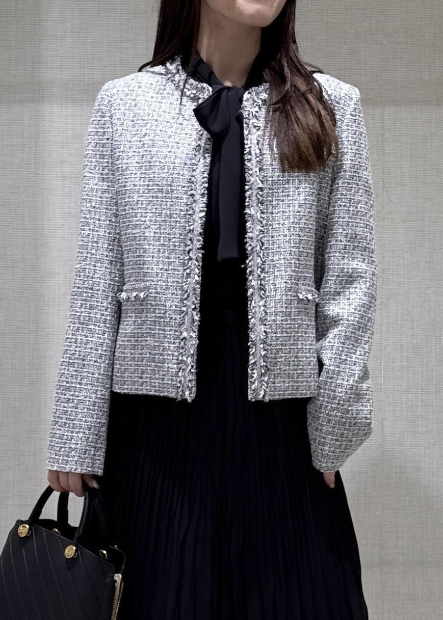 上品なツイードジャケットとシフォンワンピースでセレモニーコーディネートを着用してみました♩