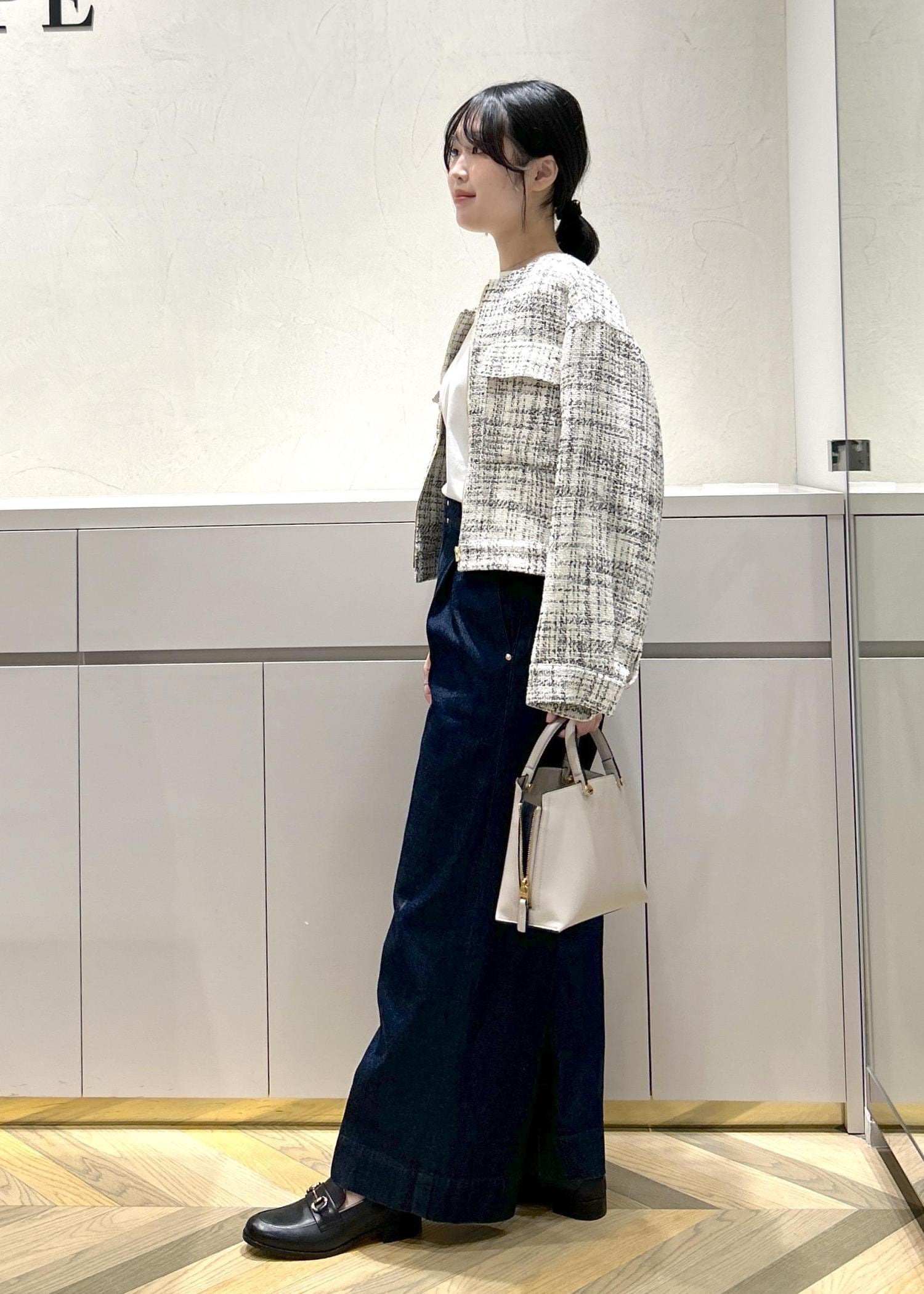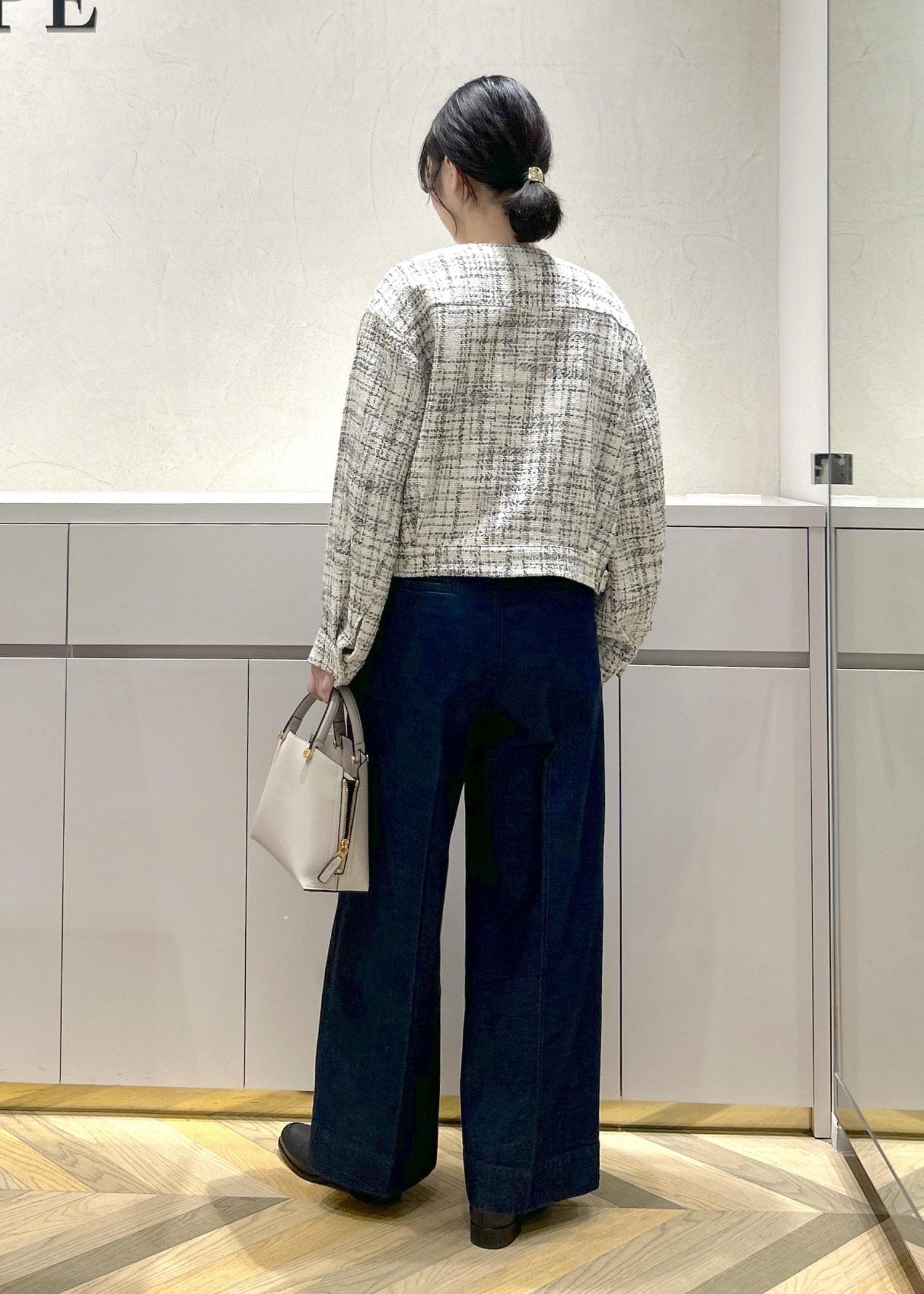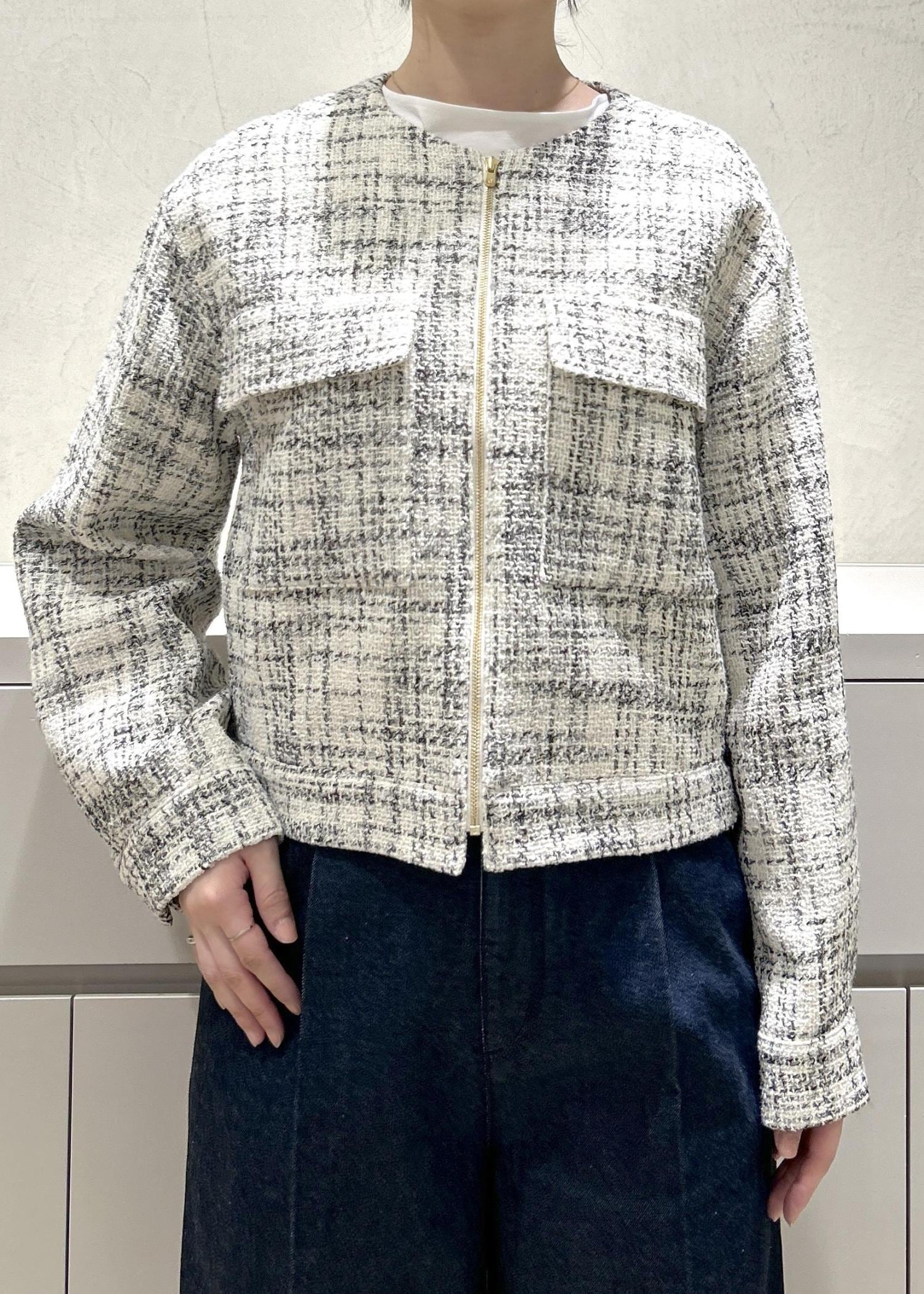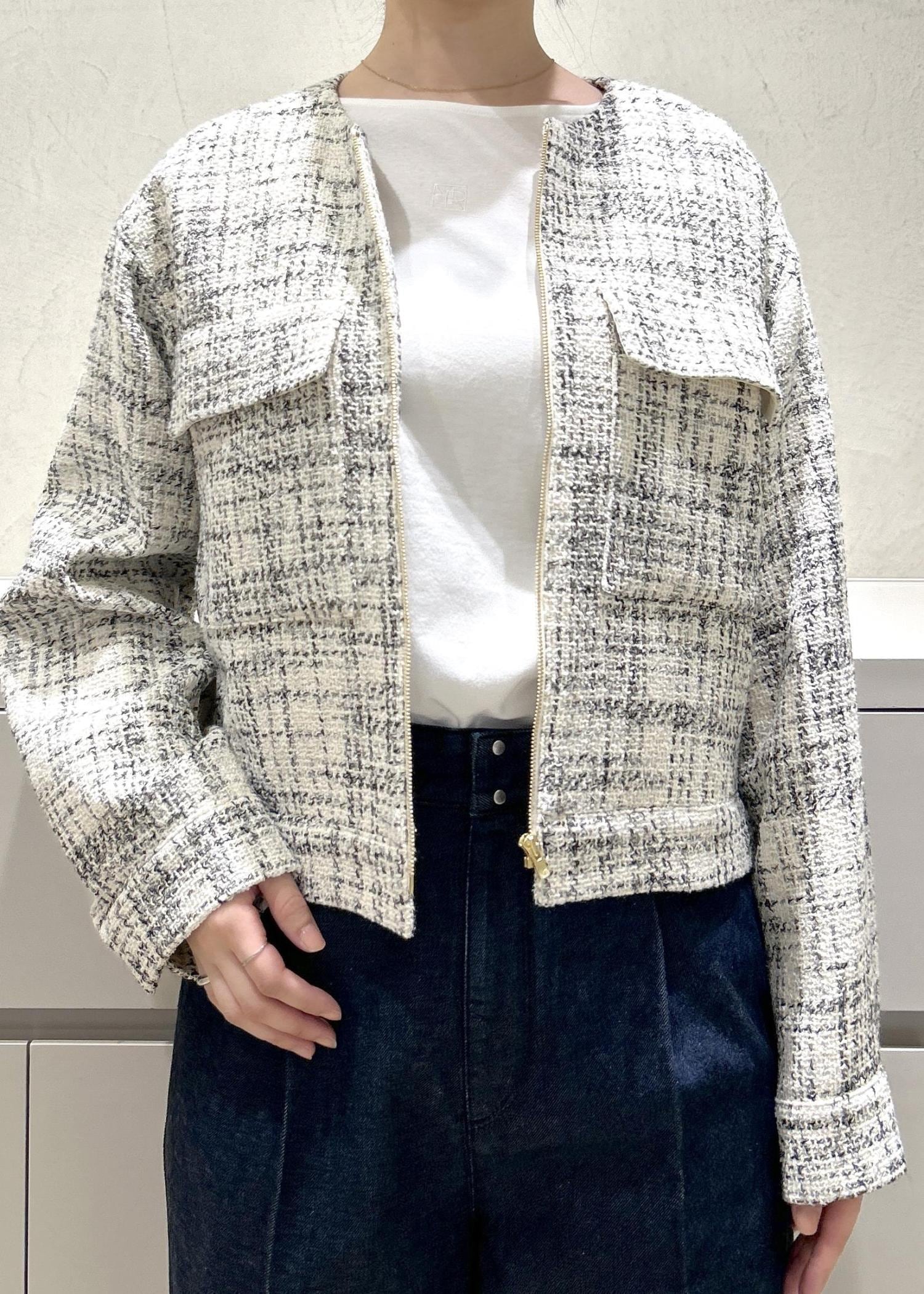 ROPÉツイードノーカラージャケットキナリ系 / F¥52,800レビューコンパクトな丈感でスカートでもパンツでも合わせやすいです。身幅とアームホールは少しゆとりがあります。Gジャンのようなデザインが少しカジュアルな雰囲気で普段使いしやすいです。