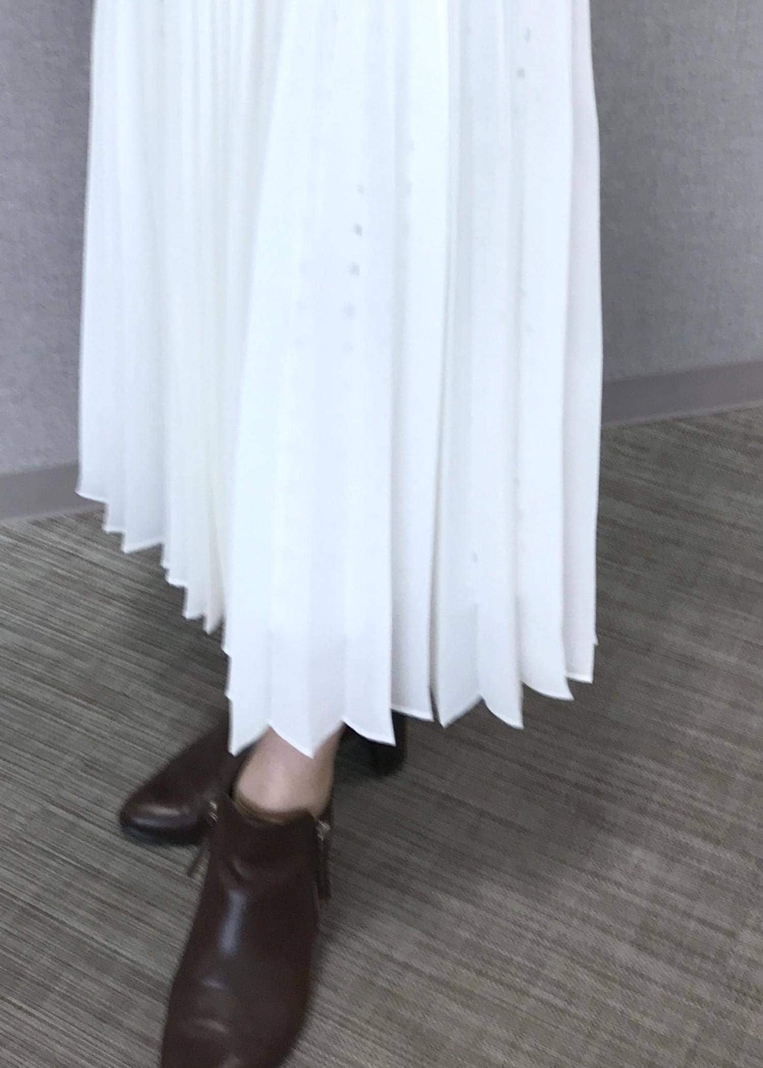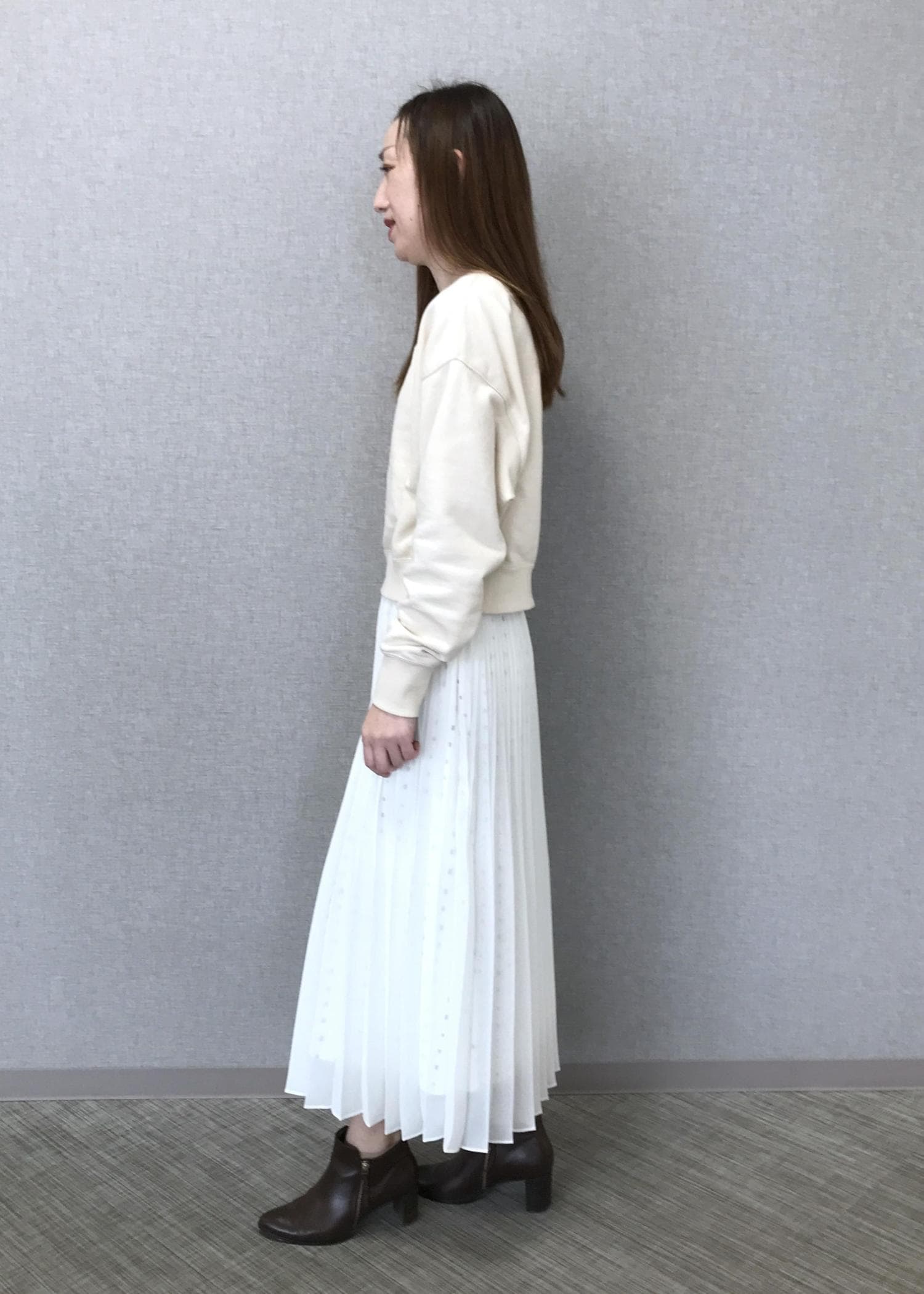 エレガントさの出るプリーツスカートをスウェット、ブーツ合わせで普段使いとして、コーディネートを楽しんでみてくださいね。