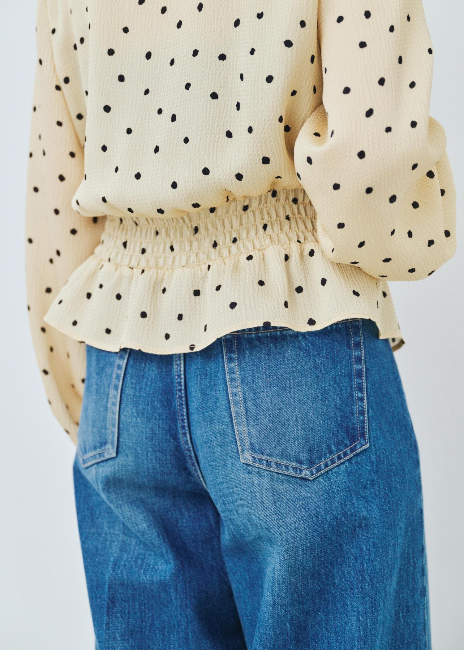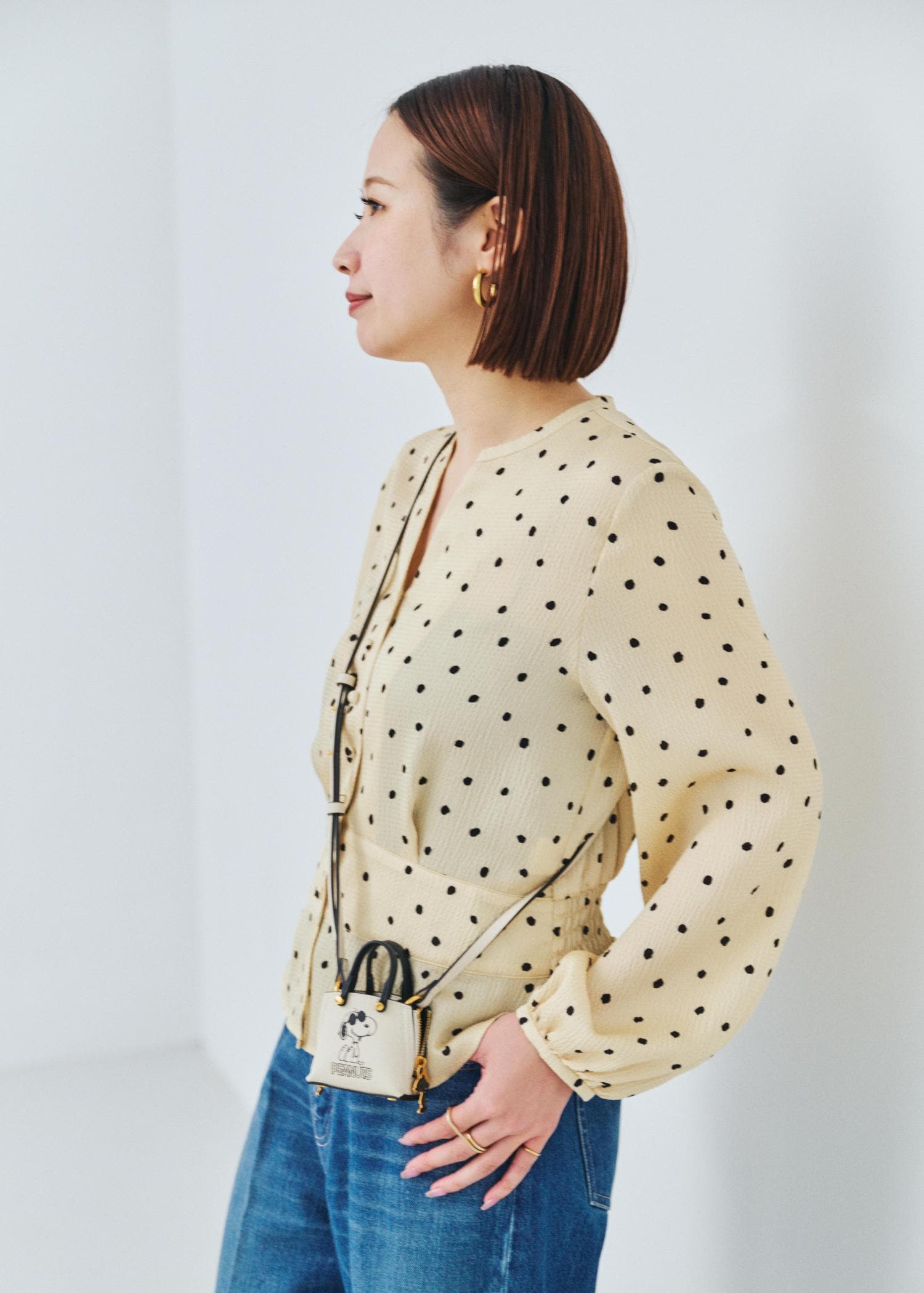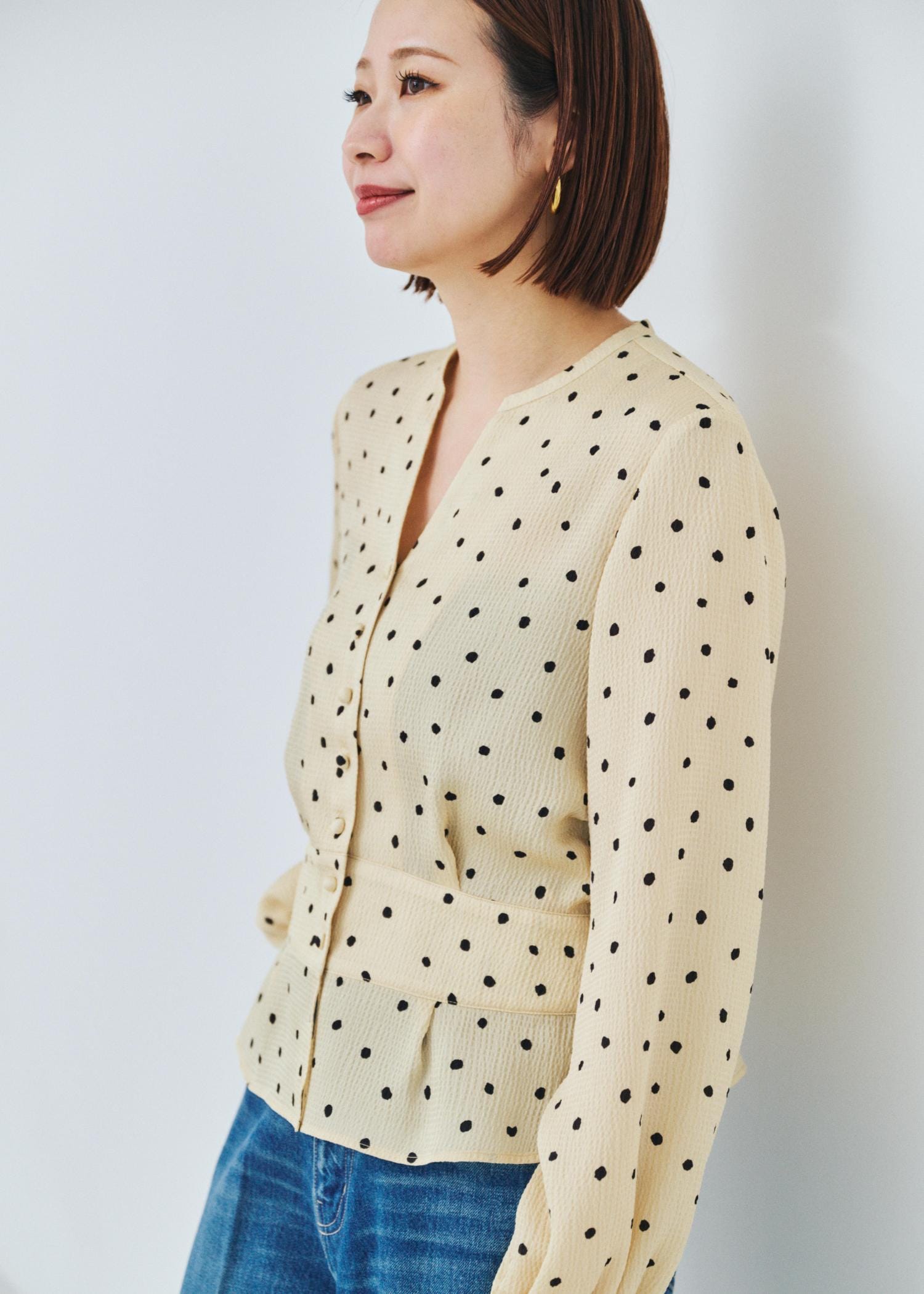 NEW! 予約ROPÉドットプリントウエストタックペプラムブラウス/イージーケアベージュ / 38¥26,400レビュー161cmで38サイズ着用。