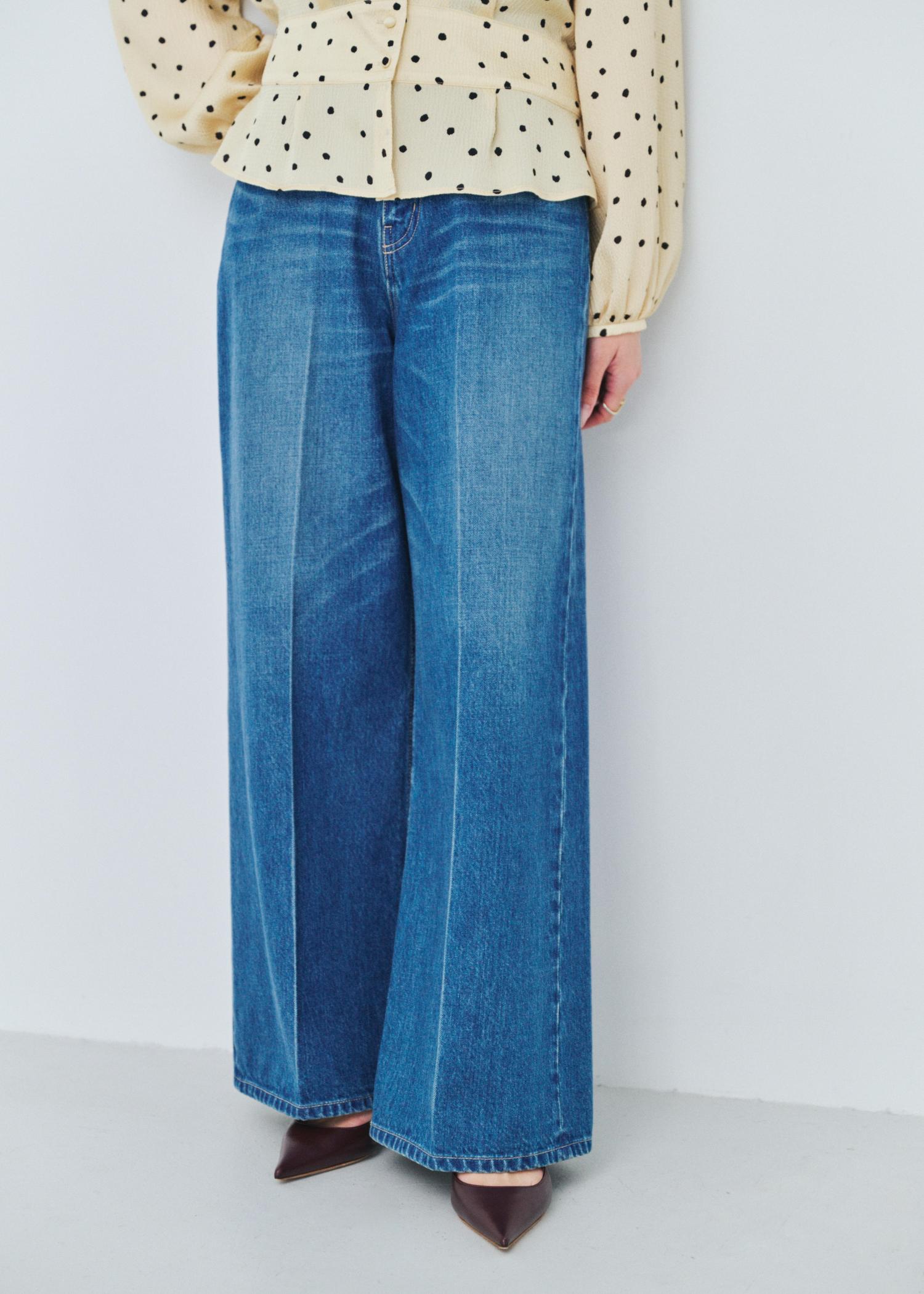 NEW! 予約ROPÉ【KUROKI(クロキ)】センタープレスイージーワイドデニムパンツ/イージーケア・セットアップ対応ブルー系 / 38¥30,800レビュー161cmで38サイズ着用。