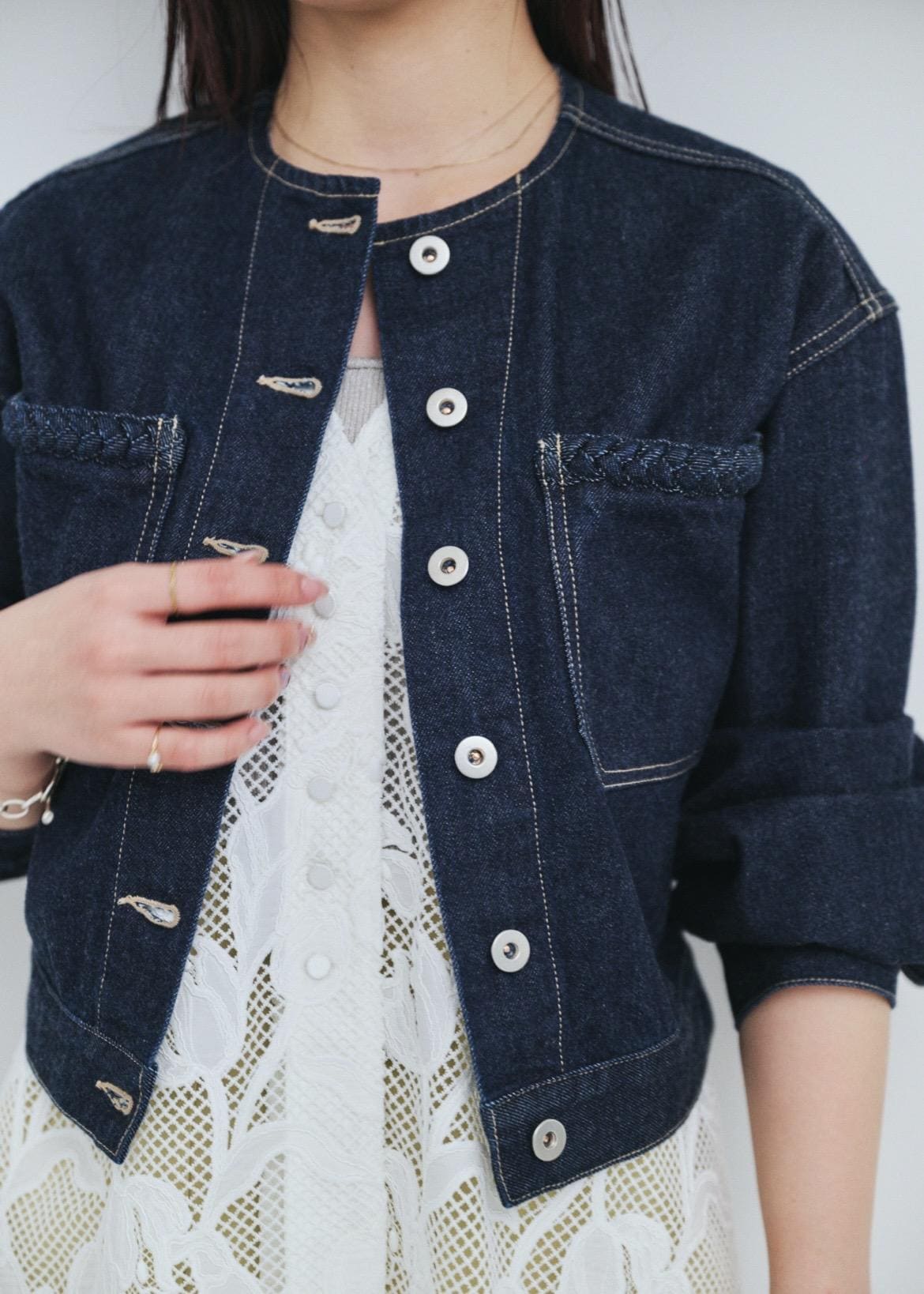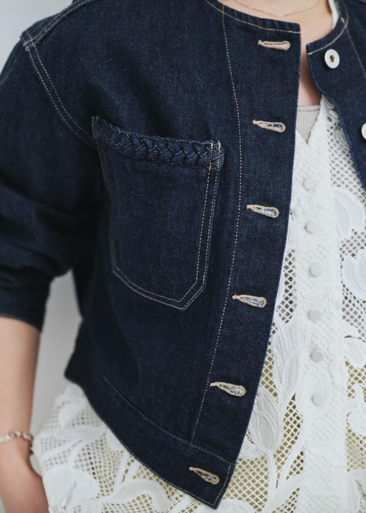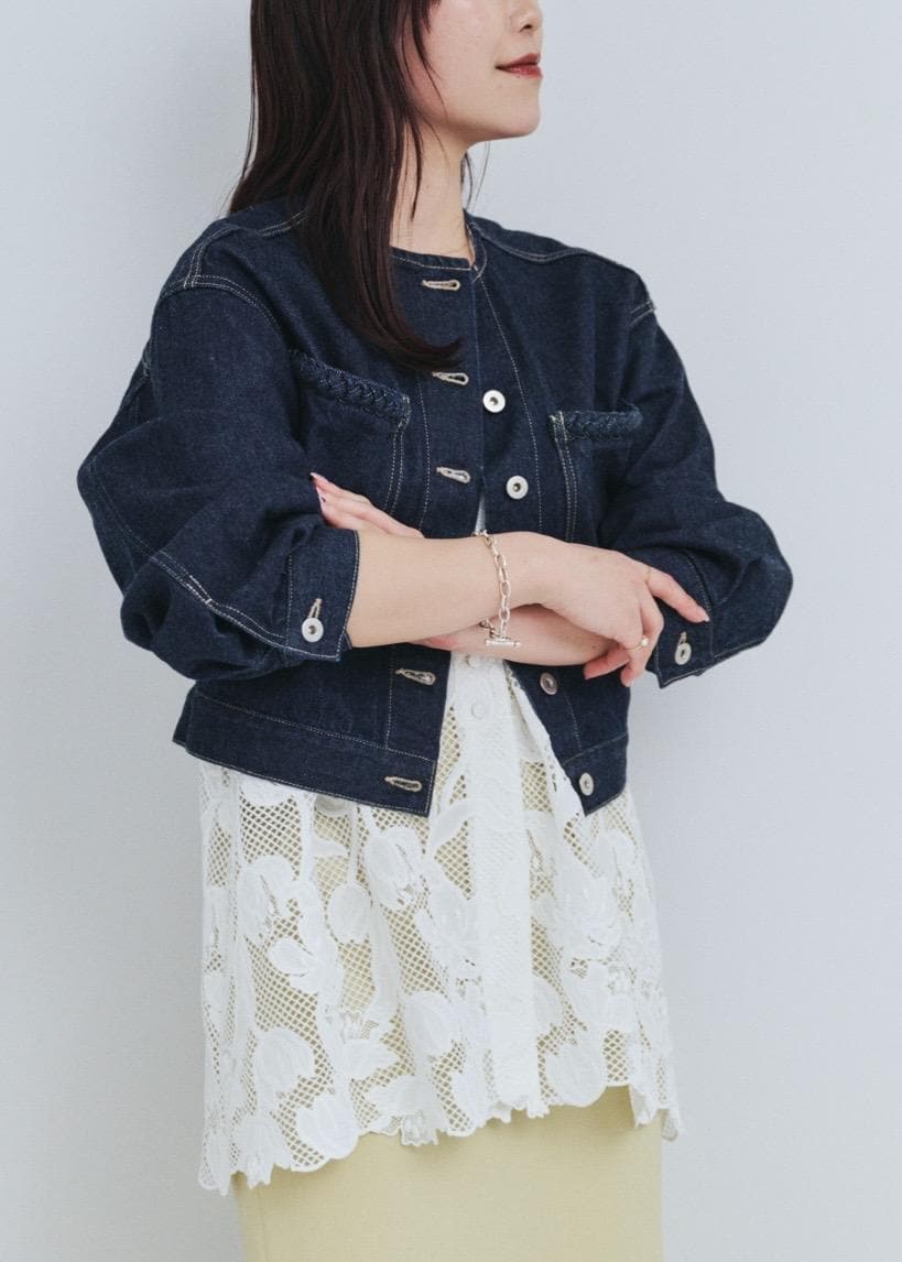 NEW! 予約ROPÉ【KUROKI(クロキ)】ノーカラーデニムジャケット/イージーケア・セットアップ対応ネイビー / F¥39,600レビュー着丈は骨盤辺りまでの短丈でウエスト位置が高く見え、スタイルアップ効果があります。