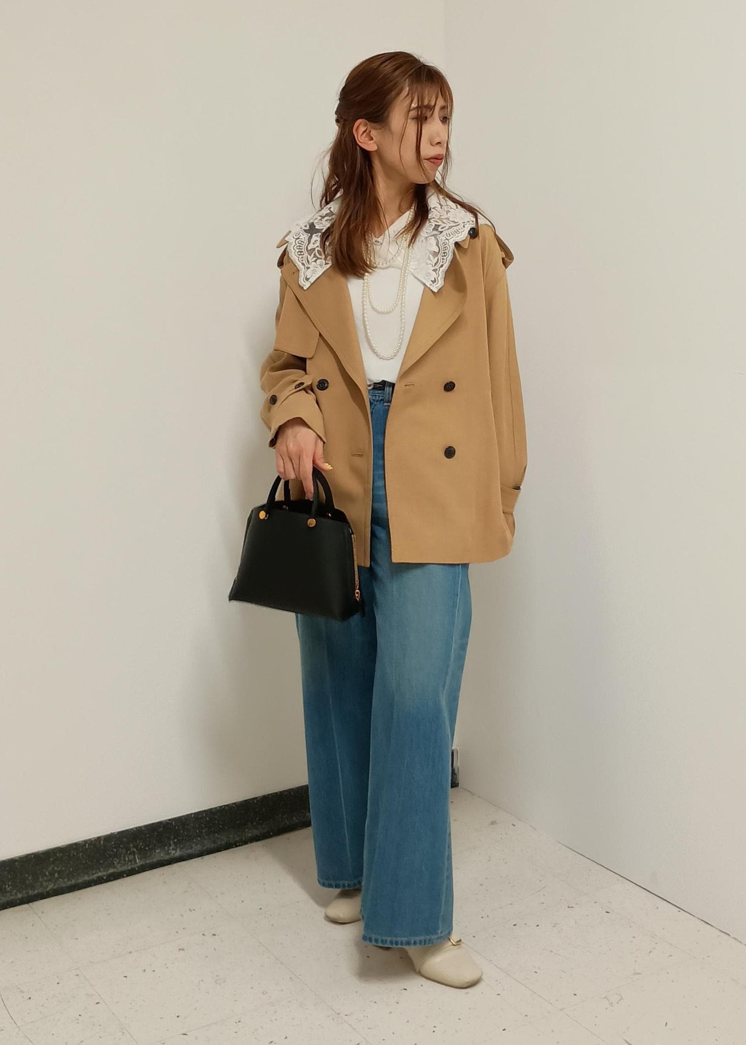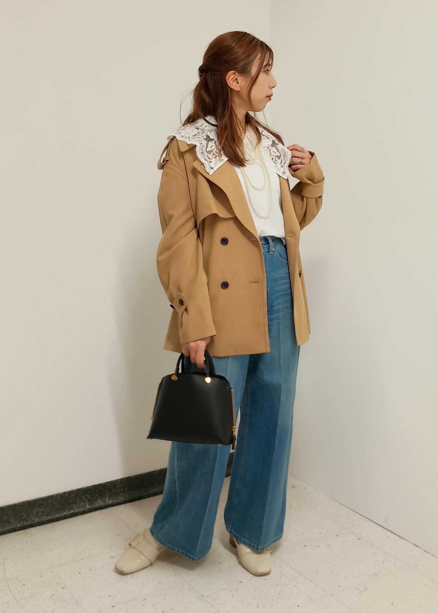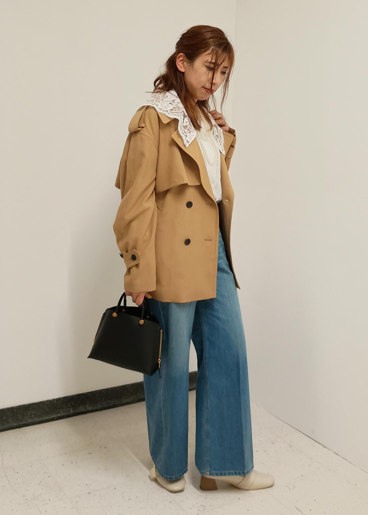 春らしい明るいカラーのデニムセットアップは、それぞれ別々に着回しも効くのでワンセットあれば長く楽しめます!大きな襟を出して着るのは今年っぽくトレンド感があります!