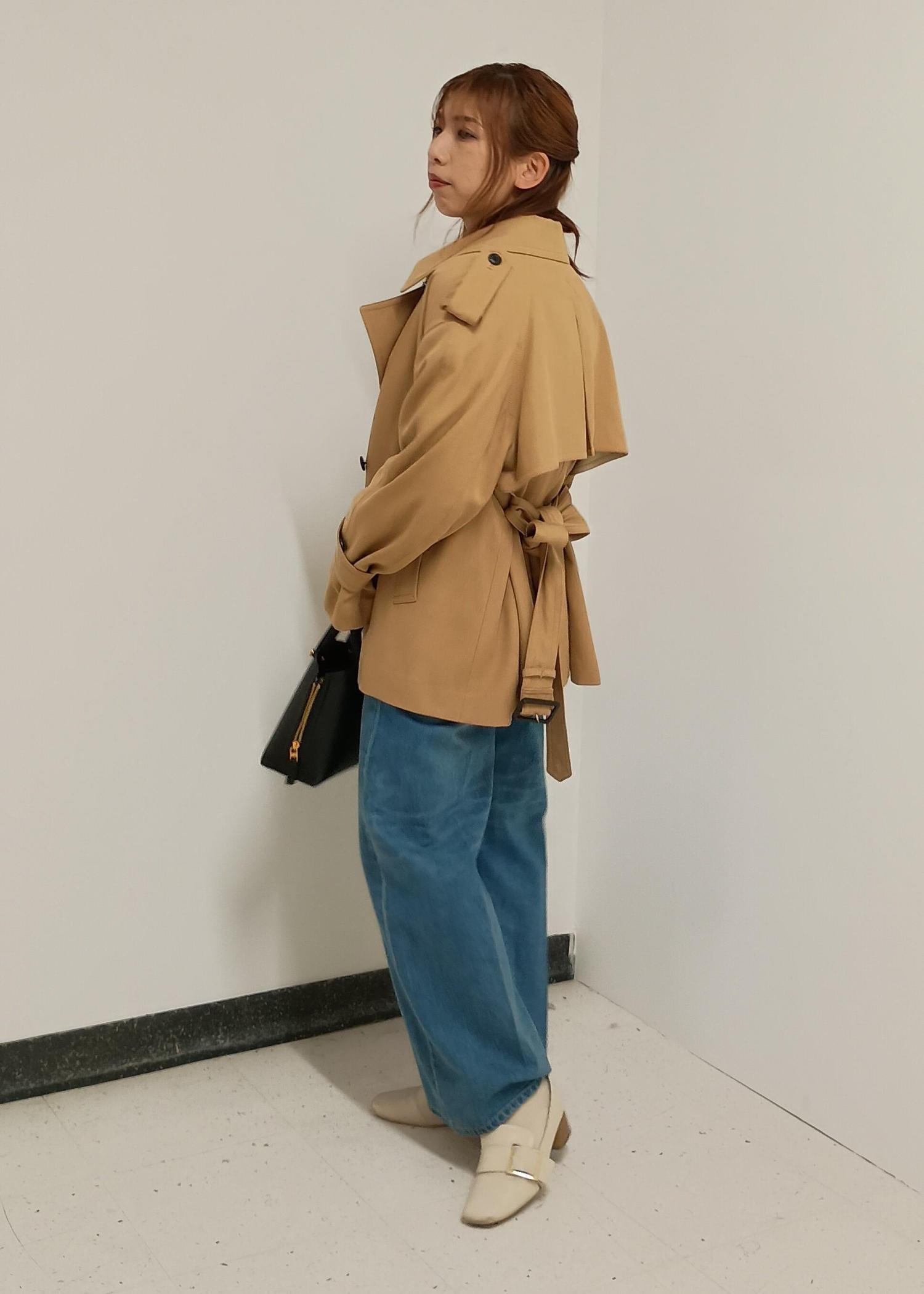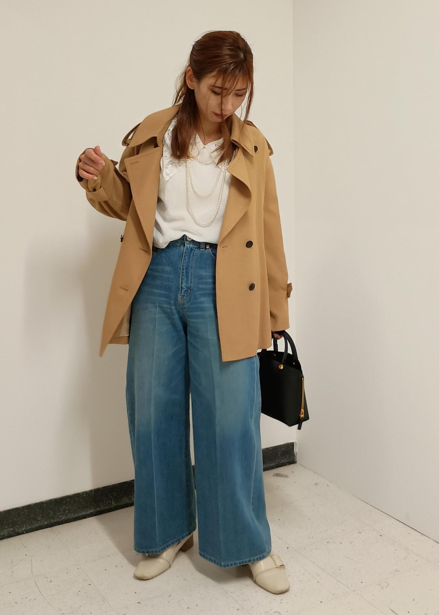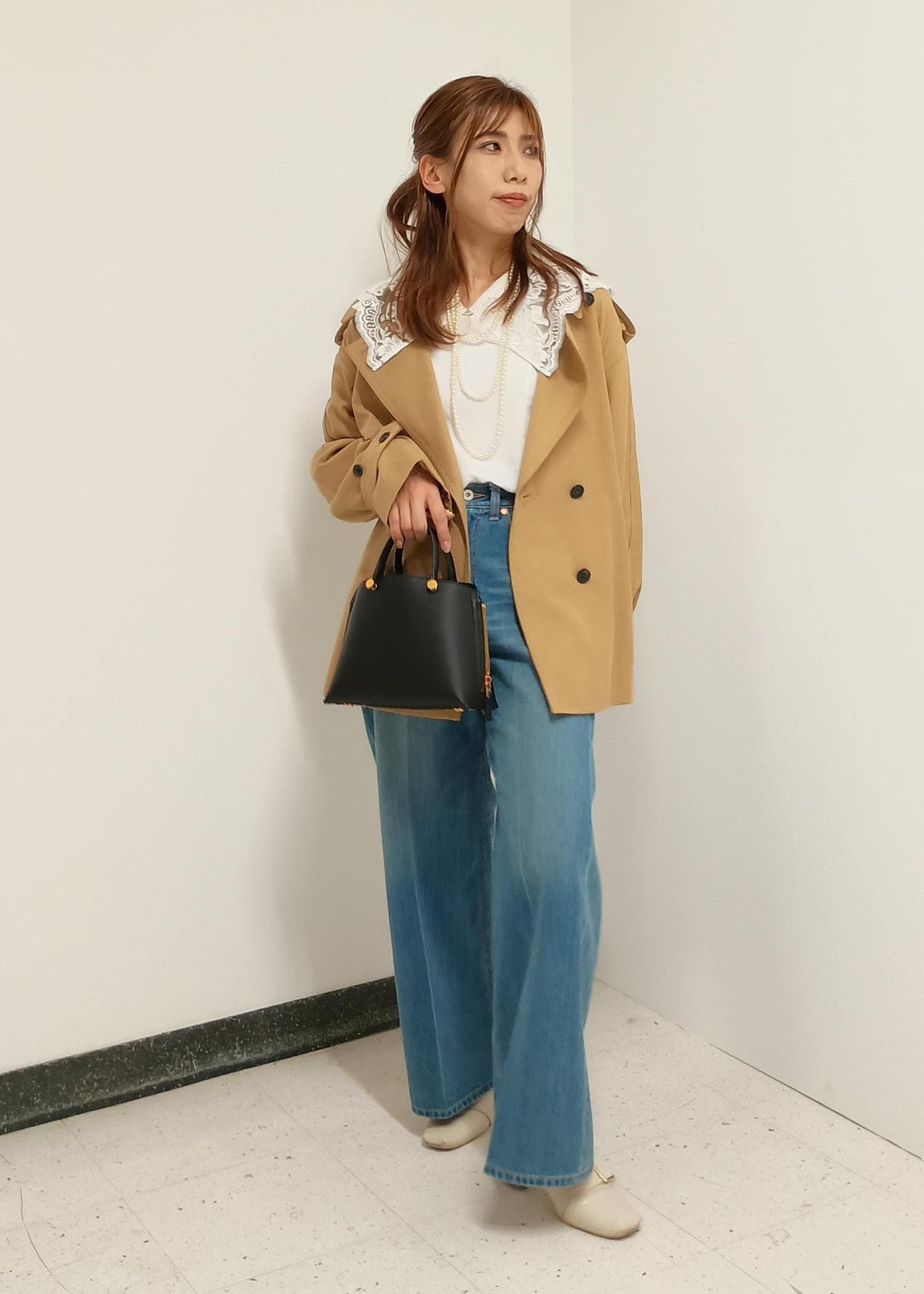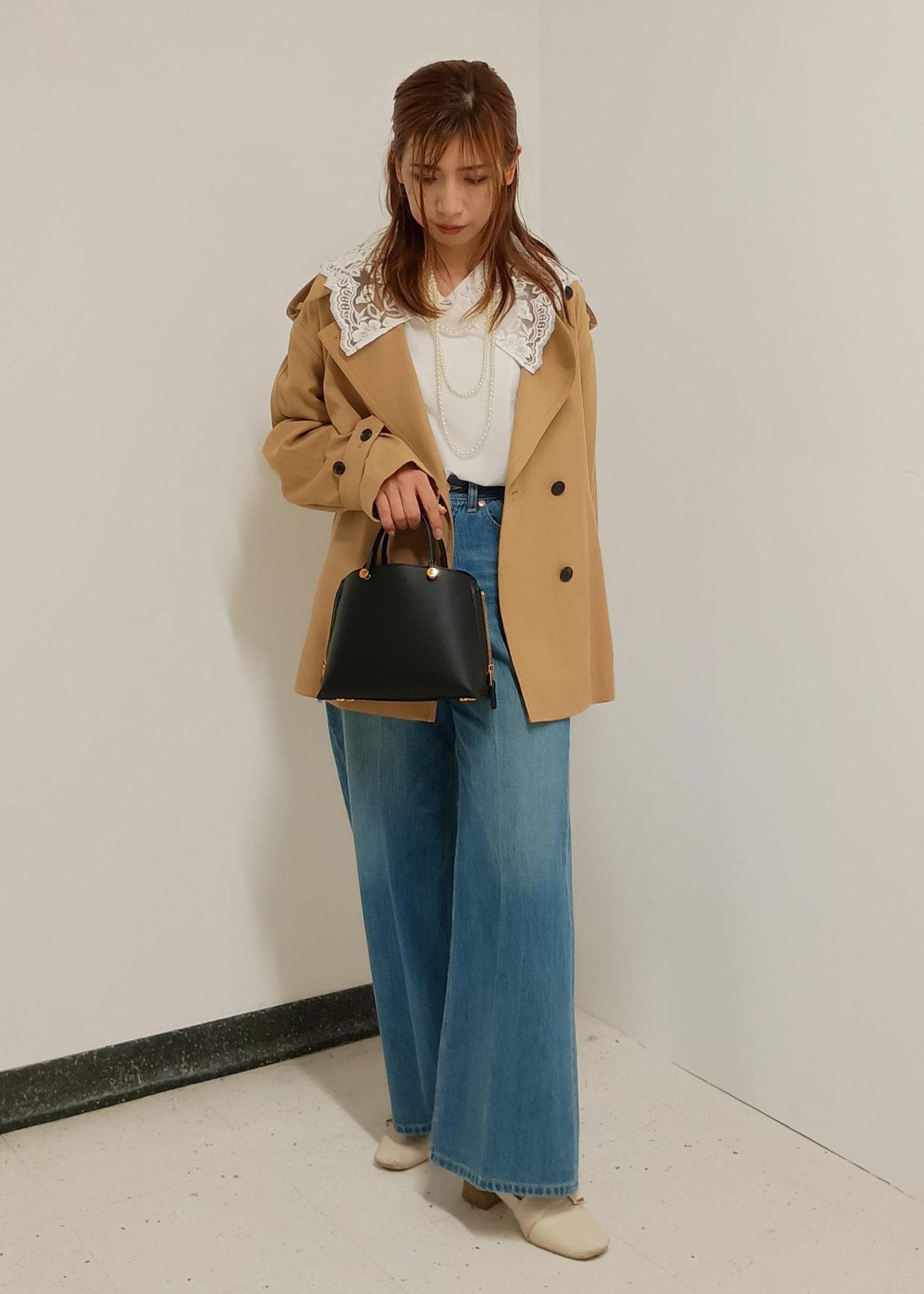 春らしい明るいカラーのデニムセットアップは、それぞれ別々に着回しも効くのでワンセットあれば長く楽しめます!大きな襟を出して着るのは今年っぽくトレンド感があります!