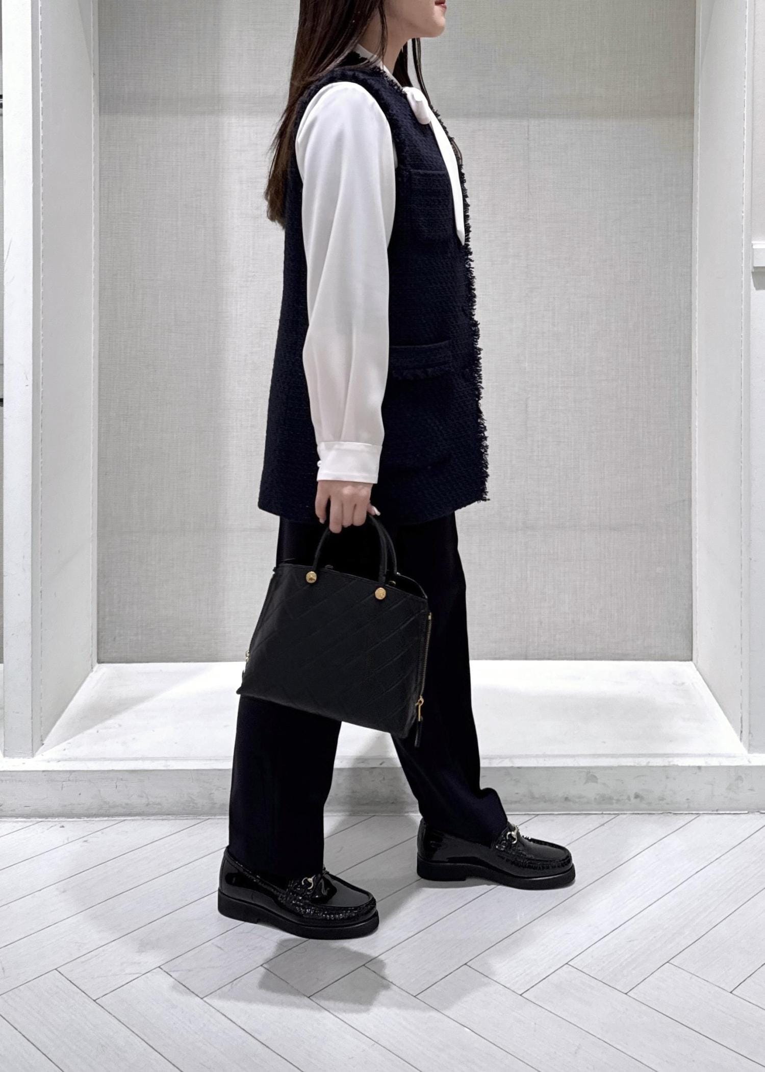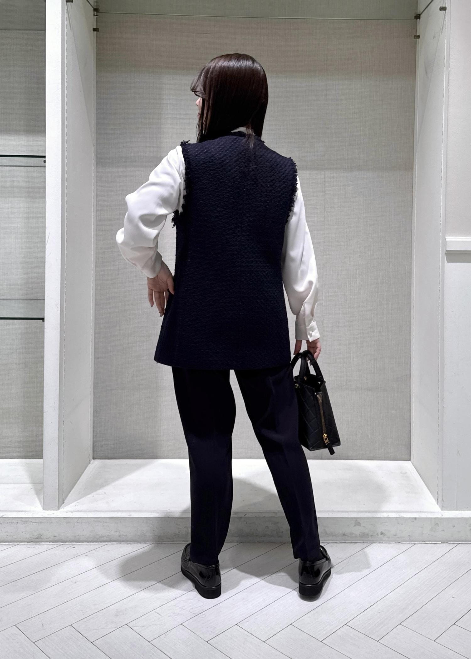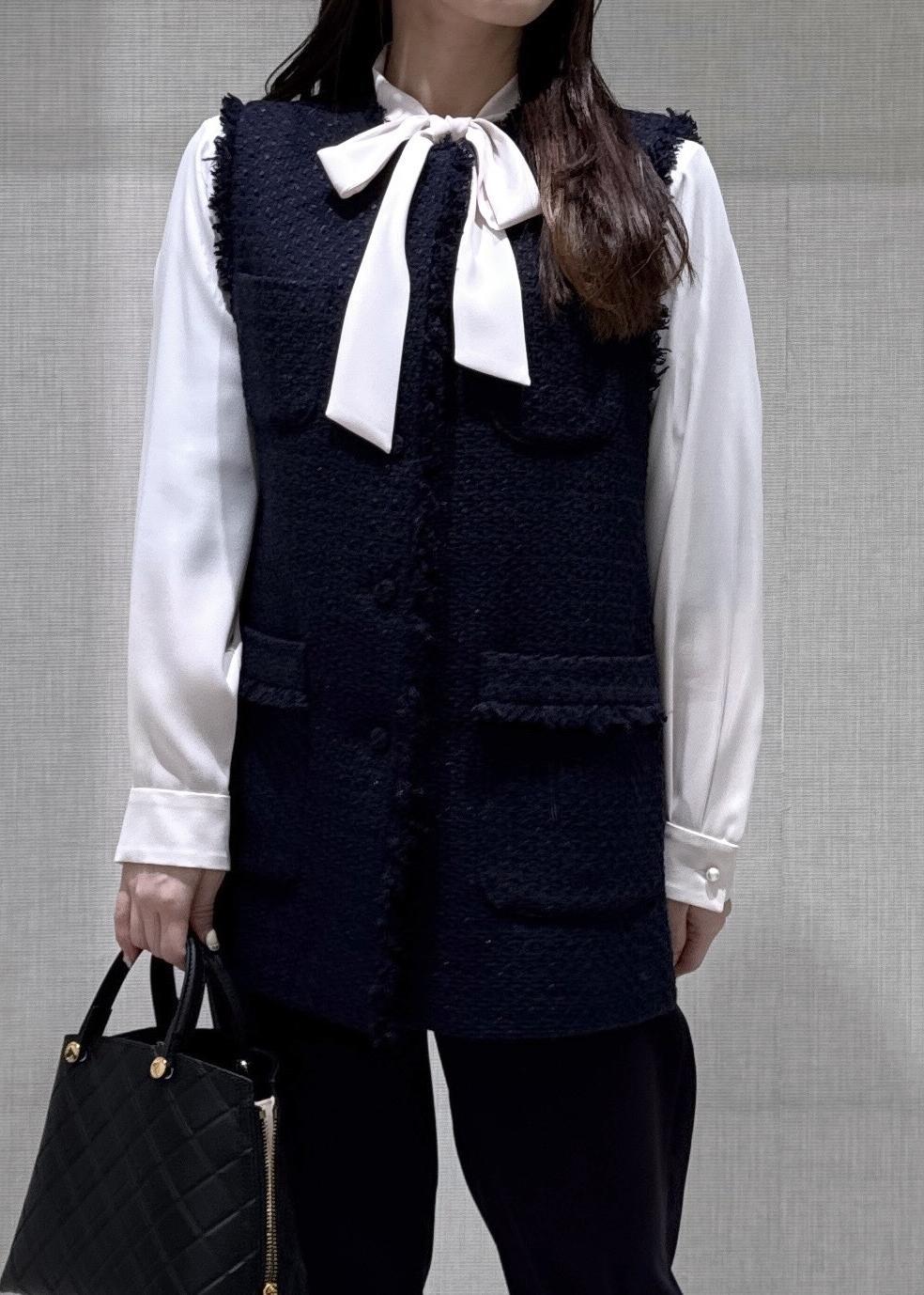 ROPÉミックスツイードジレベスト/26SSネイビー / F¥39,600レビュー身長150cm、フリーサイズ着用で、ヒップが隠れるほどの着丈です。程よいゆとりがあるのでボリューム感のあるブラウスとの相性も良いです◎セレモニーにも普段使いにも着用できて幅広い場面で活躍するアイテムです。