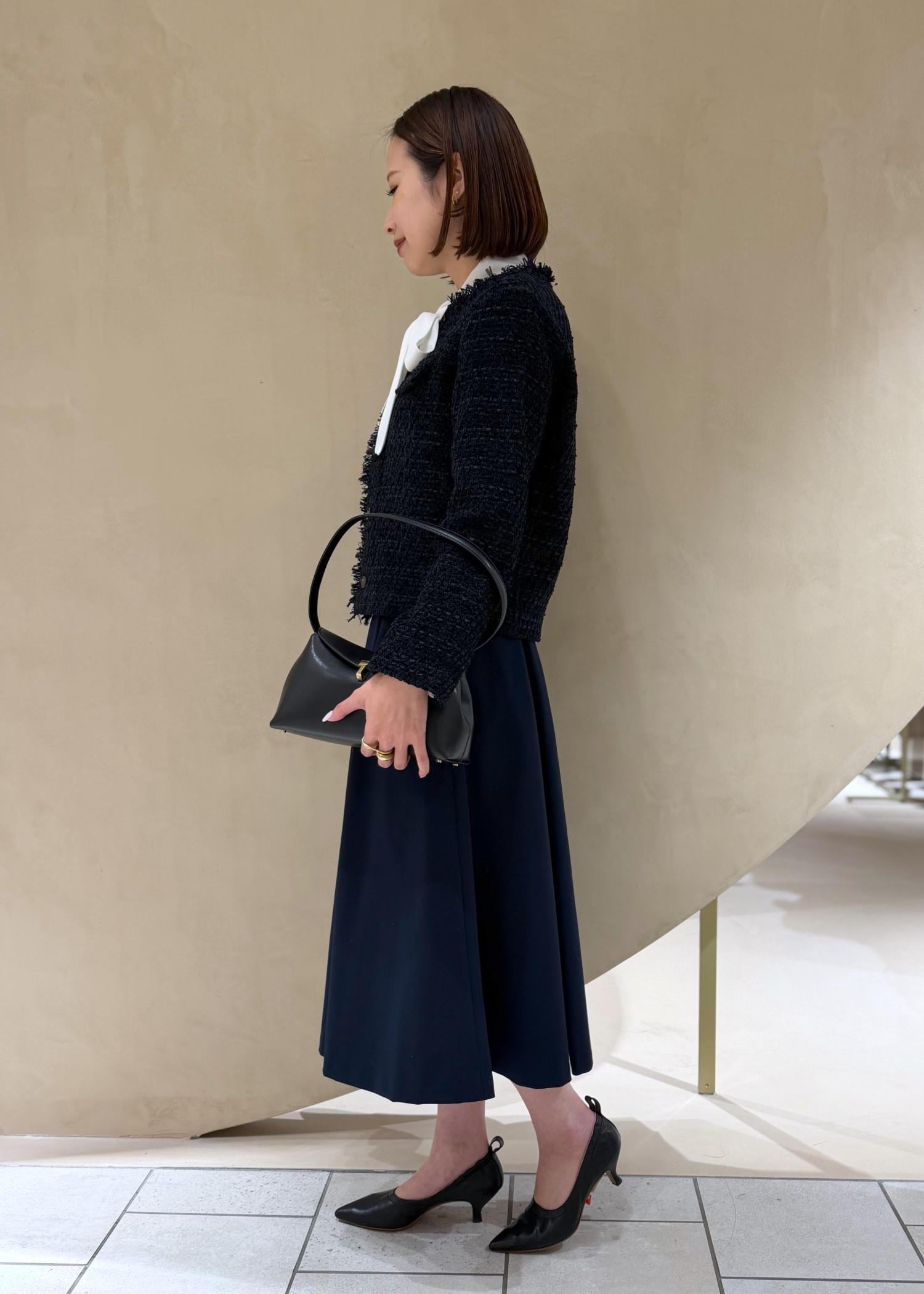 華やかさをプラスしたかったのでボウタイブラウスをインナーに合わせリボン結びに。