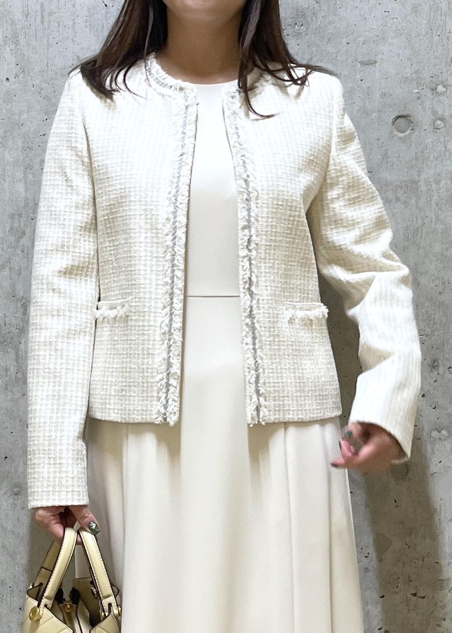 白のツイードジャケットと、ベージュのワンピースで明るめカラーでまとめた入学にオススメのスタイルです。