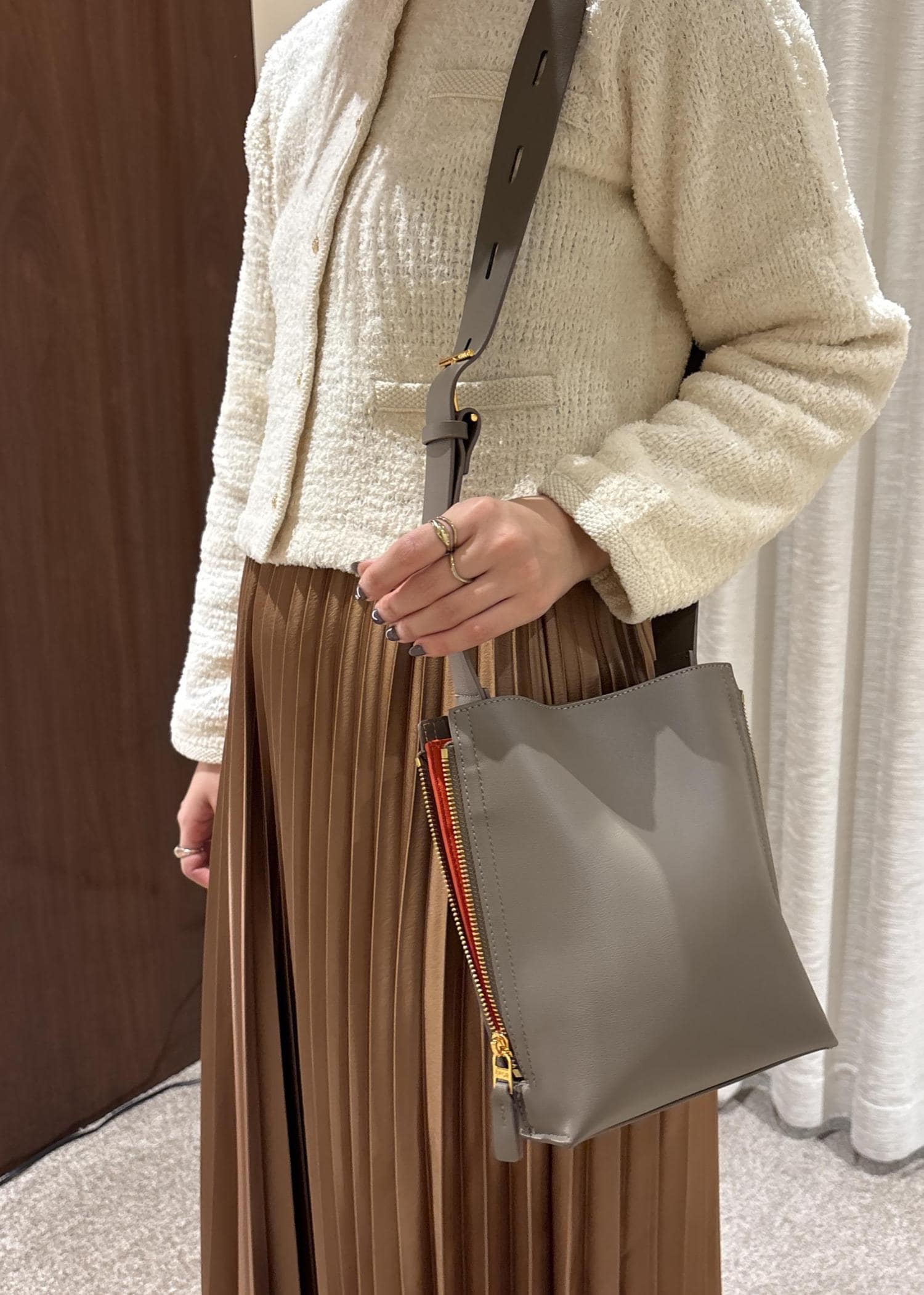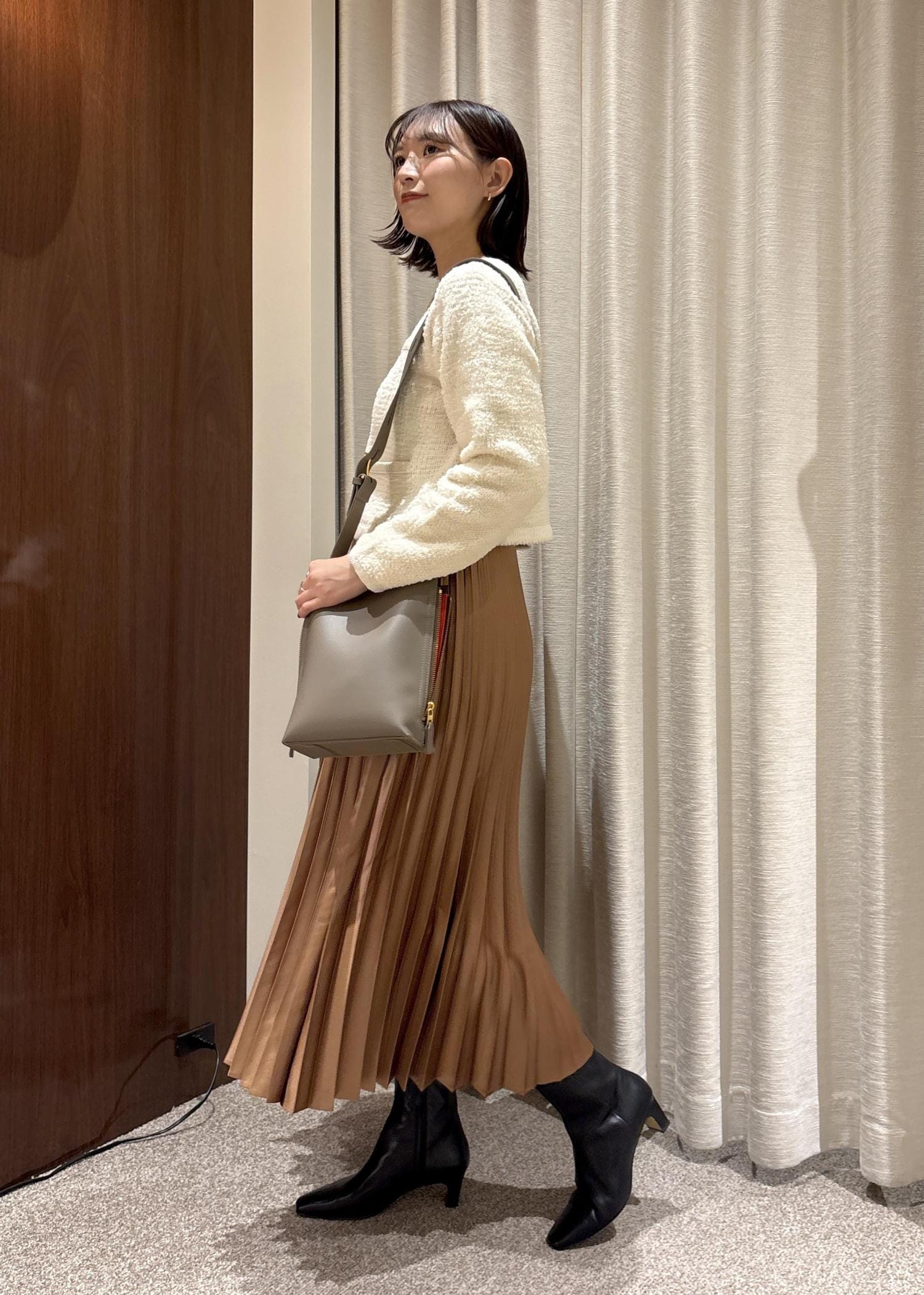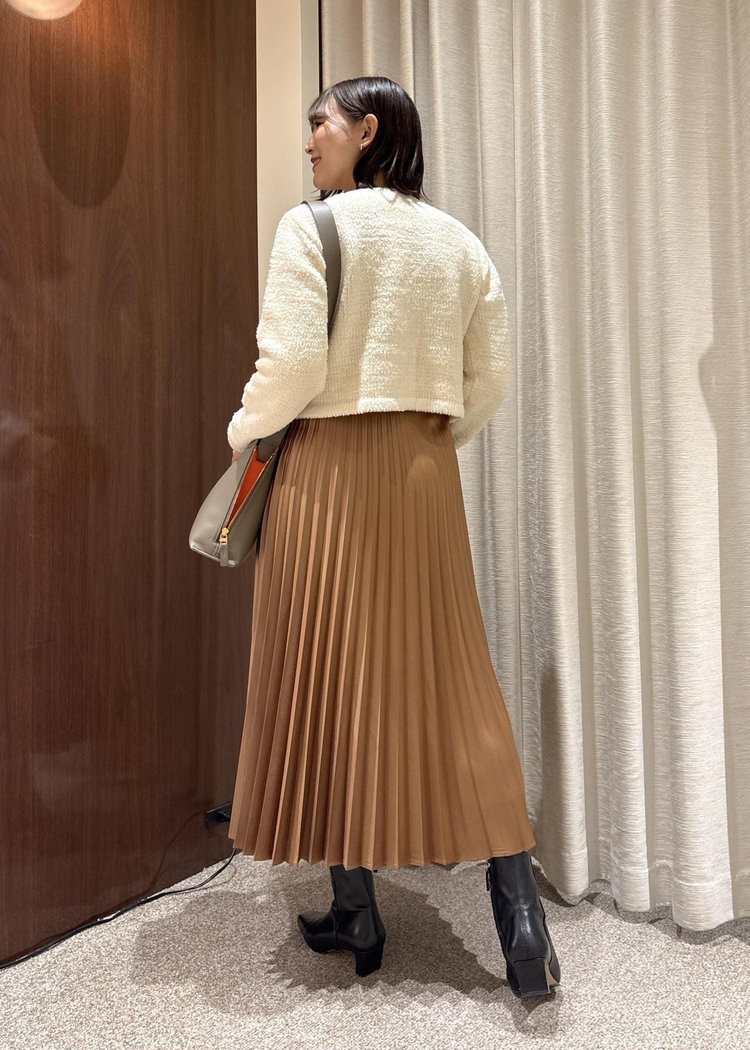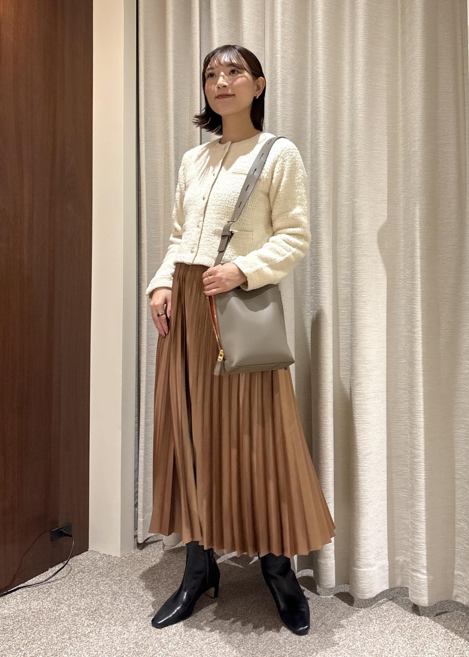 着丈は短めなので、長いボトムやワンピースに合わせていただくとバランス感良くご着用いただけます。 -