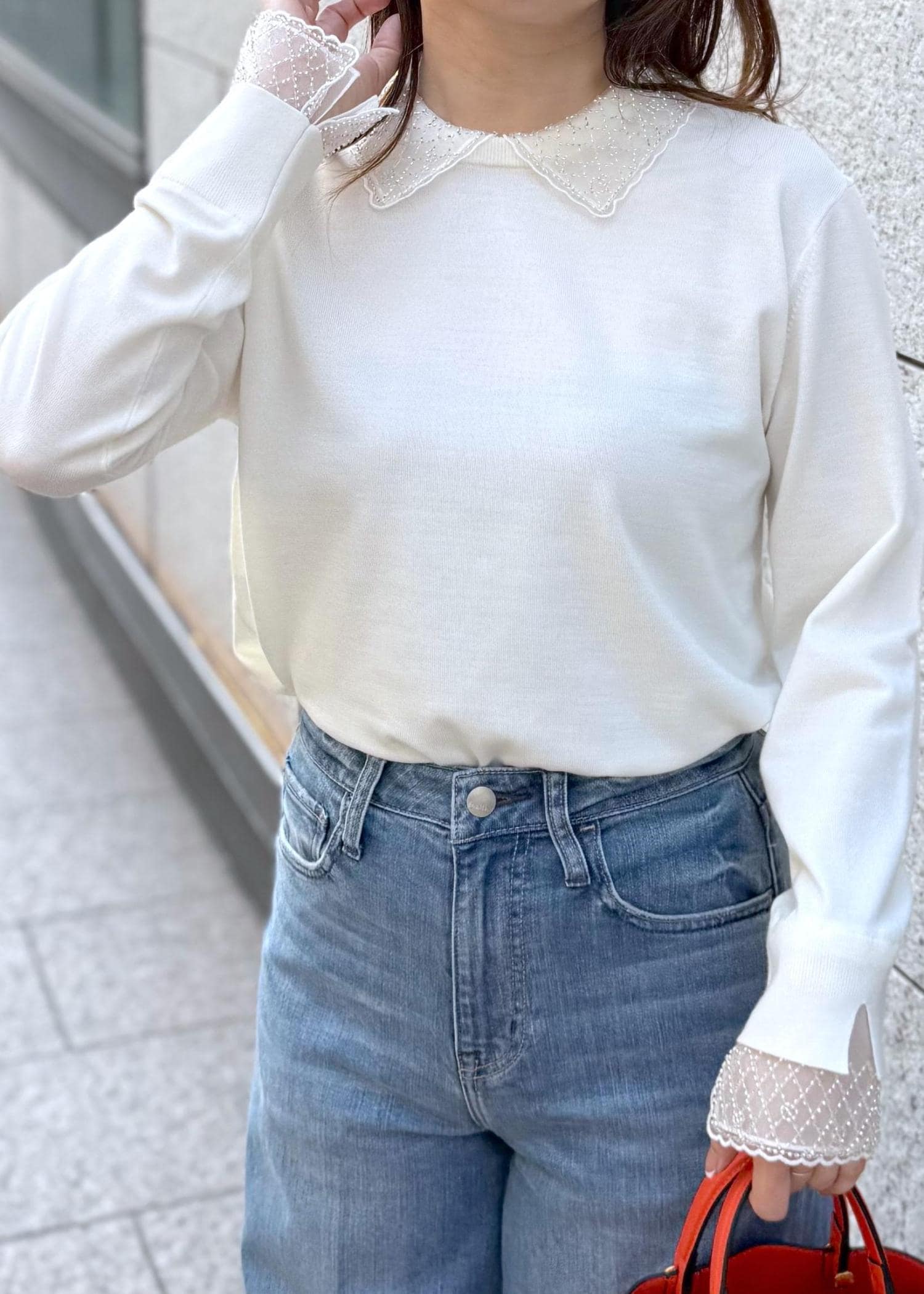 ROPÉビジューレース襟ニットプルオーバー/イージーケアオフホワイト / F¥28,600レビュー身幅や袖周りはやとりがあり、体のラインを拾いにくいサイズ感です。
