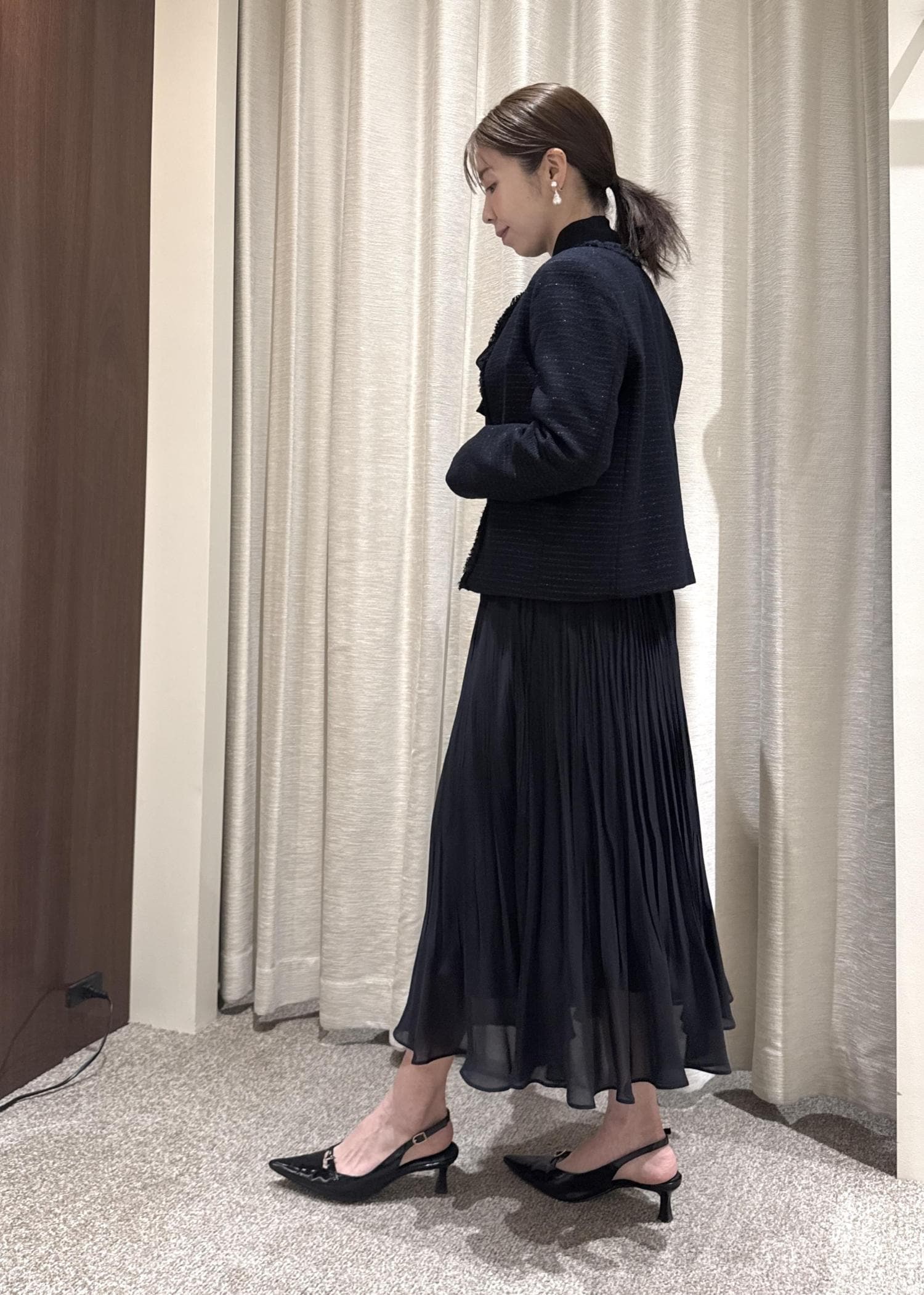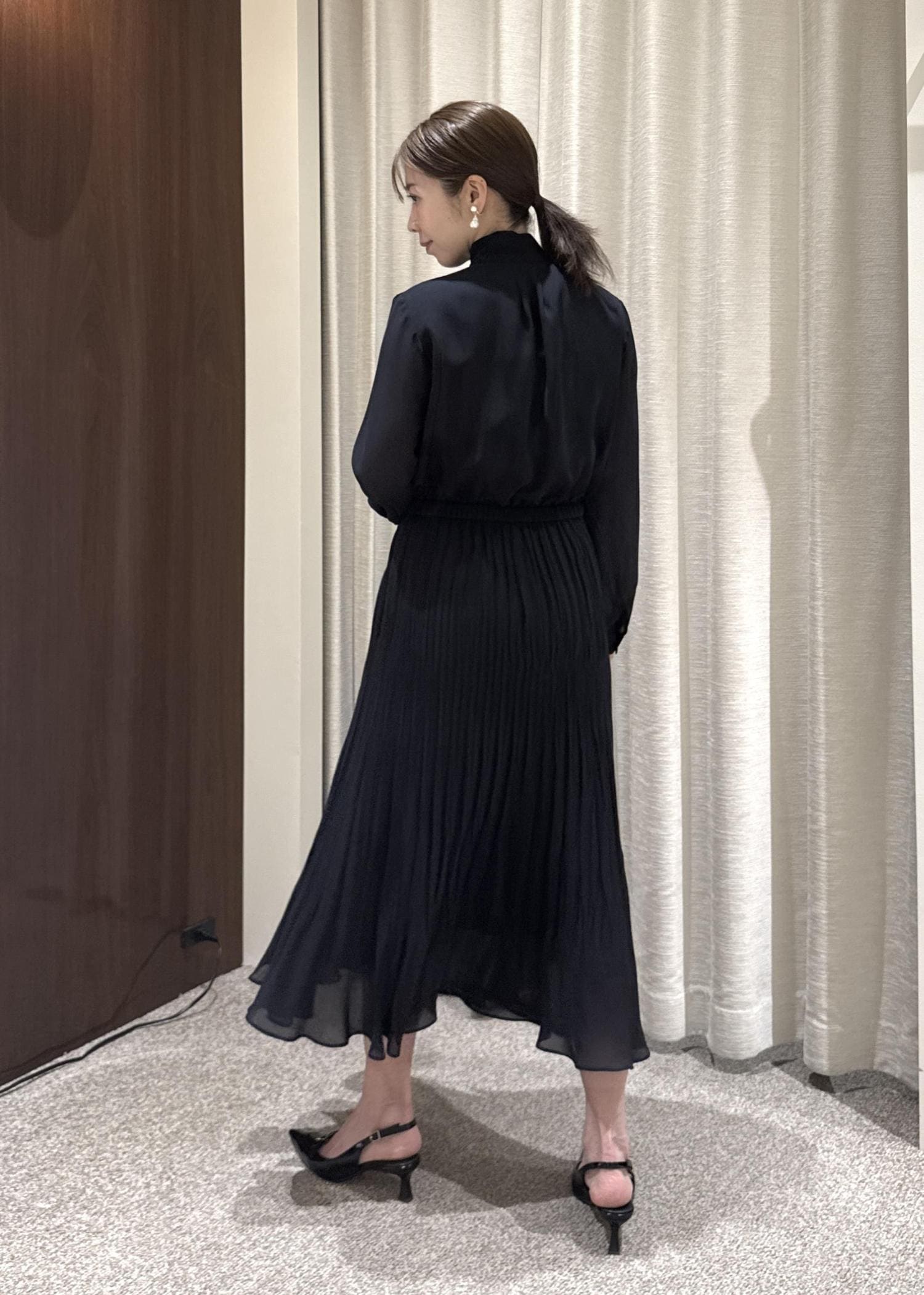 ROPÉジョーゼットシフォンプリーツワンピース・25AWネイビー / 36¥49,500レビュー着丈はふくらはぎが隠れる感じですが、裏地が少し短めになっているので155㎝の私が着ても長過ぎる感じはしませんでした。ウエストゴムで切り返しになっていて、スカート部分はプリーツが入っていますがボリューム感が出ないのでスッキリと着ていただけます。
