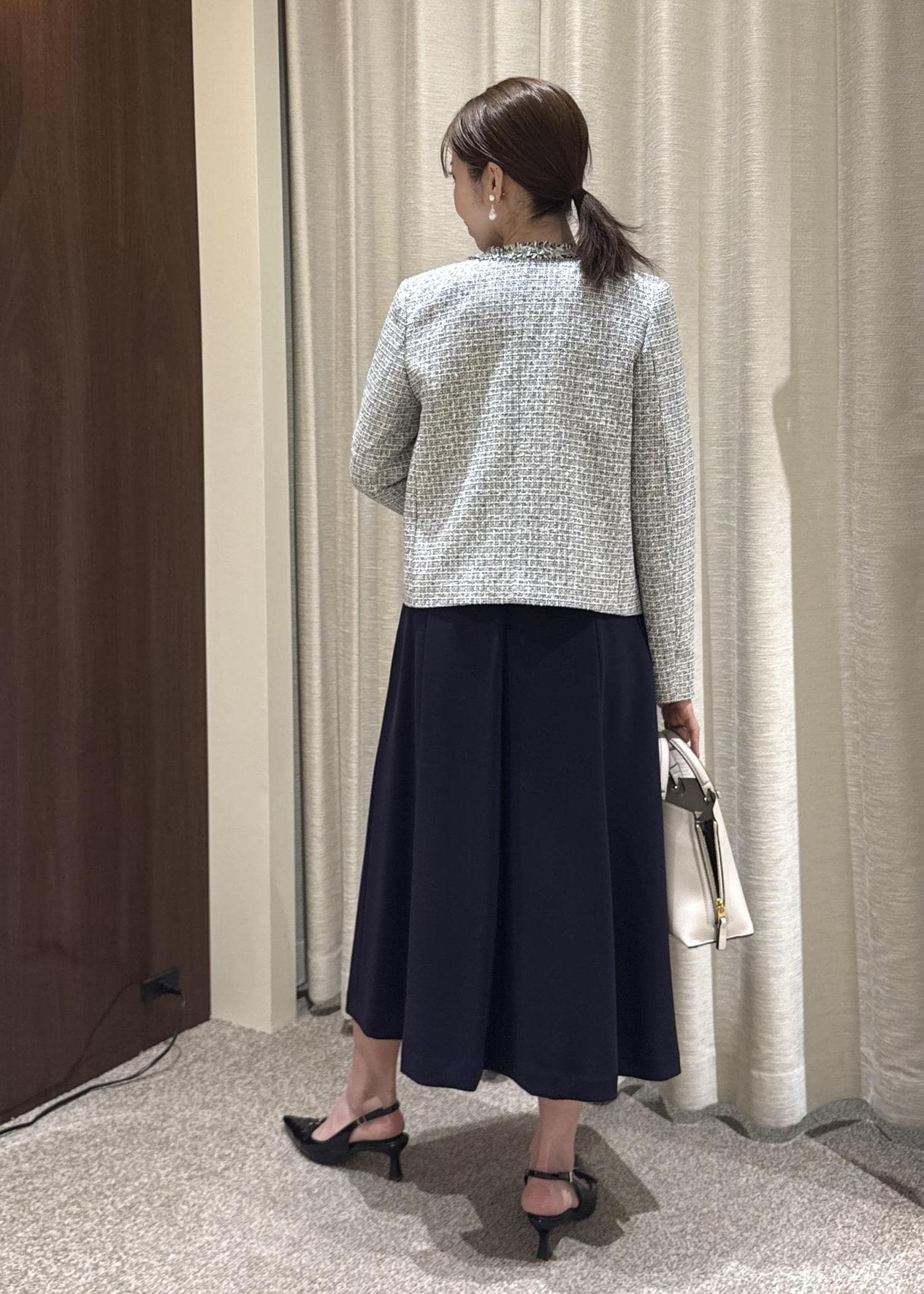 ツイードジャケット×フレアワンピースで、きちんと感と女性らしさを両立。