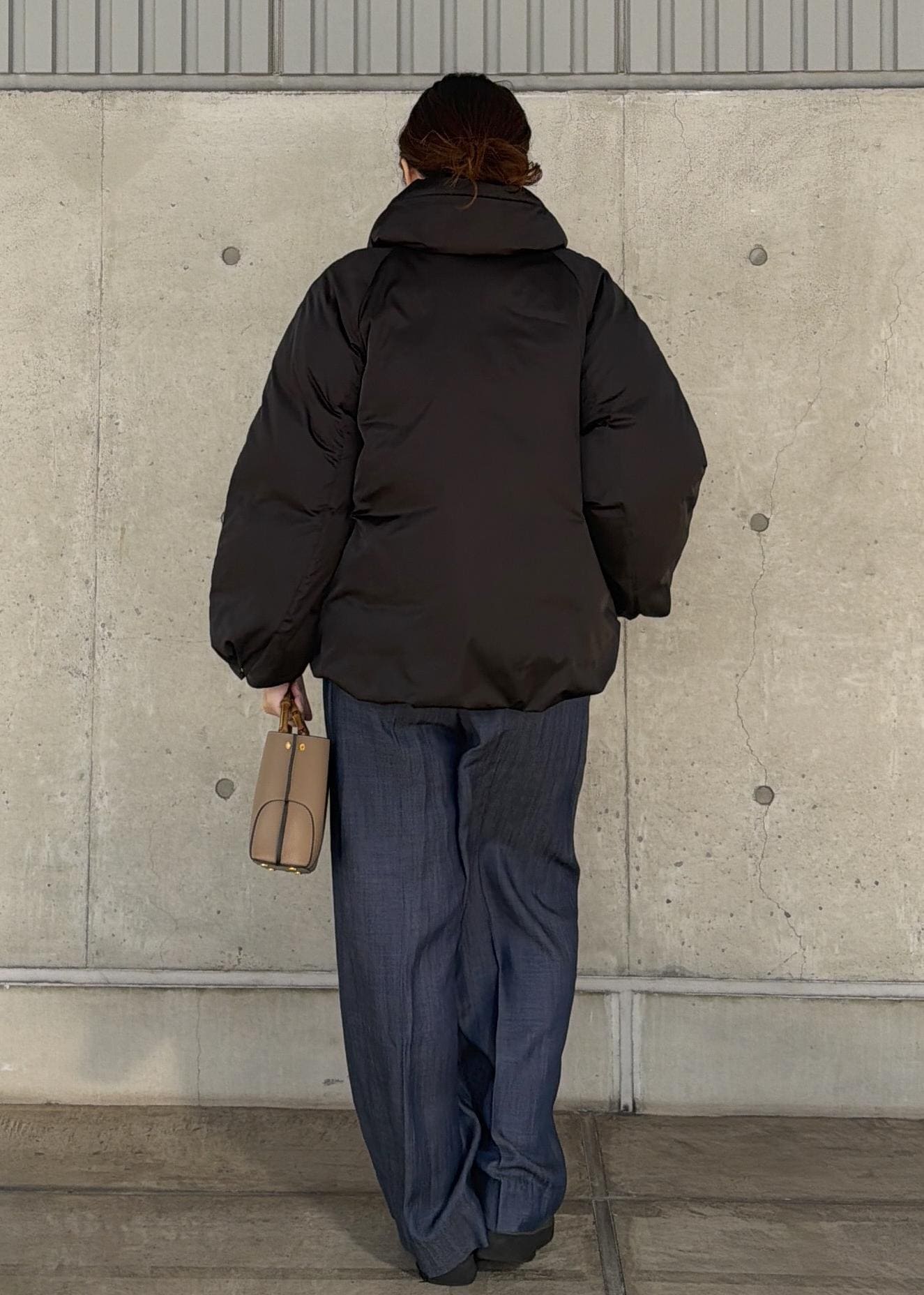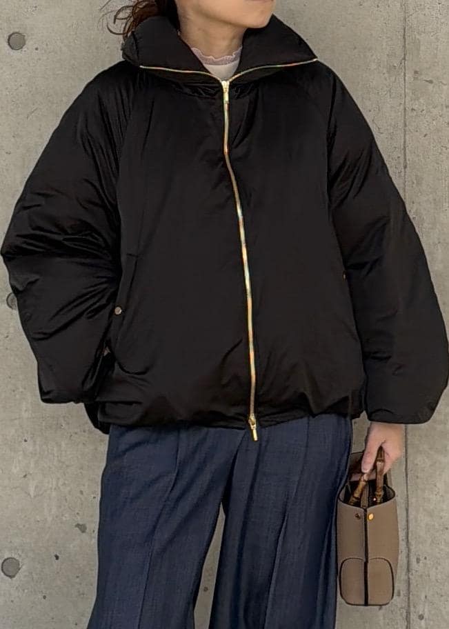 全体的にオーバーサイズのショート丈ダウンです。インナーに厚手のニットやドルマンスリーブのアイテムも着込めるサイズ感です。裾を絞ることが出来るのでお好きな分量感に調整することができます。ショート丈なので電車移動など座っての長時間移動でももたつきません。 -