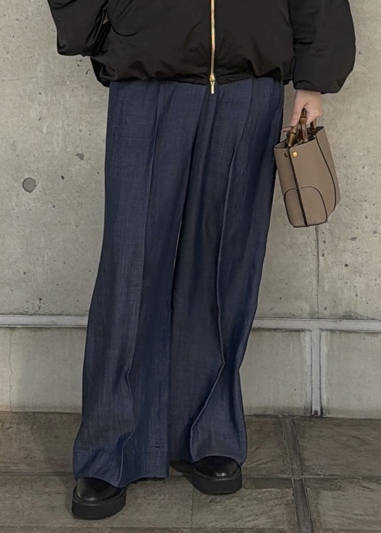 落ち感のあるテンセル100%素材のデニム。軽さと程よいツヤ感があり、カジュアルになりすぎずきれいめにも着用できます。ウエストゴムで楽してきちんと見えするので毎日履きたくなるような、ストレスフリーな1本です。 -