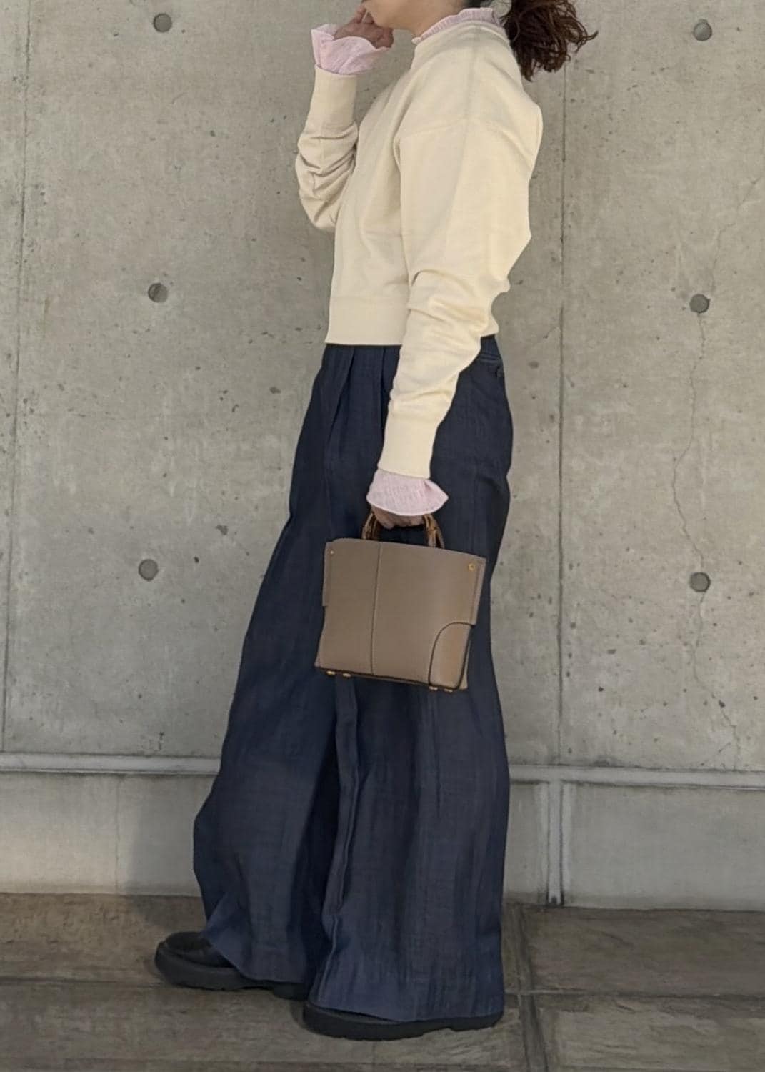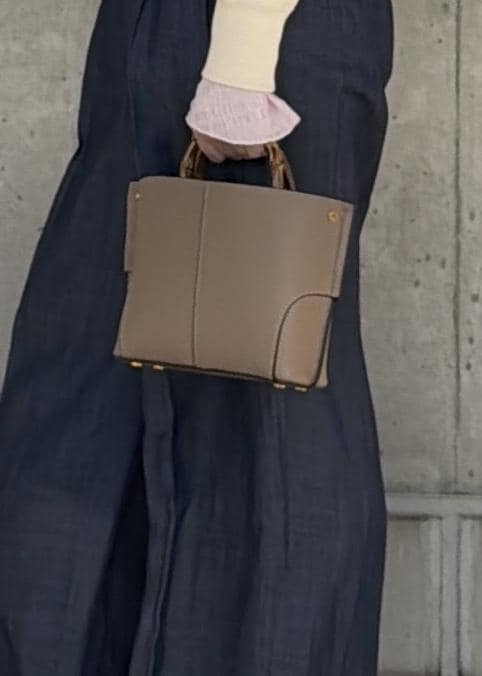 バンブーハンドルと、取り外し可能な付属ショルダーの2WAYの持ち方が可能で洋服に合わせて持ち方を変えていただけます。底鋲付きでしっかりと自立するのも嬉しいポイントです。